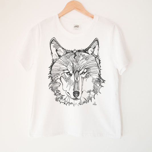 Wolf Face in White Negative Kennedy Lake Ladies Organic Cotton Tee