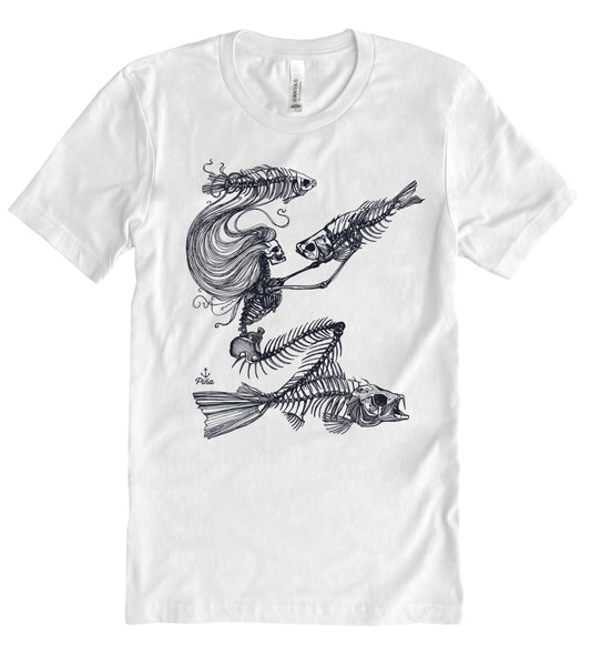 Skeleton Mermaid in White Ink Unisex Cotton Jersey Tee