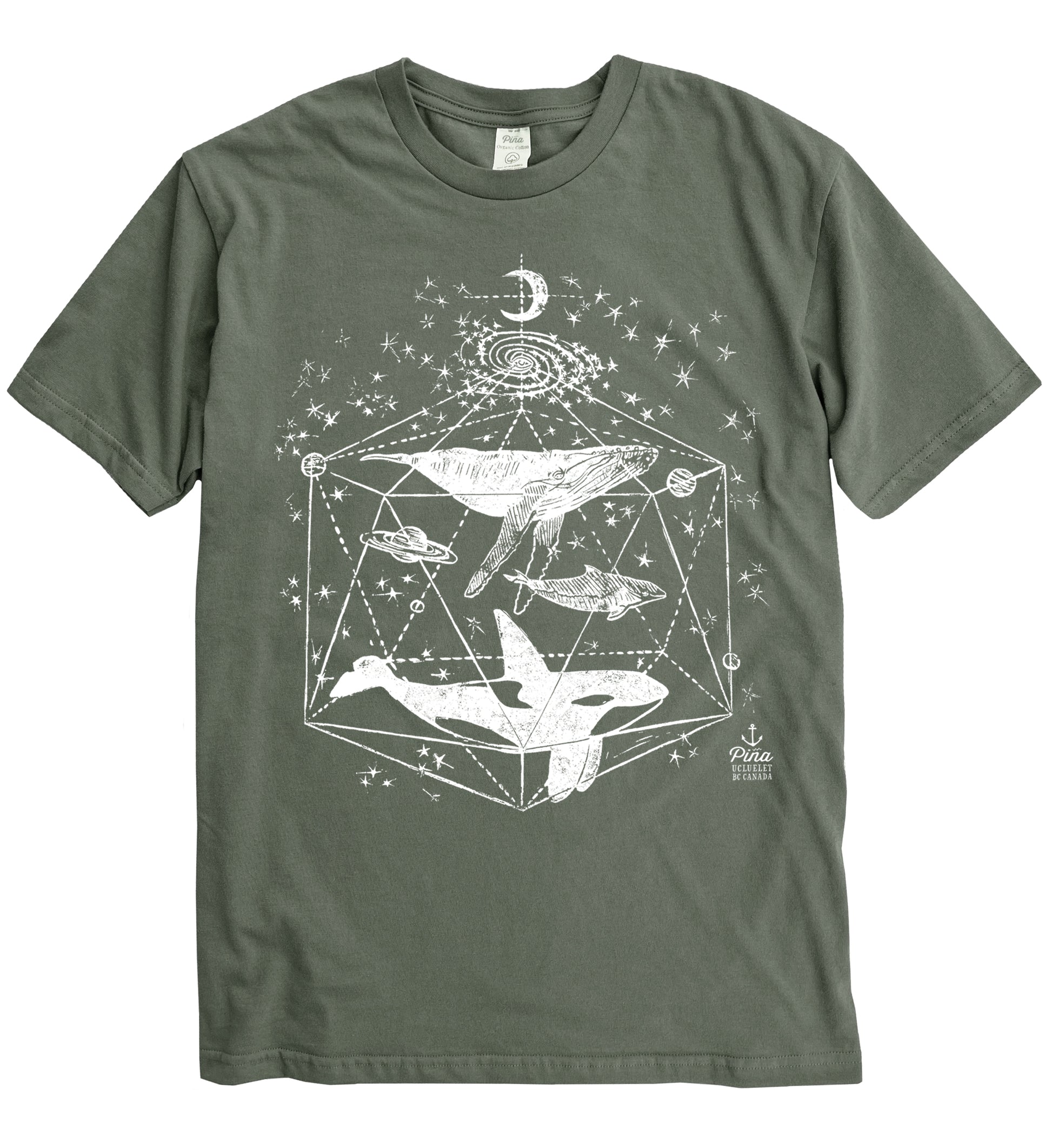 Our Galactic Whales design printed in white ink on the front of a 100% organic cotton unisex tee. This crewneck t-shirt is soft and comfortable with a flattering fit. Each shirt is made in Canada then custom printed by us in Ucluelet, just for you!