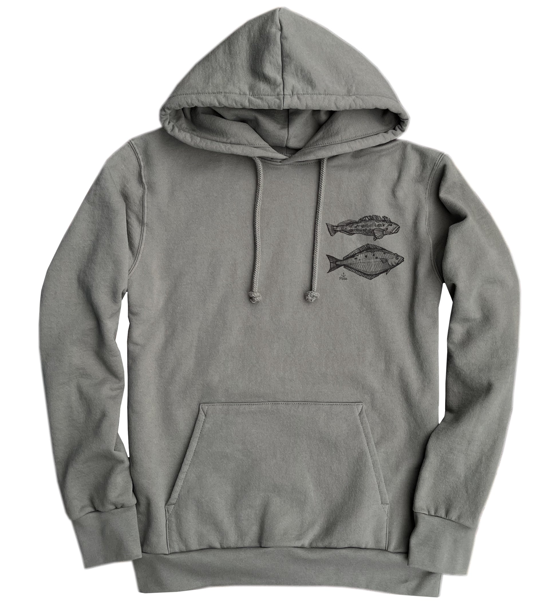 Our Birth of Venus - Westcoast style printed on the back of a soft and comfy organic cotton hoodie. We've printed a lingcod and halibut on the front chest of the grey sage colour hoodie, or a white anchor on the front of the black hoodie. Please select your colour option below.