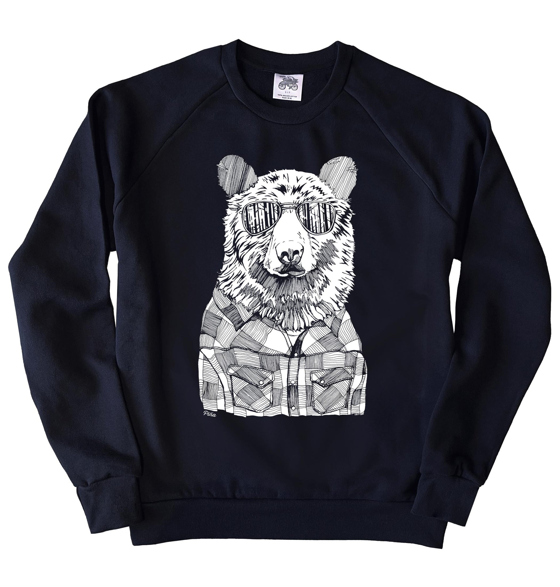 Our Hipster Bear design printed in black ink on the front of a unisex crewneck sweatshirt.