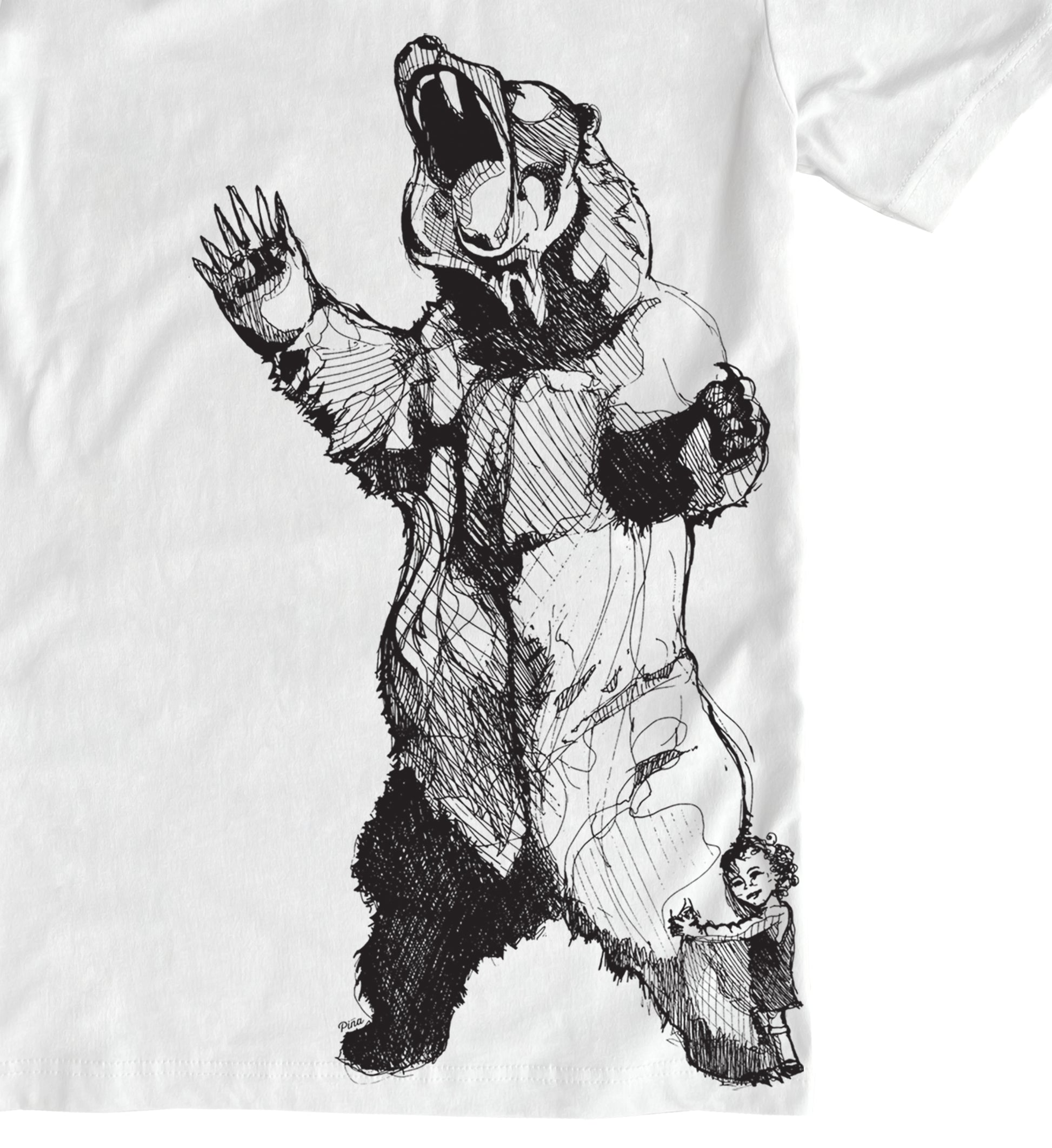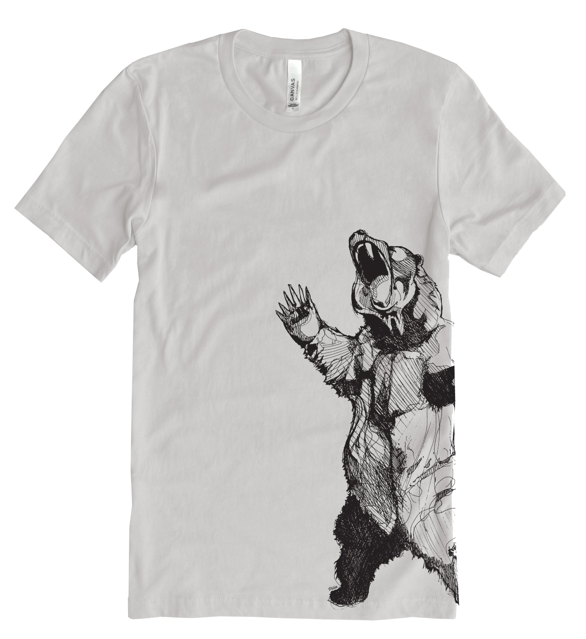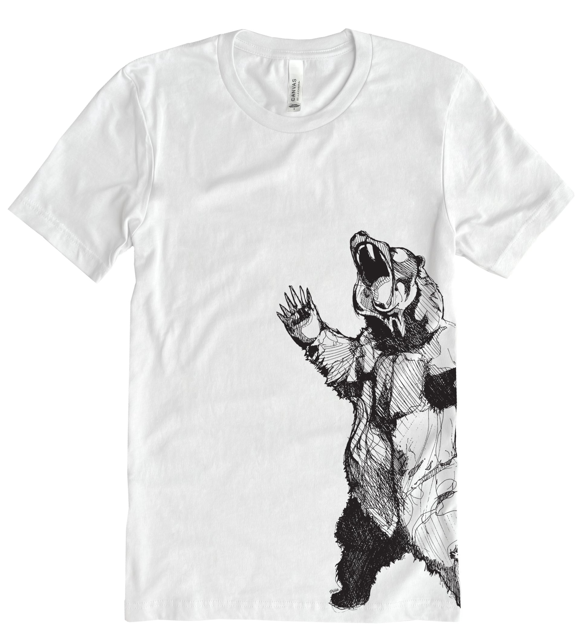 Our Bearhugger design printed in black ink on the front, bottom side of a unisex, cotton jersey t-shirt. This crewneck t-shirt is soft and comfortable and made from 100% cotton. Each shirt is custom printed just for you!
