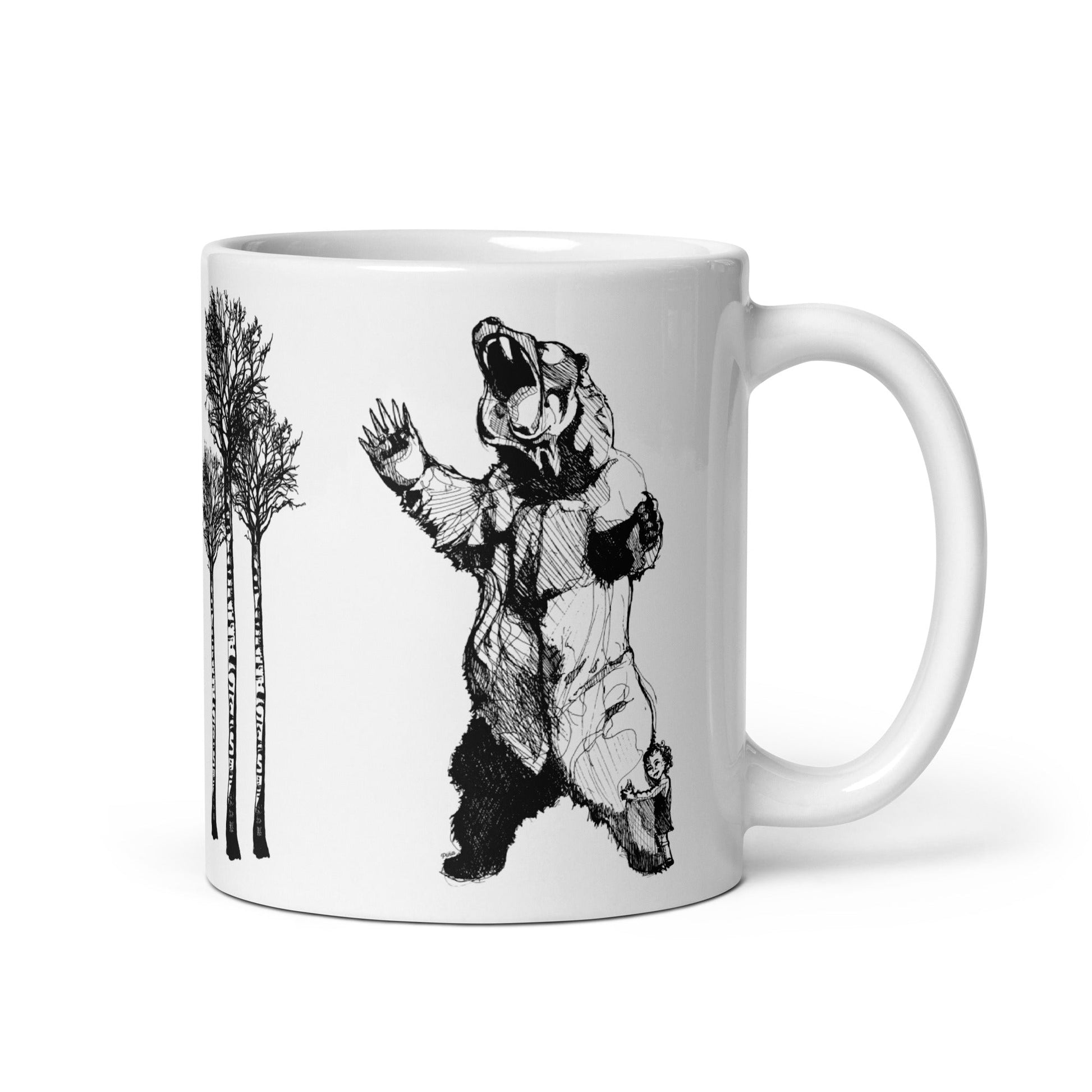 A classic white glossy mug printed with our popular Bearhugger design. Beware the towering grizzly bear with his razor sharp claws and long, gnarly fangs. The only thing that is strong enough to defeat such a beast is love. Printed with birch trees for that woodland ambiance. A warm hug for a nice bevy.