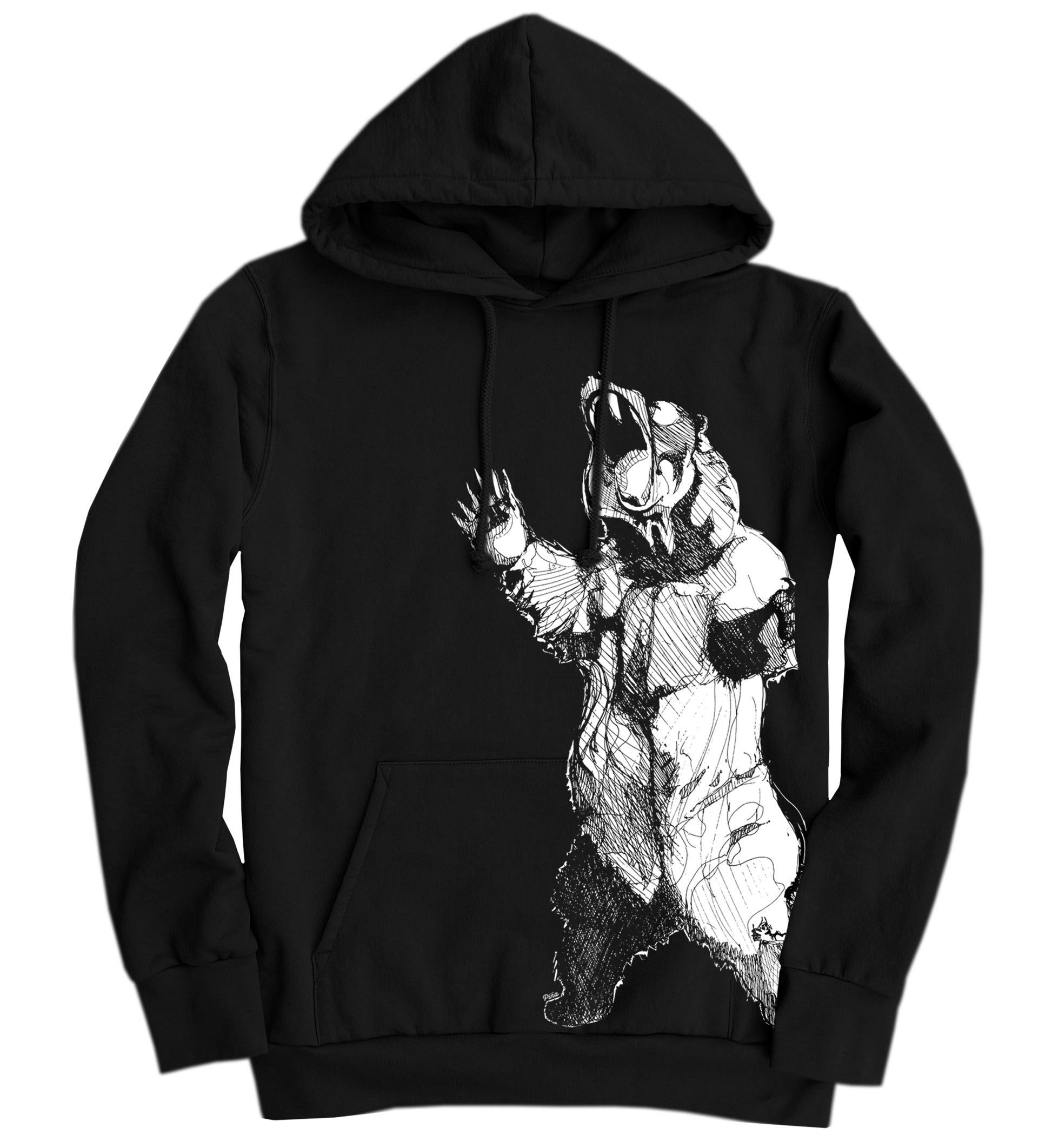The Bearhugger design printed in white ink on a soft, washed black, organic cotton hoodie.