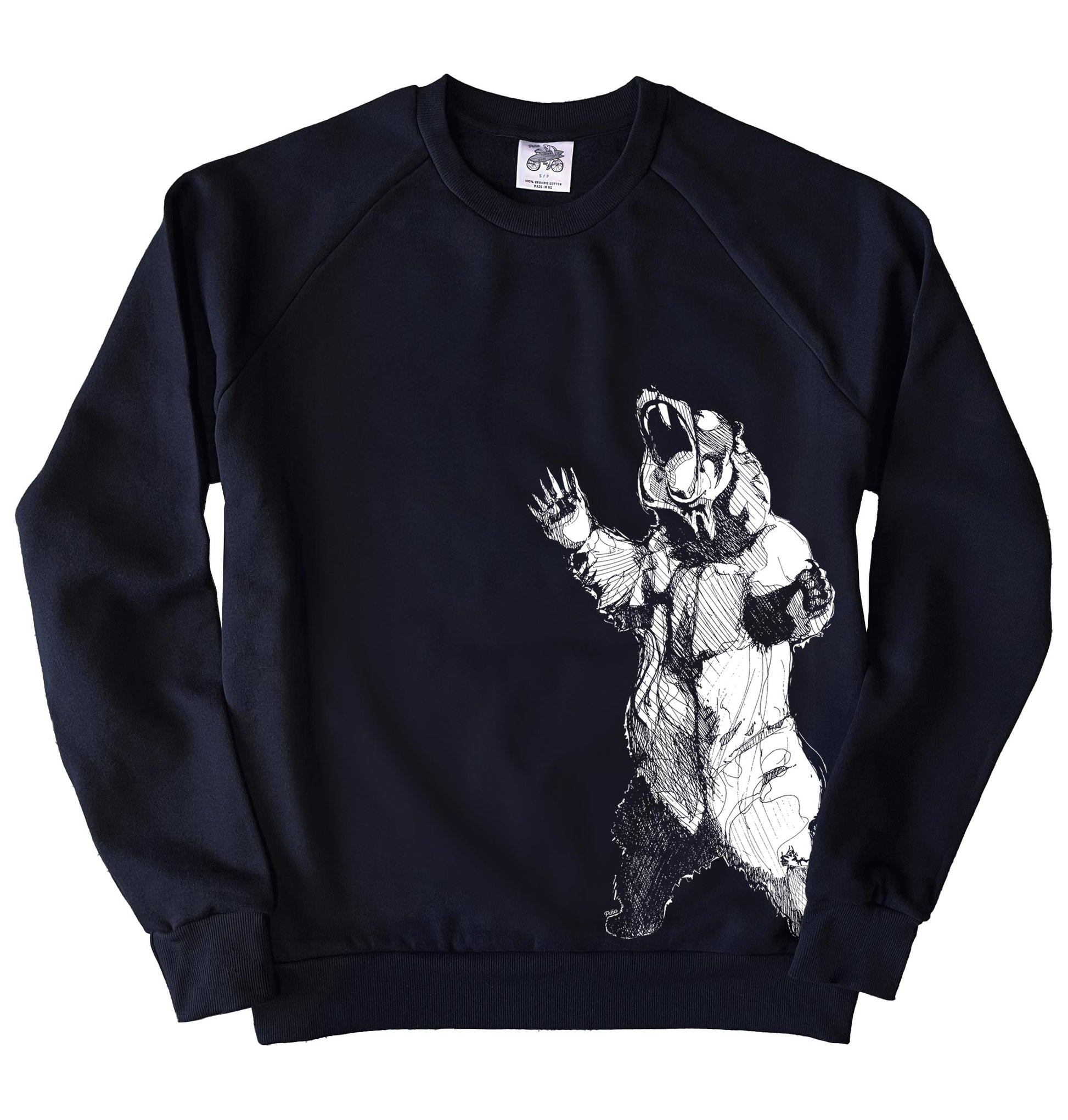 Our detailed Bearhugger design printed in white ink on the front, side of our unisex crewneck sweatshirt.
