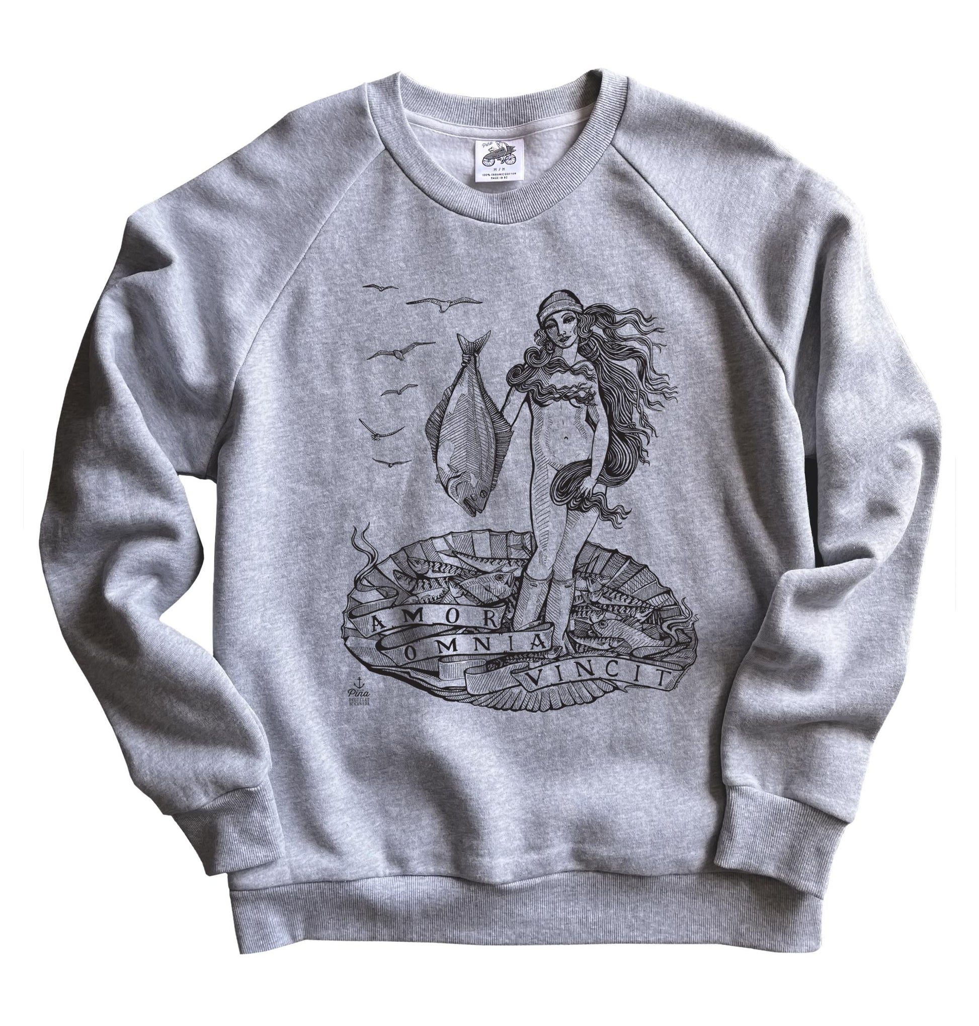 Our Birth of Venus design–Westcoast Style–printed in black ink on the front of a unisex crewneck sweatshirt. This goddess of love stands amongst her bountiful catch celebrating victory and prosperity. A banner reads “Amor Omnia Vincit" meaning “Love Conquers All".