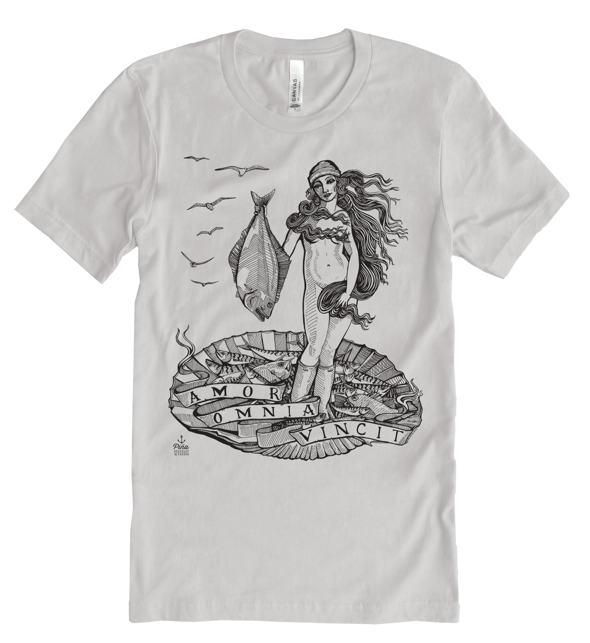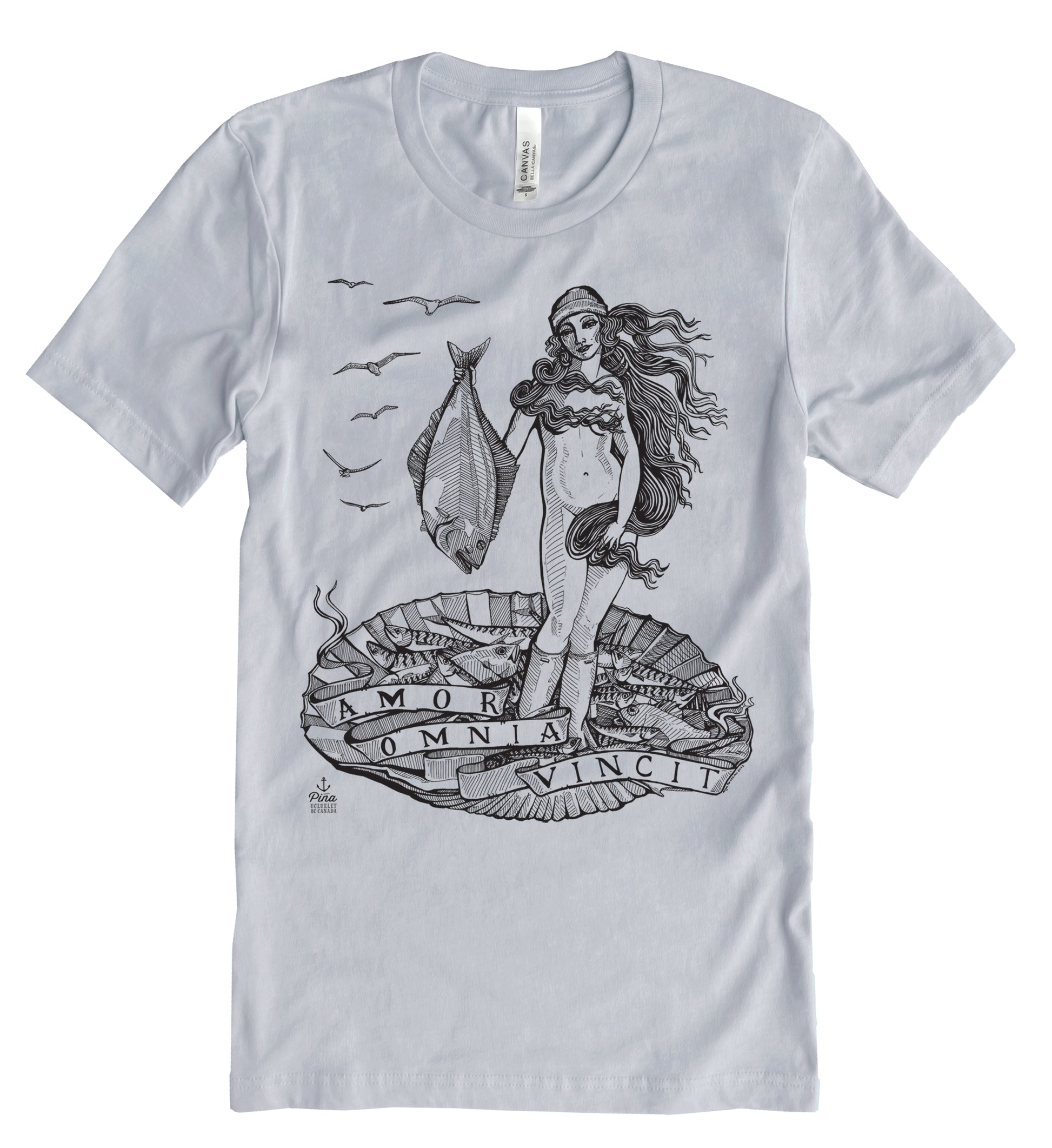 Our Birth of Venus Westcoast Style printed in black ink on the front of a unisex, cotton jersey t-shirt.