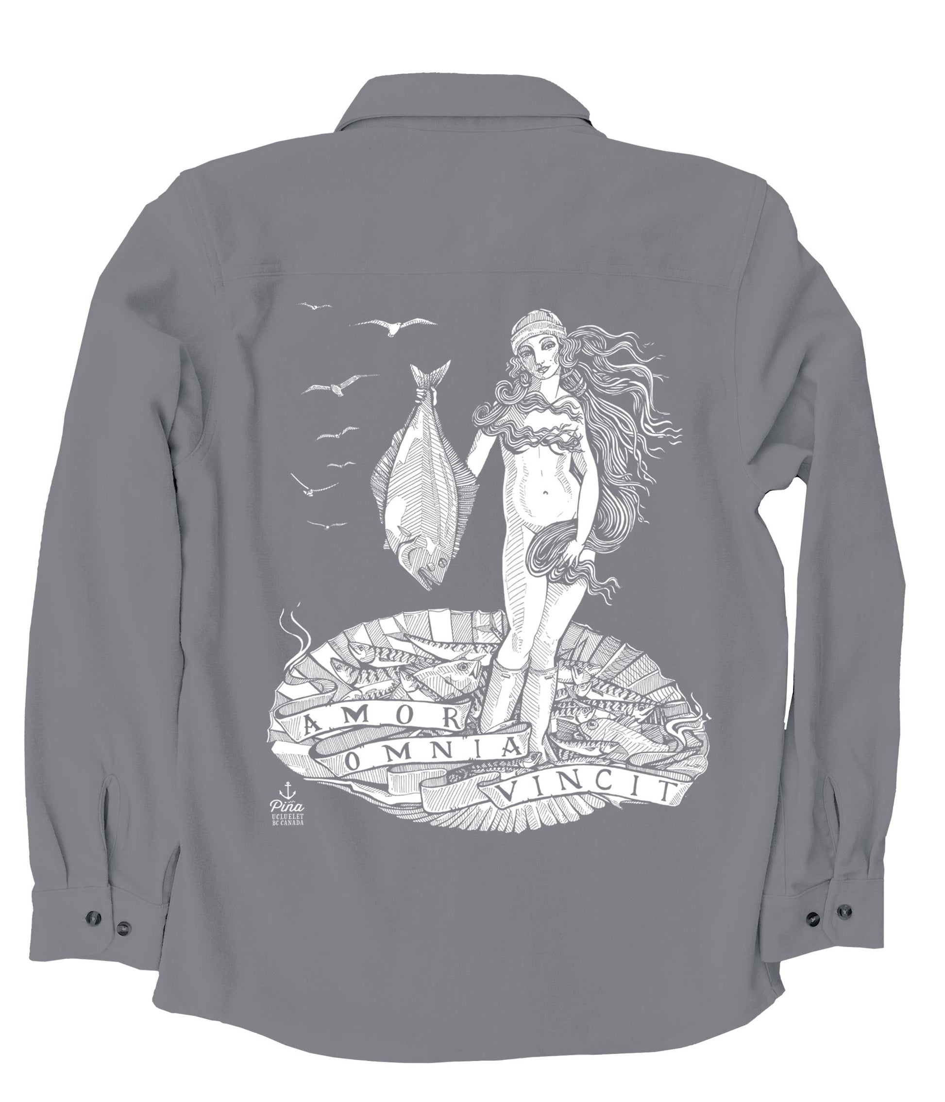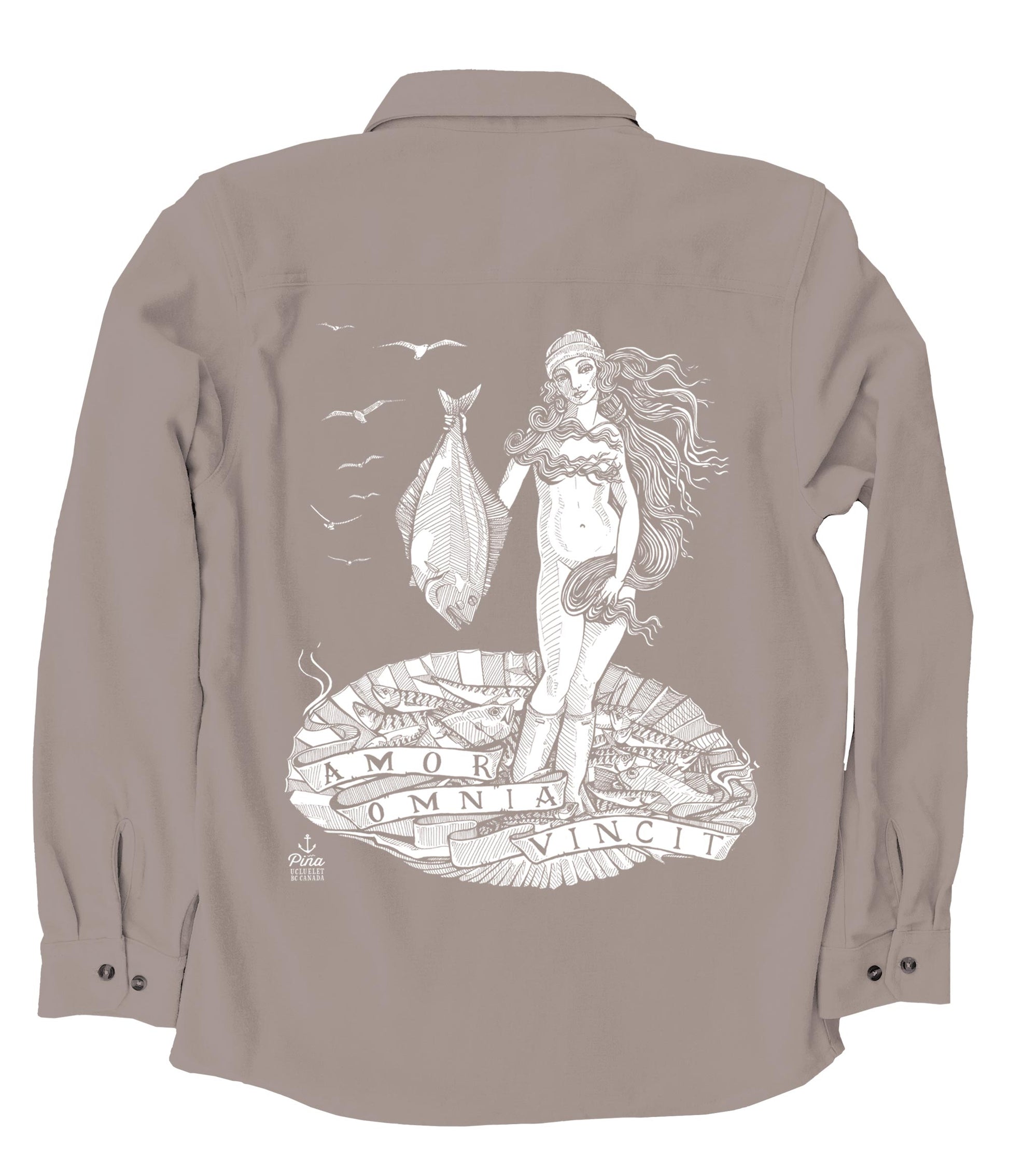 This goddess of love stands amongst her bountiful catch celebrating victory and prosperity. A banner reads “Amor Omnia Vincit" meaning “Love Conquers All". A soft and comfortable unisex flannel printed with The Birth of Venus design on the back in white ink and a cod and halibut in black ink on the front pocket.