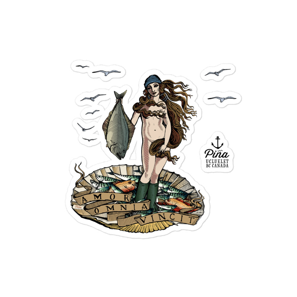 This divine goddess stands in gumboots amongst her bountiful catch, "Amor Vincit Omnia" or "Love Conquers All" reads the banner below.
