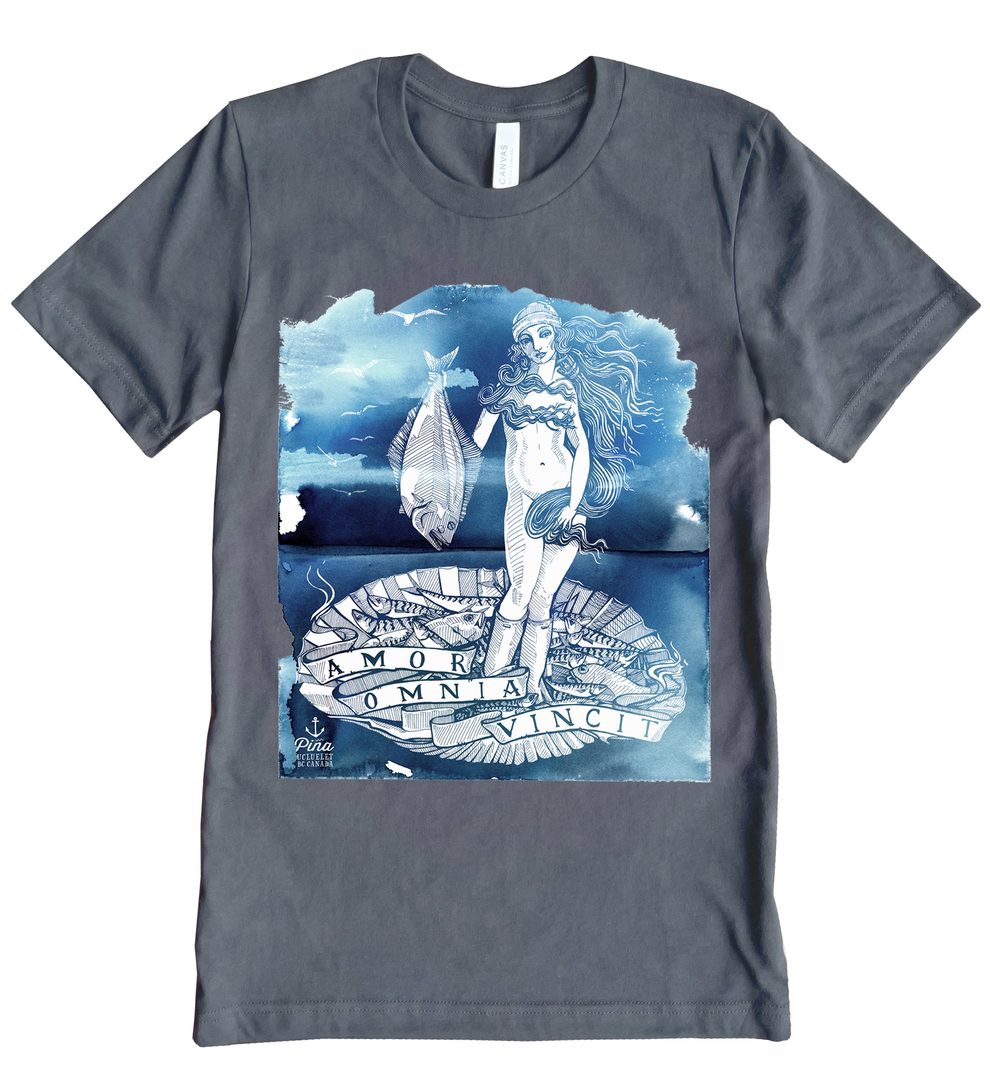 Our Birth of Venus Westcoast Style printed with a beautiful blue watercolour background on the front of a unisex, cotton jersey t-shirt.