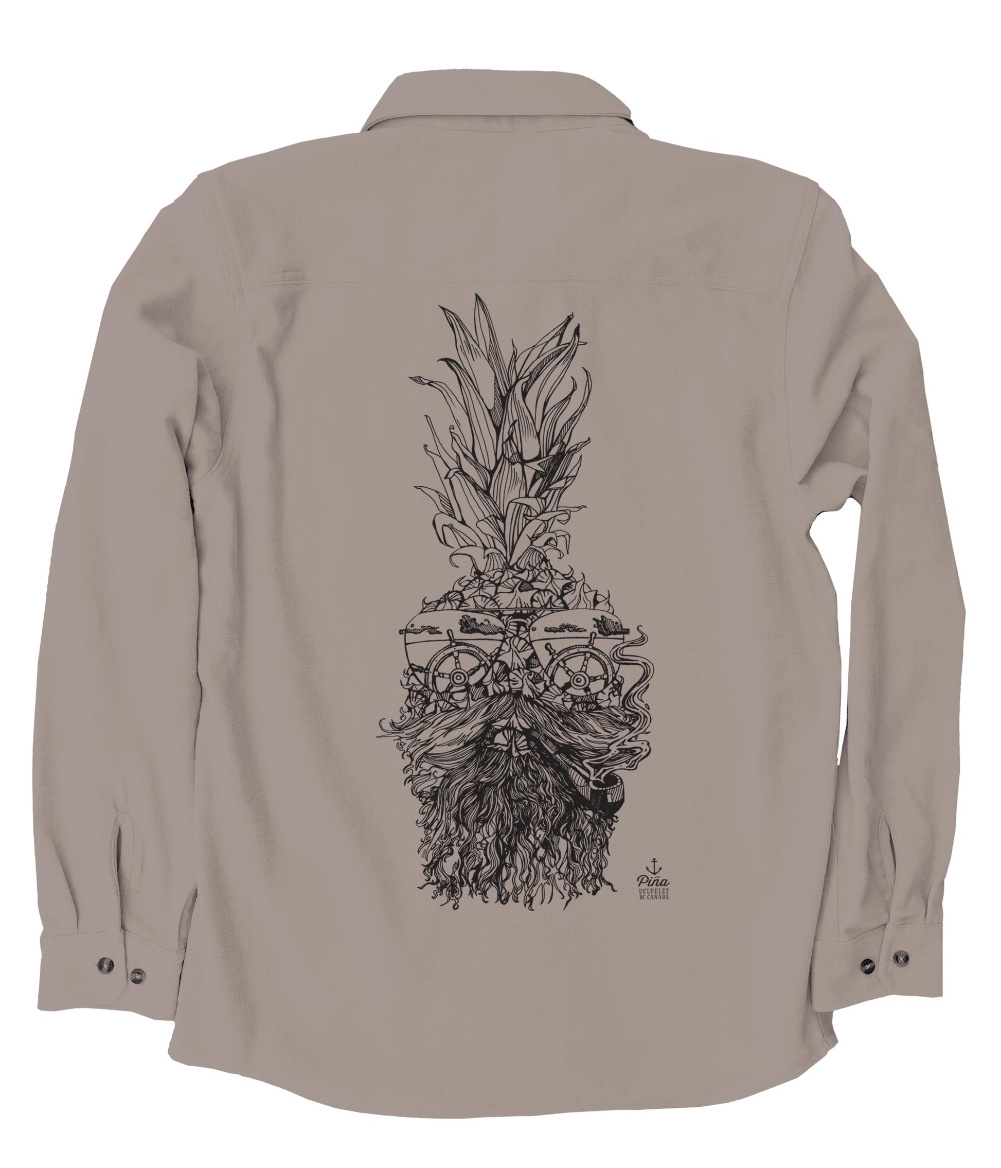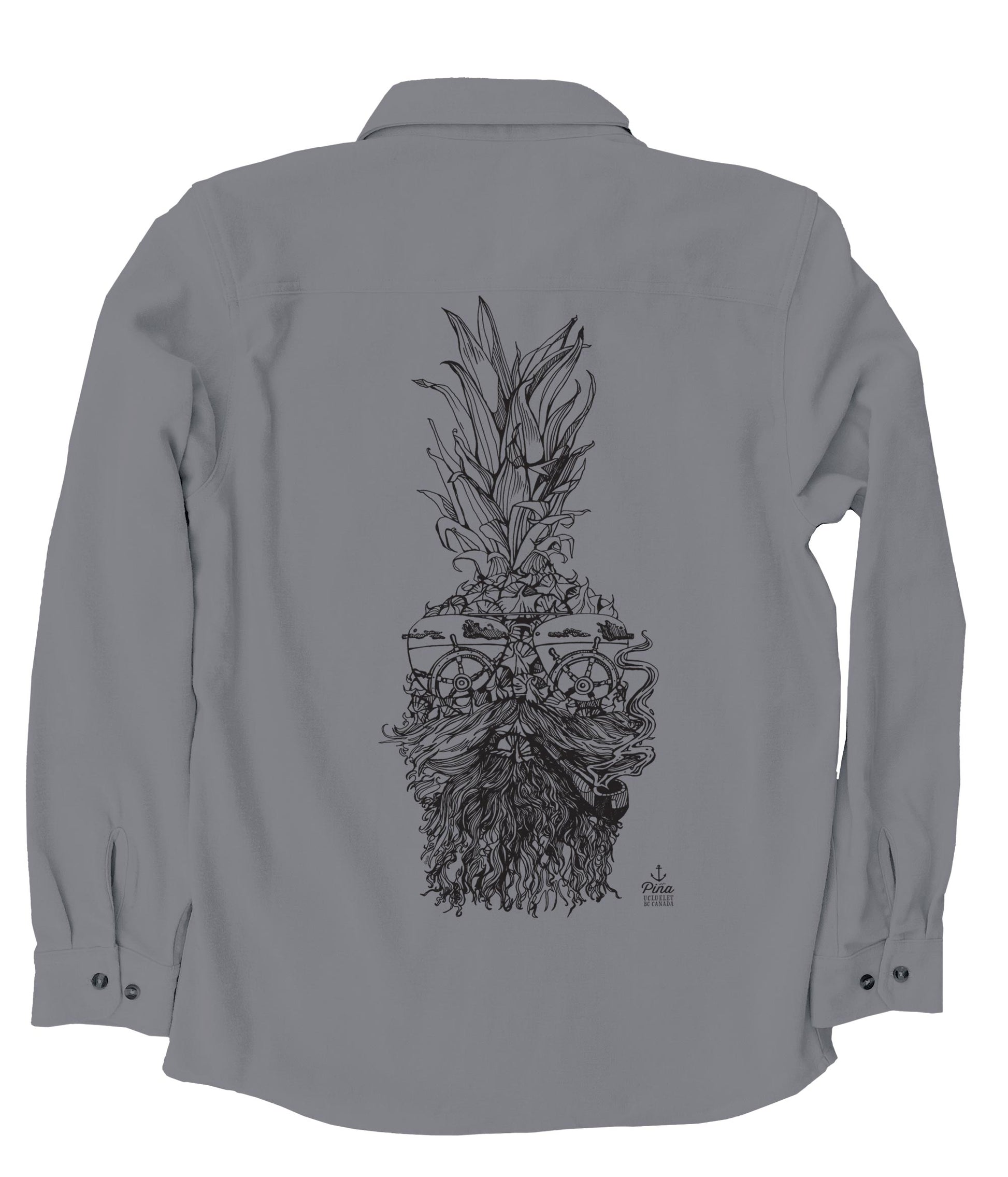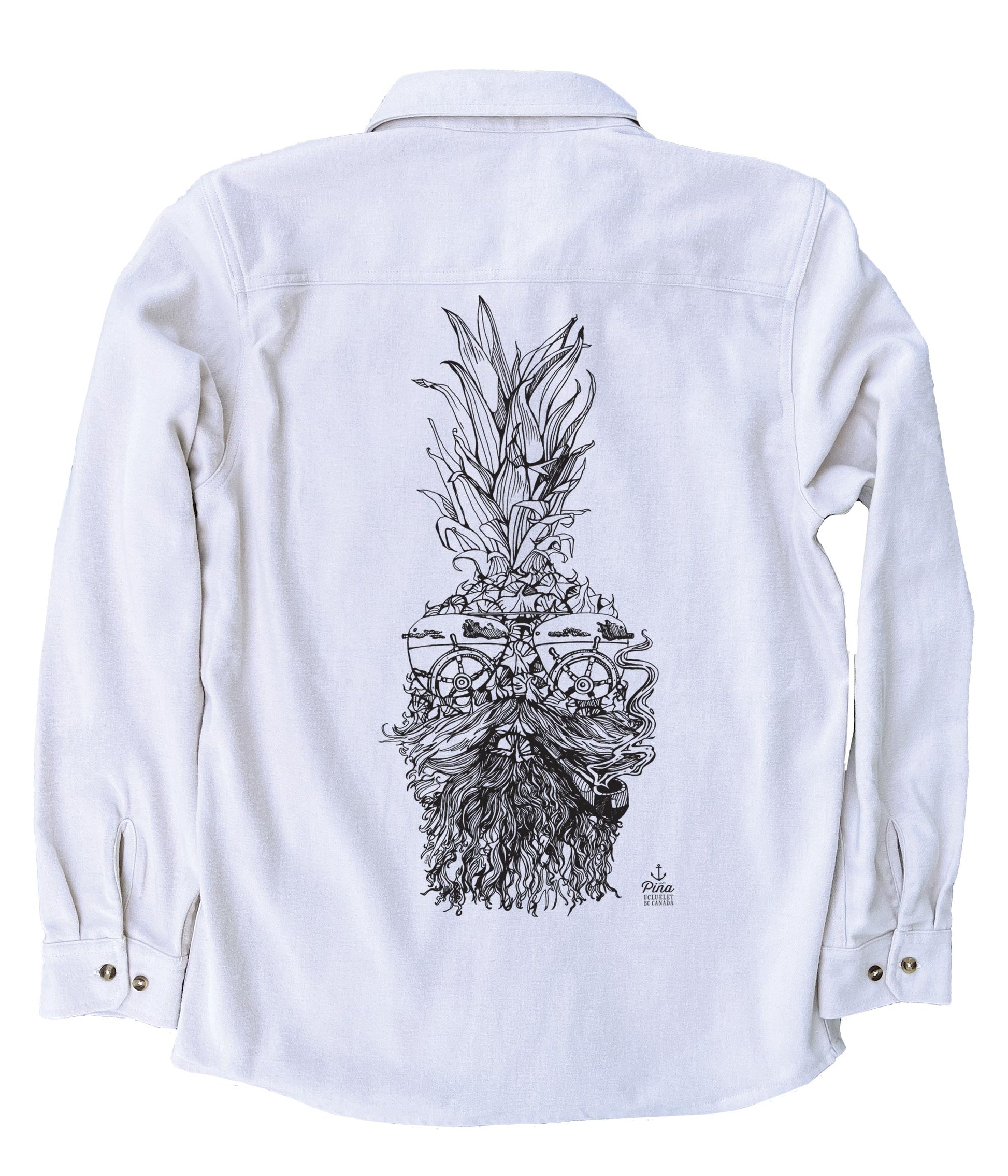 Steer your way through stormy seas with this salty old fellow–this fruit may have been at sea too long. Look closely at the smoke coming our of his pipe and you'll see a mackerel. This soft and comfortable unisex flannel is printed with our Captain Piña design in black ink on the back, and a ship's wheel on the front pocket.