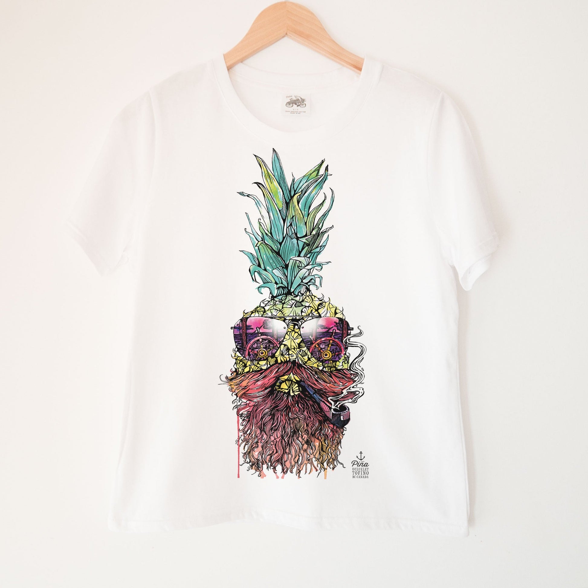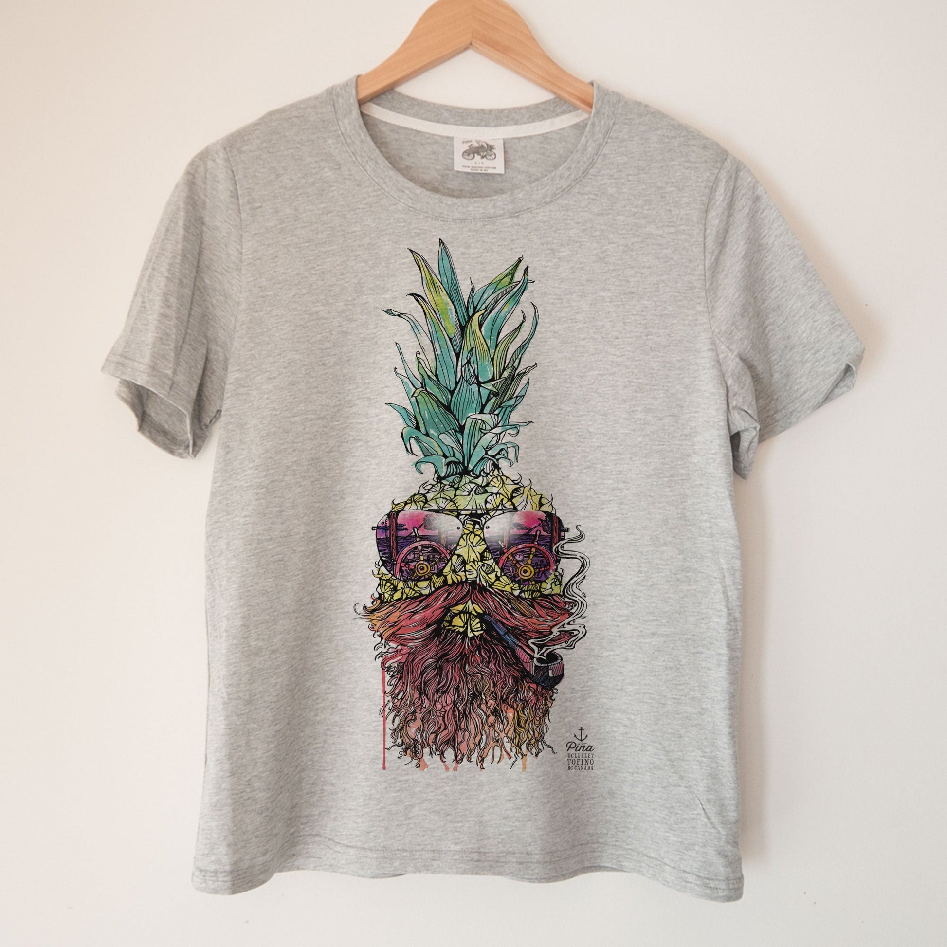This soft and comfortable organic cotton ladies boxy tee is printed with our Captain Piña design on the front. Steer your way through stormy seas with this salty old fellow. Look closely at the smoke coming our of his pipe and you'll see a mackerel, or perhaps we've just been at sea too long.