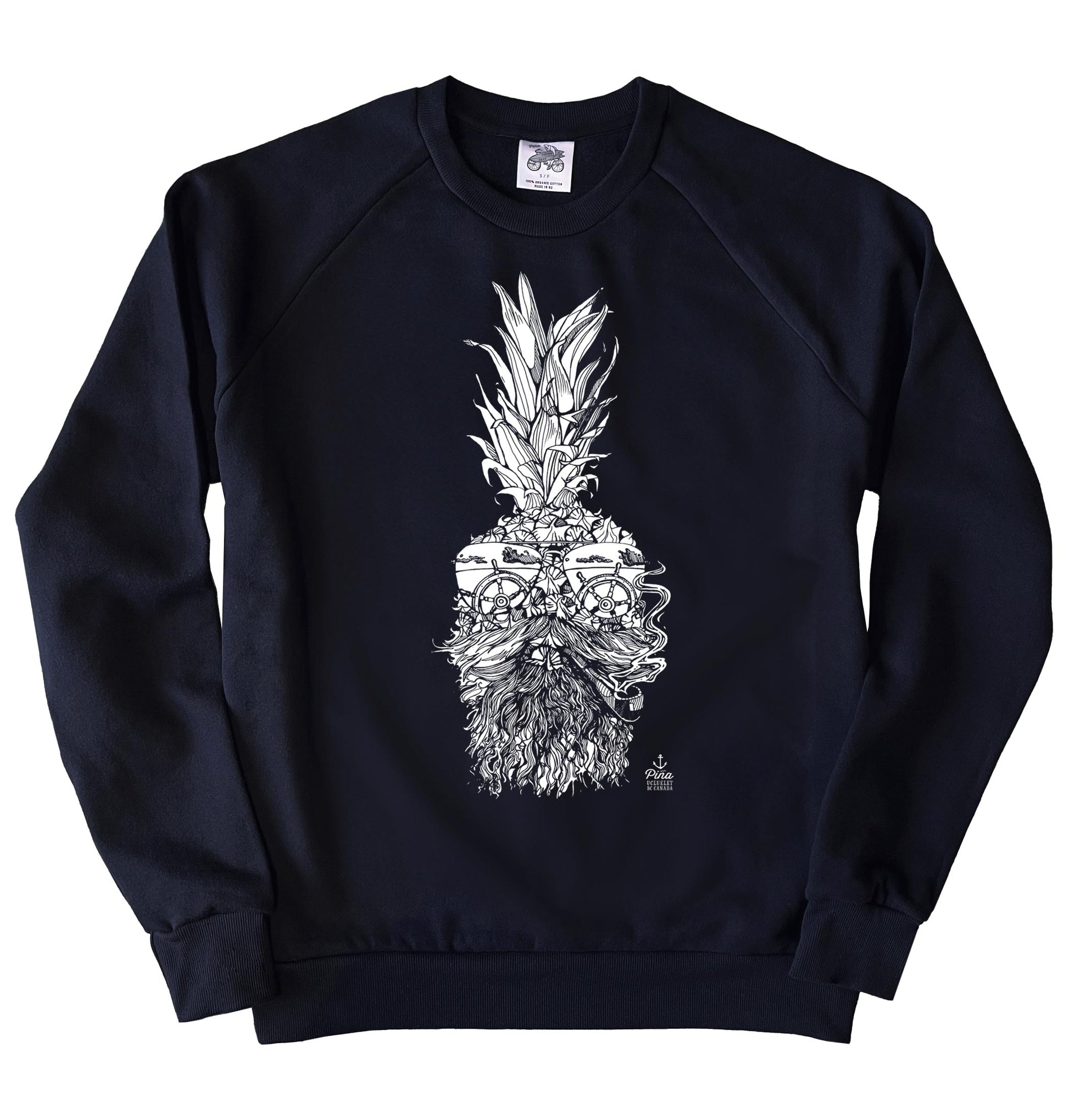 Our Captain Piña design printed in white ink on a unisex crewneck sweatshirt. Steer your way through stormy seas with this salty old fellow.