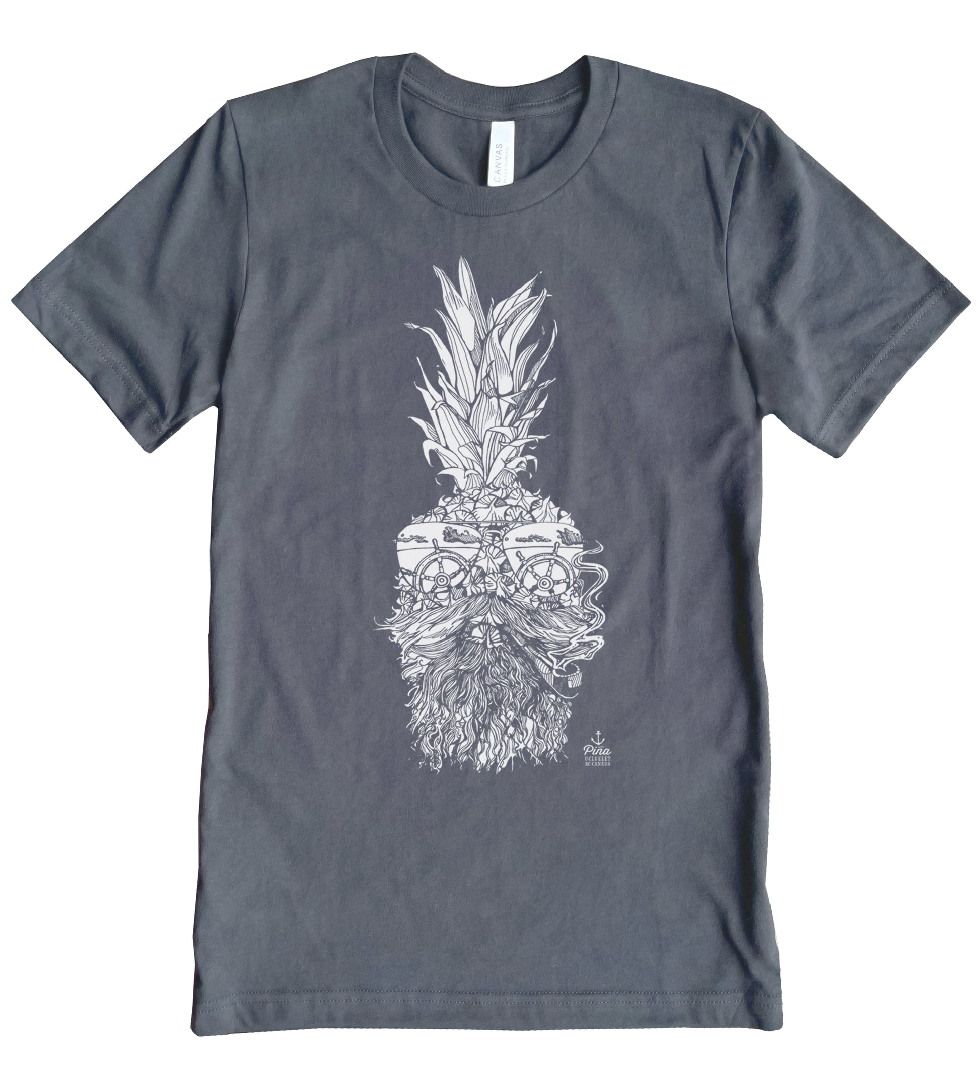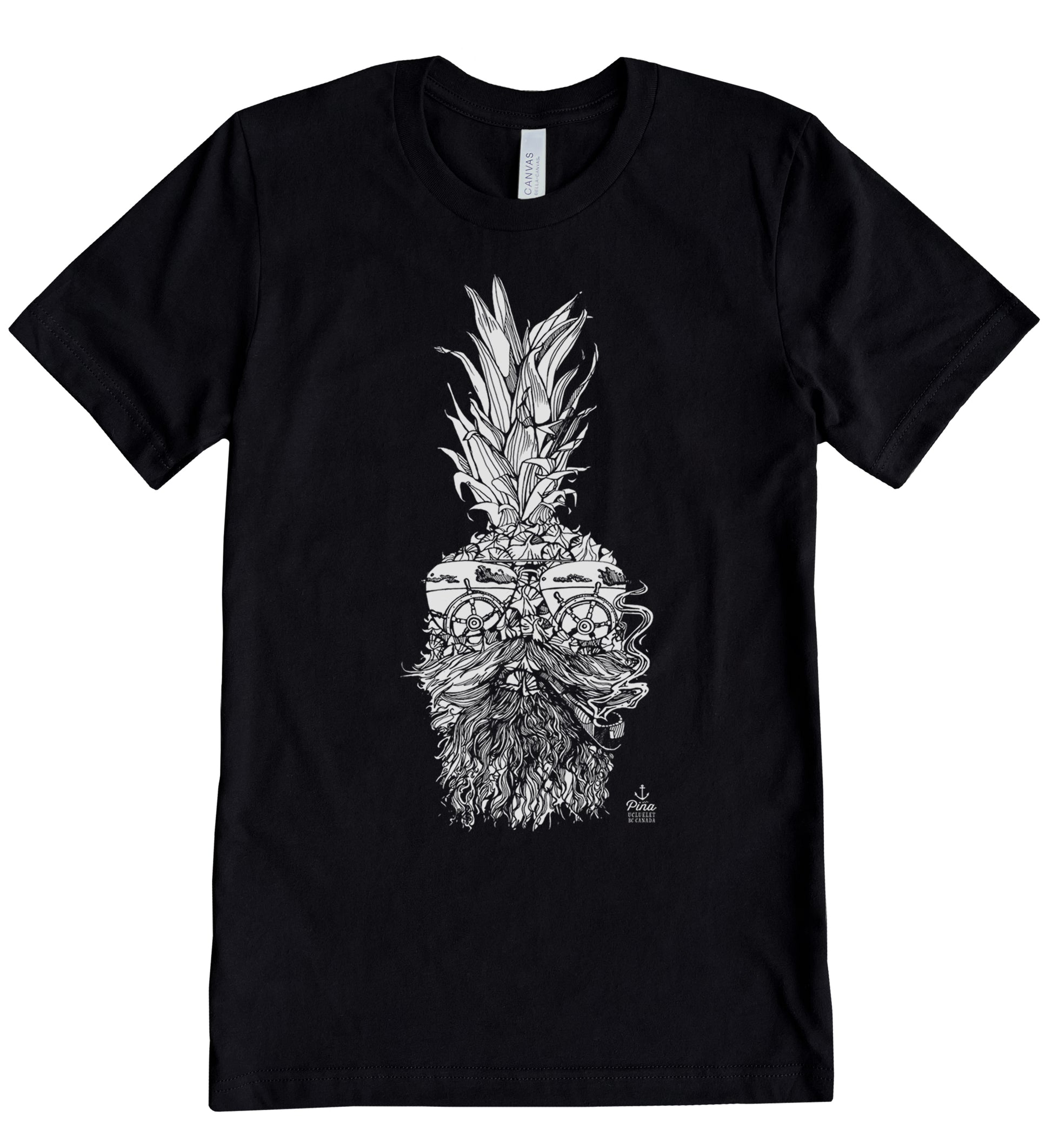 Steer your way through stormy seas with this salty old fellow. Our Captain Pina design printed in white ink on the front of a unisex, cotton jersey t-shirt. This crewneck t-shirt is soft and comfortable and made from 100% cotton. Each shirt is custom printed just for you!