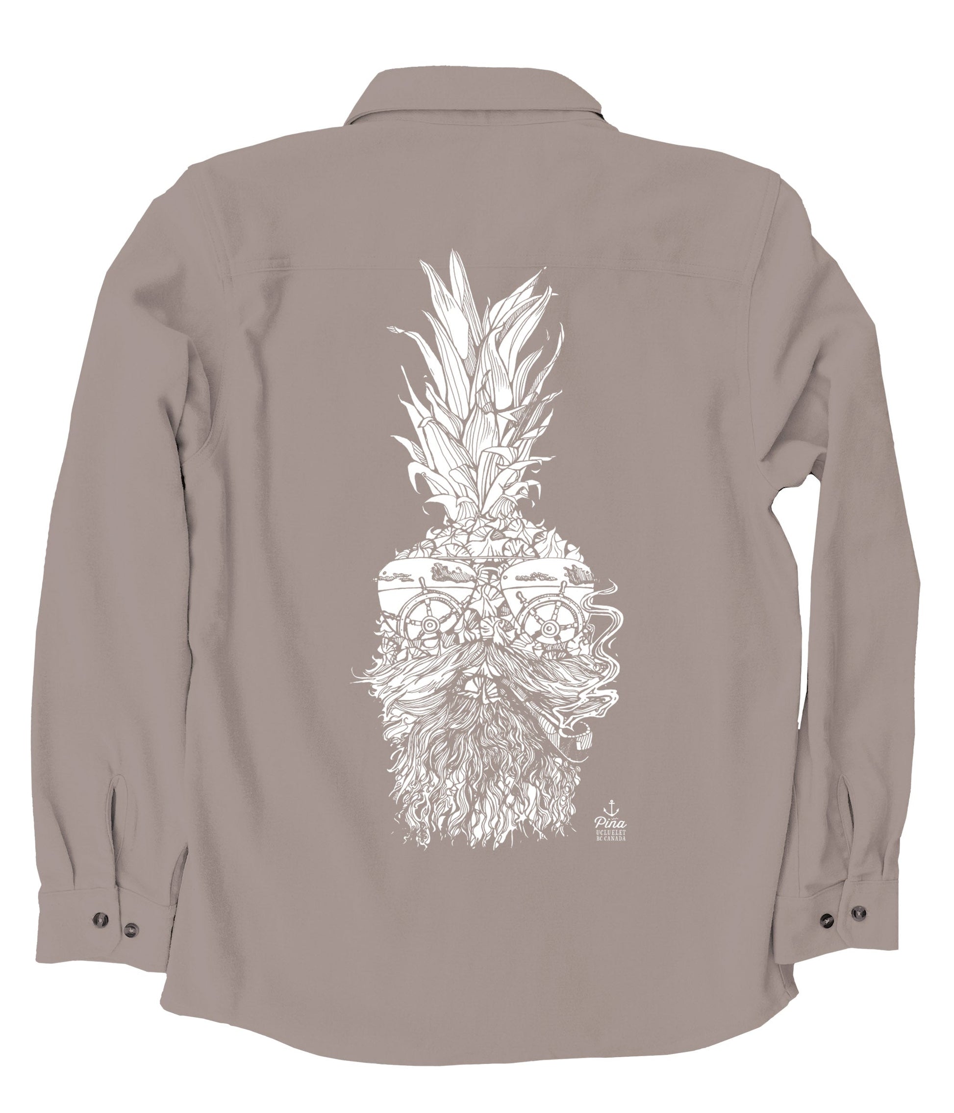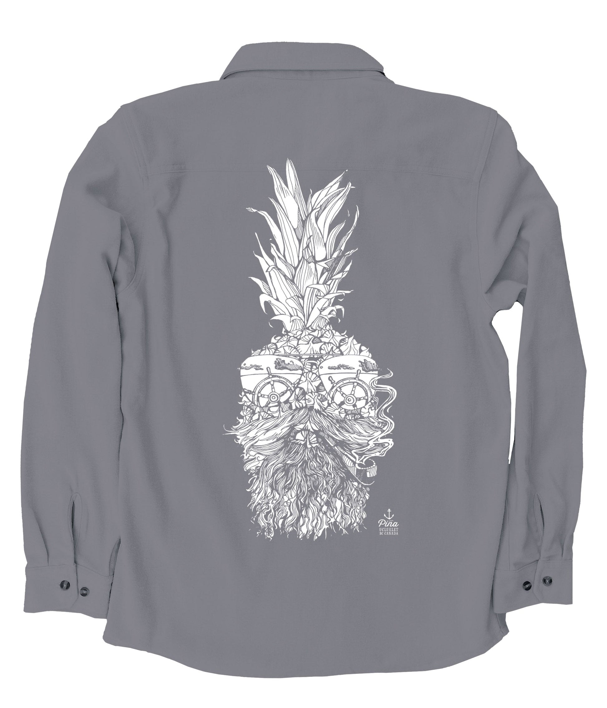 Steer your way through stormy seas with this salty old fellow–this fruit may have been at sea too long. Look closely at the smoke coming our of his pipe and you'll see a mackerel. This soft and comfortable unisex flannel is printed with our Captain Piña design in white ink on the back, and a black ship's wheel on the front pocket.