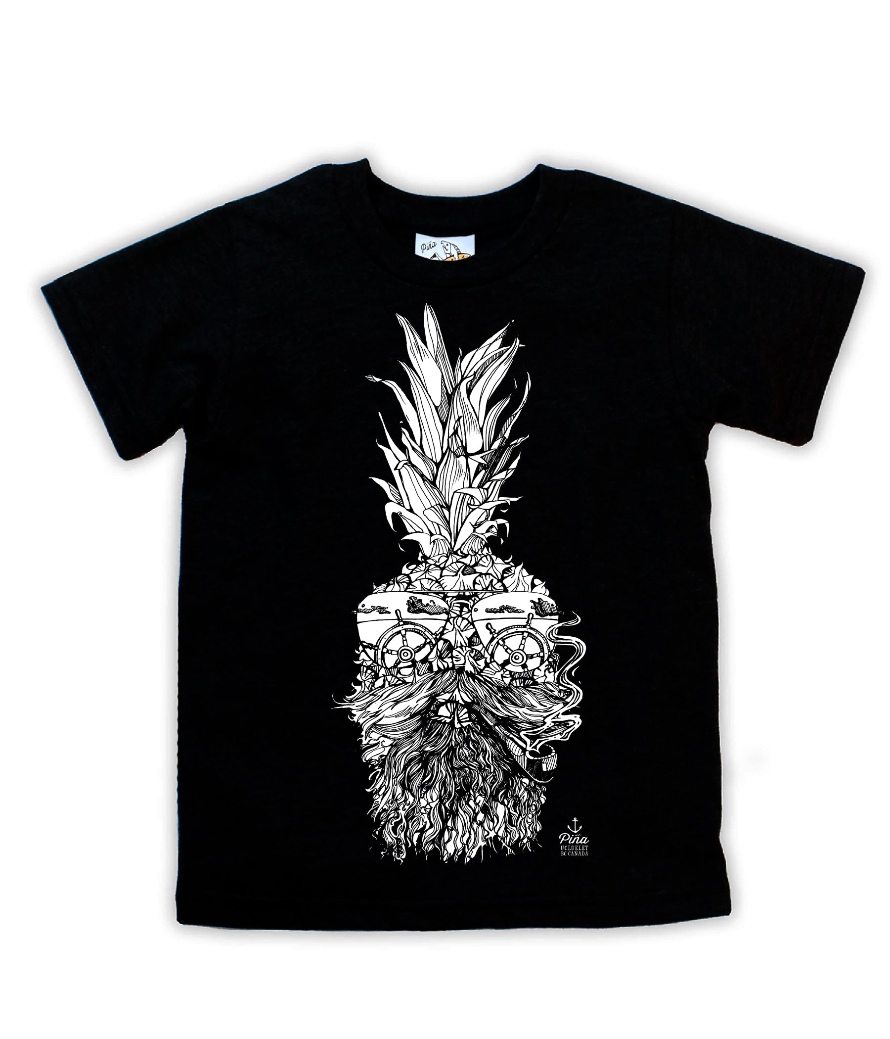 This soft and comfortable kids tee is printed with our Captain Piña design on the front. Steer your way through stormy seas with this salty old fellow. Look closely at the smoke coming our of his pipe and you'll see a mackerel, or perhaps we've just been at sea too long.