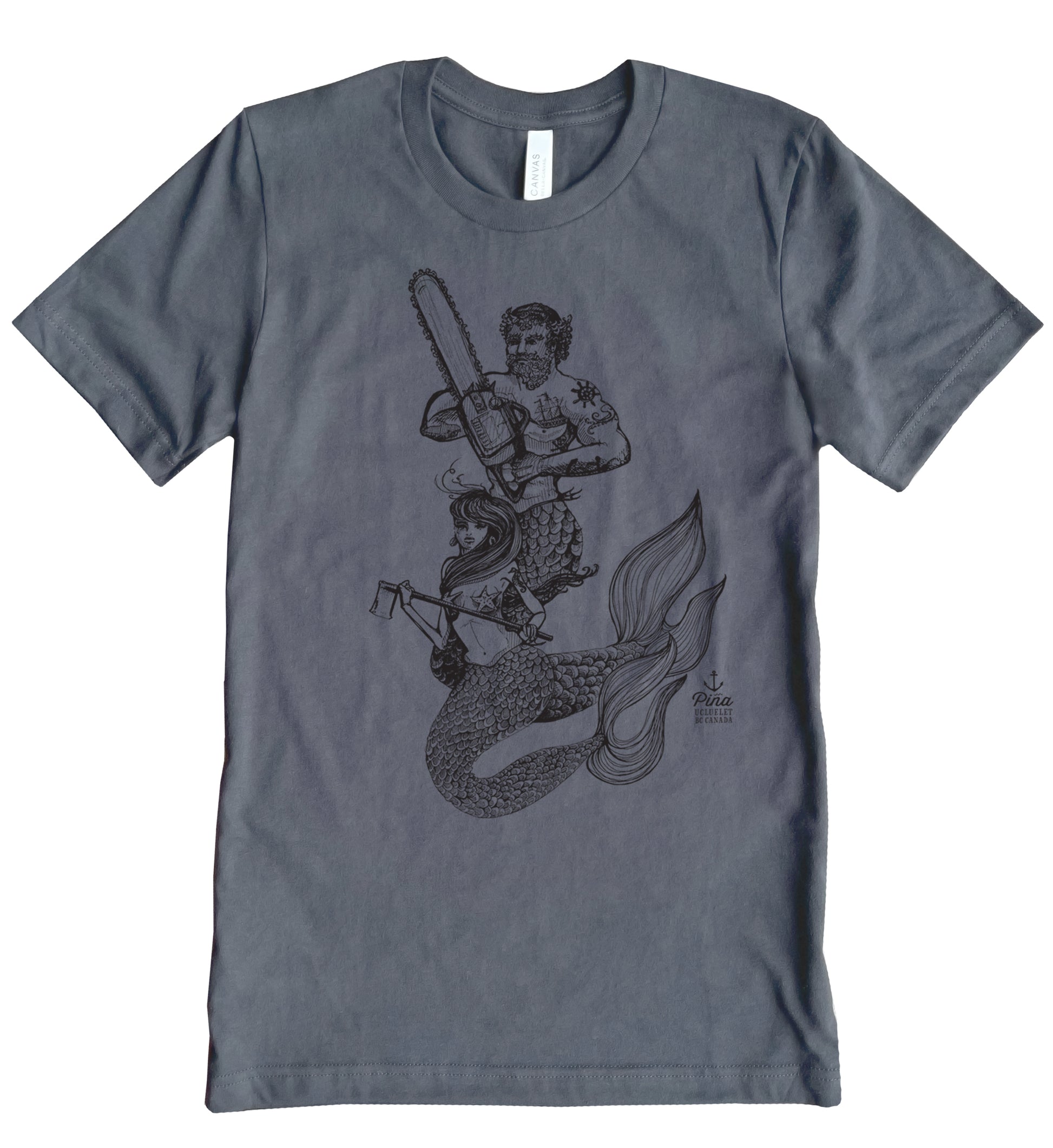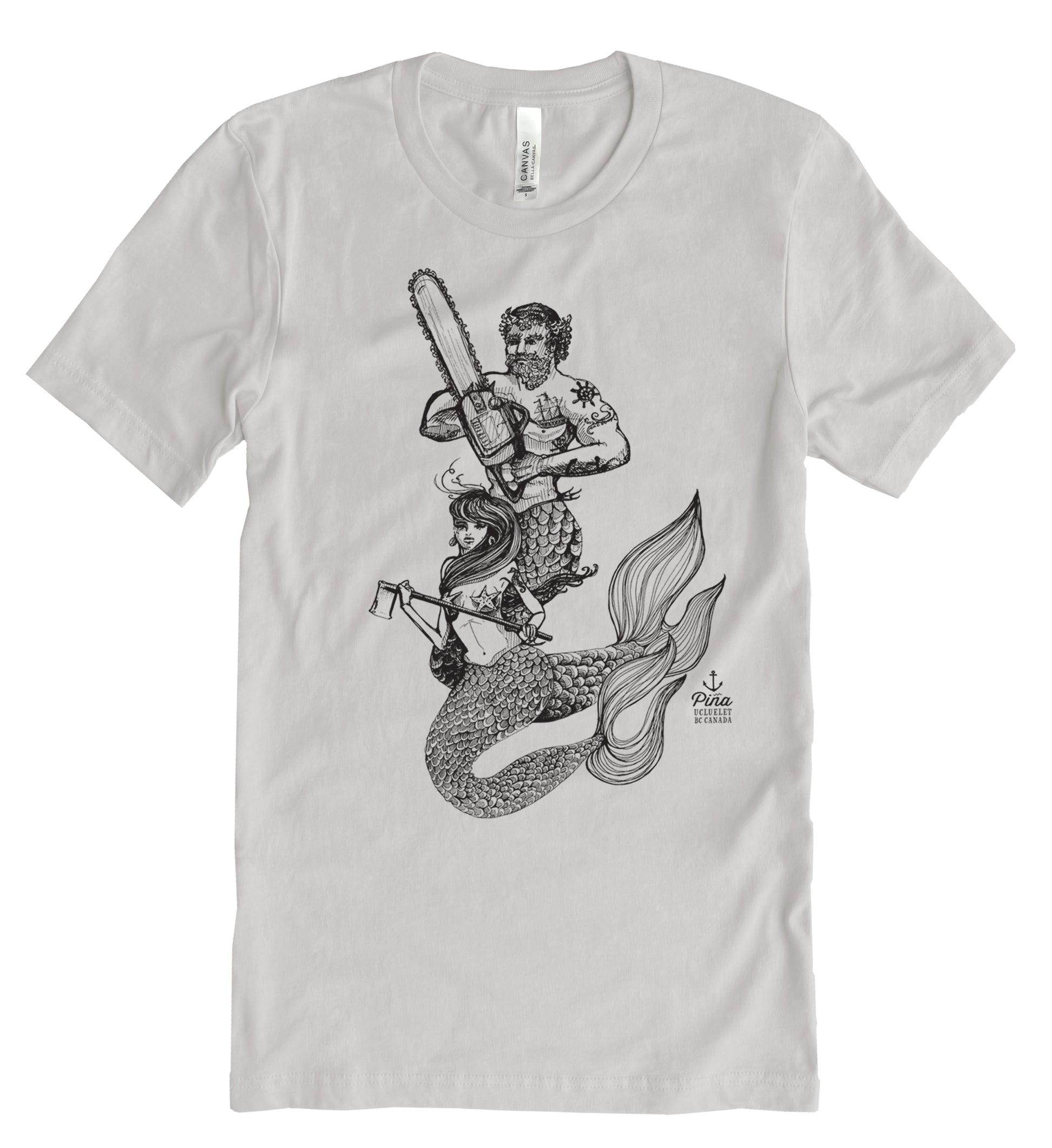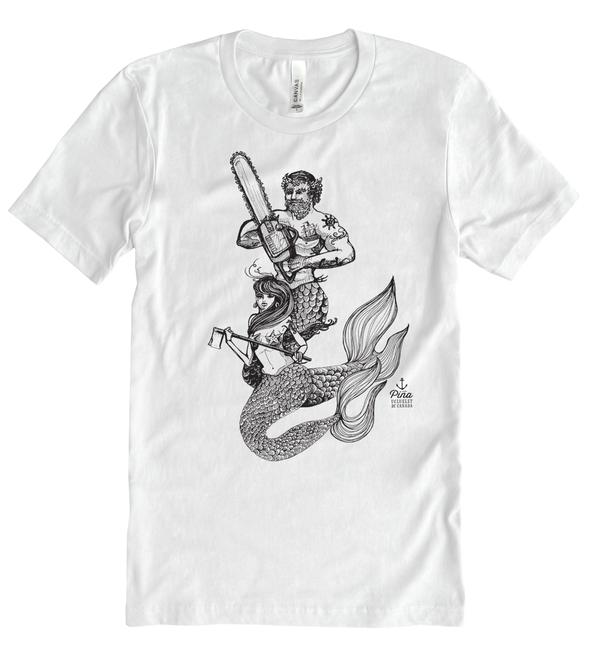 Our Chainsaw Mercouple design printed in black ink on the front of a unisex, cotton jersey t-shirt. This crewneck t-shirt is soft and comfortable and made from 100% cotton. Each shirt is custom printed just for you!