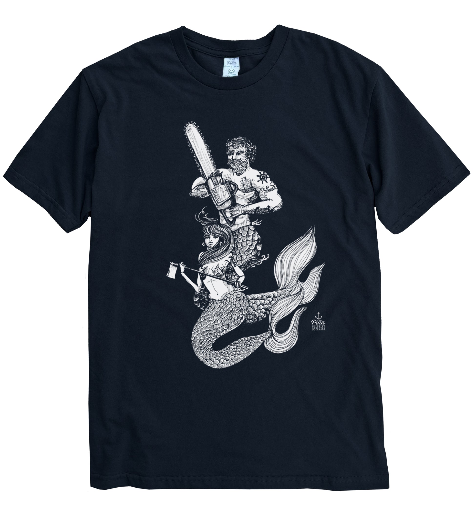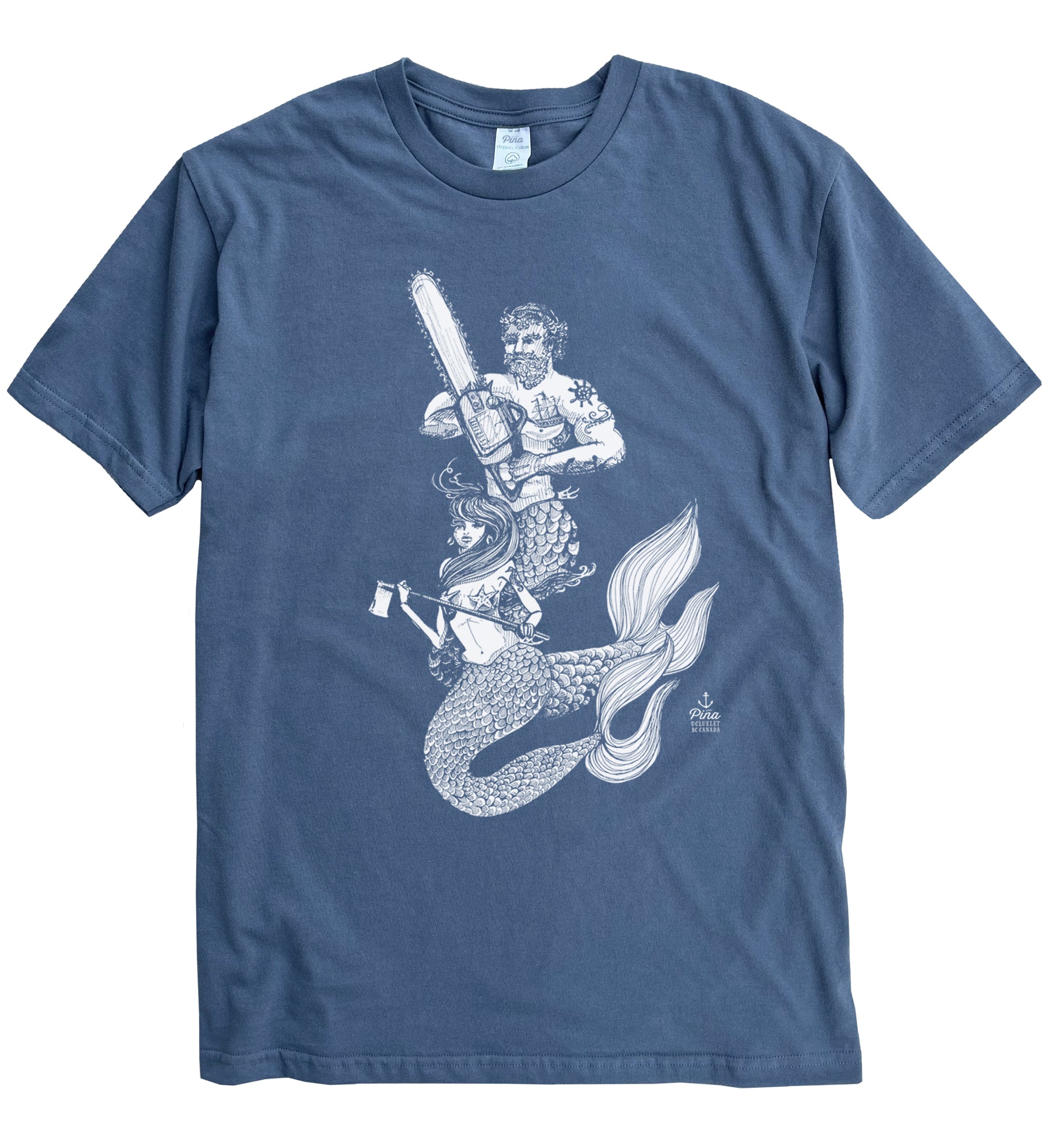Our romantic Chainsaw Mercouple design printed in white ink on the front of a 100% organic cotton unisex tee. This crewneck t-shirt is soft and comfortable with a flattering fit. Each shirt is made in Canada then custom printed by us in Ucluelet, just for you!