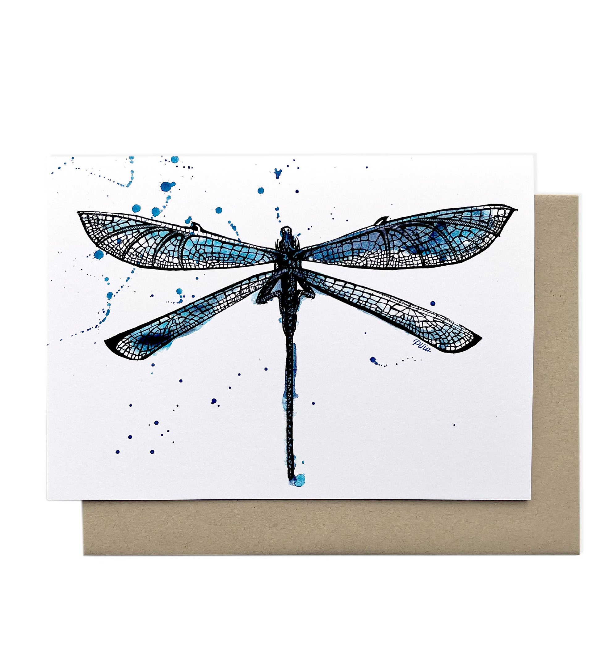 This card features our watercolour and ink Dragonfly design. Look closely for the miniature dragon features. This little fairy tale critter is sure to please your most intricate fantasies.