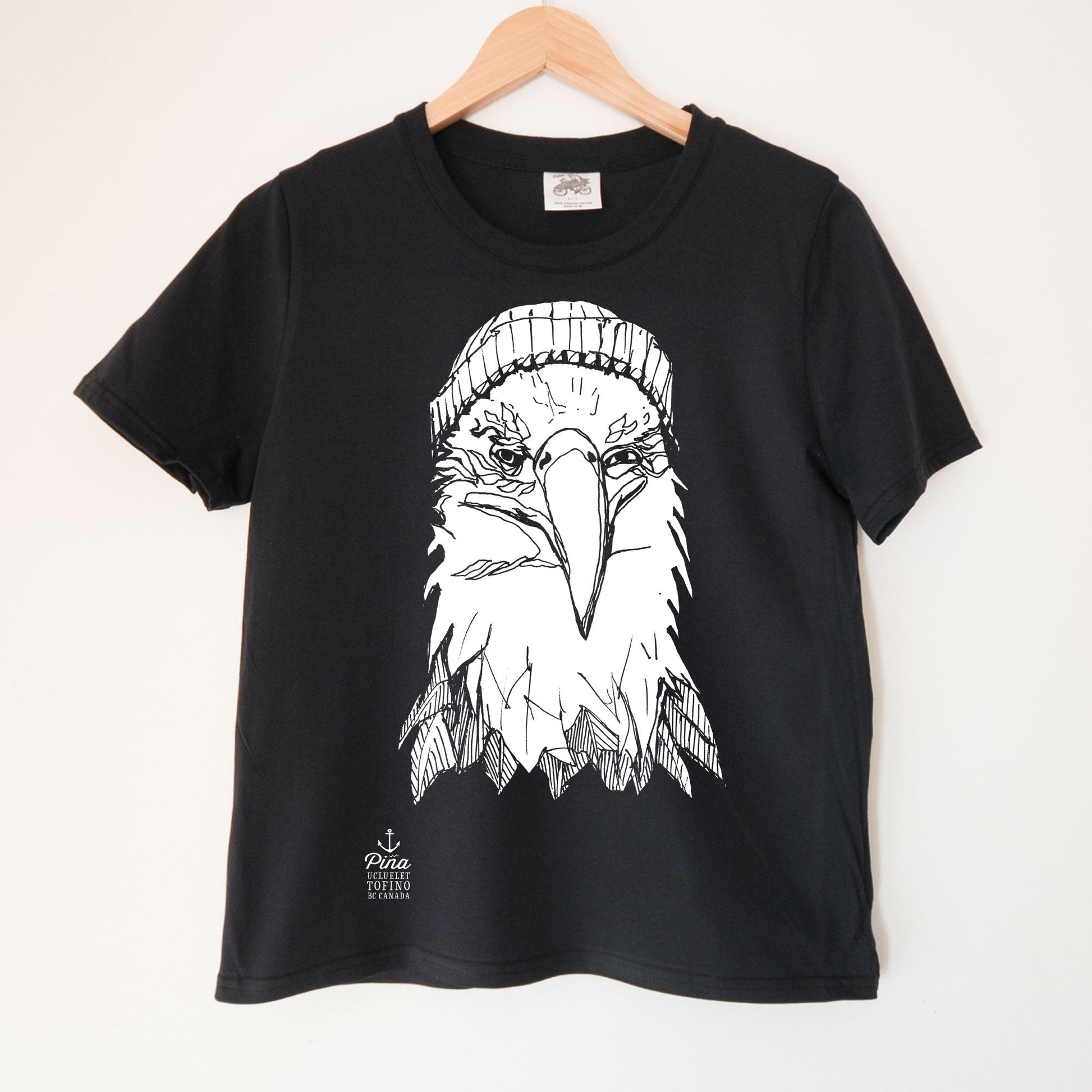 A soft and comfortable organic cotton ladies boxy tee printed with our beautiful Eagle Toque design, featuring an eagle wearing a toque and a mysterious expression.