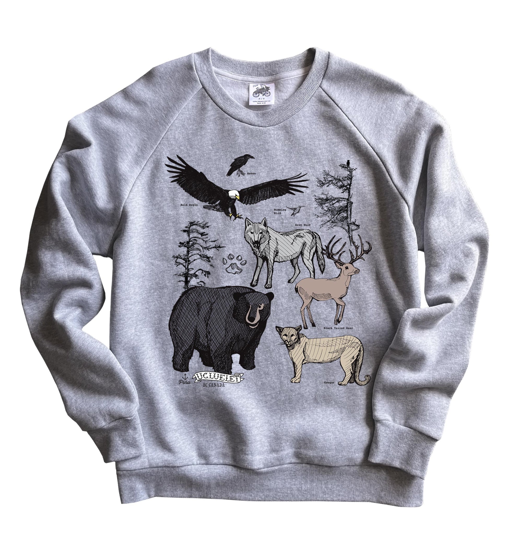 Some of our favourite Pacific Northwest forest species including the raven, bald eagle, black bear, grey wolf and more printed in full colour on the front of a unisex crewneck sweatshirt.