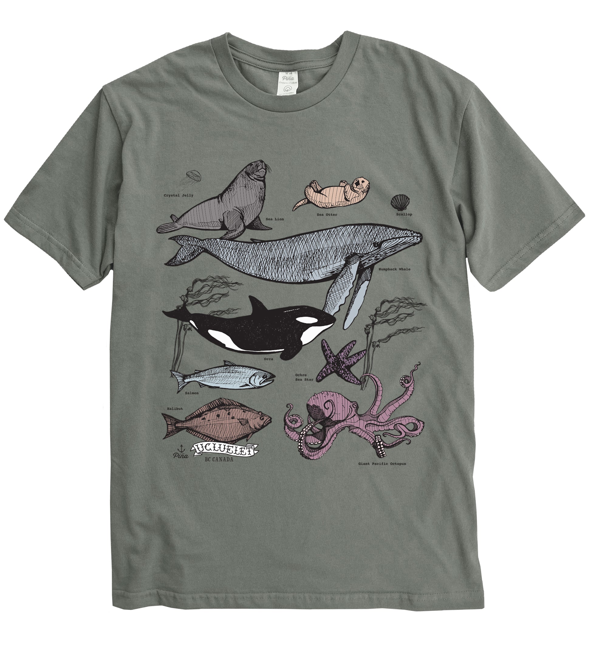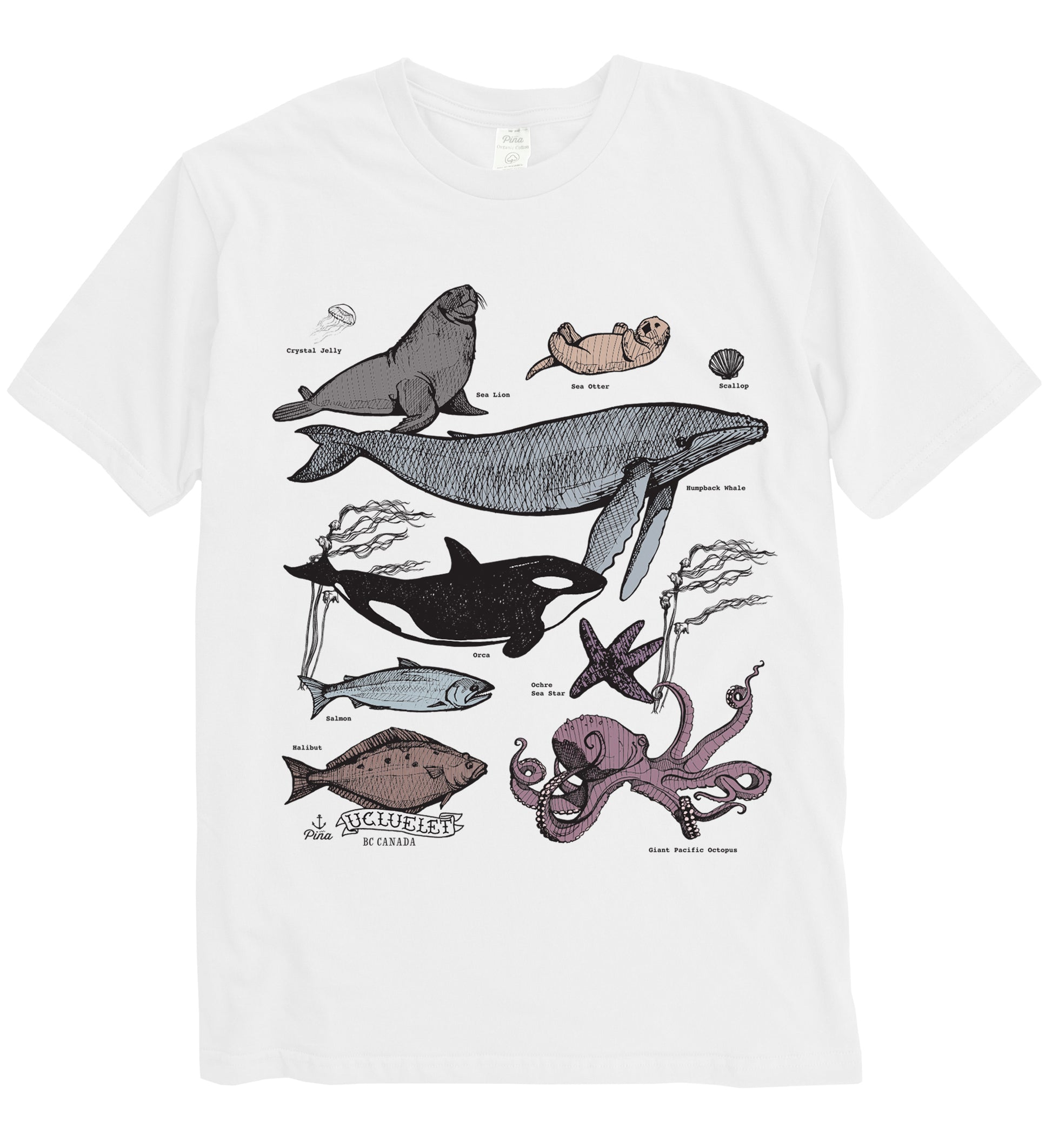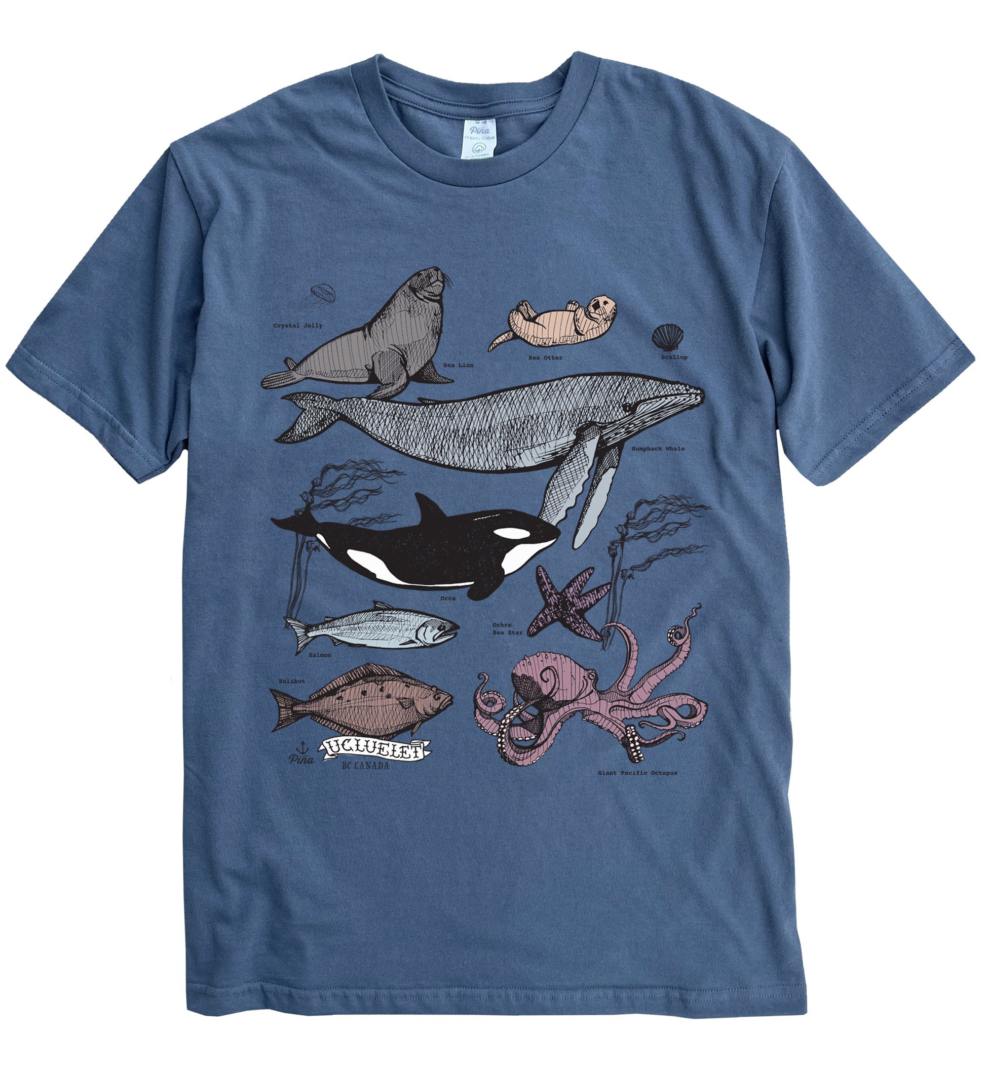 Some of our favorite Pacific Northwest ocean species including the orca, humpback whale, otter, salmon, octopus and more printed in full colour on the front of a 100% organic cotton unisex tee. This crewneck t-shirt is soft and comfortable with a flattering fit. Each shirt is made in Canada then custom printed by us in Ucluelet, just for you!