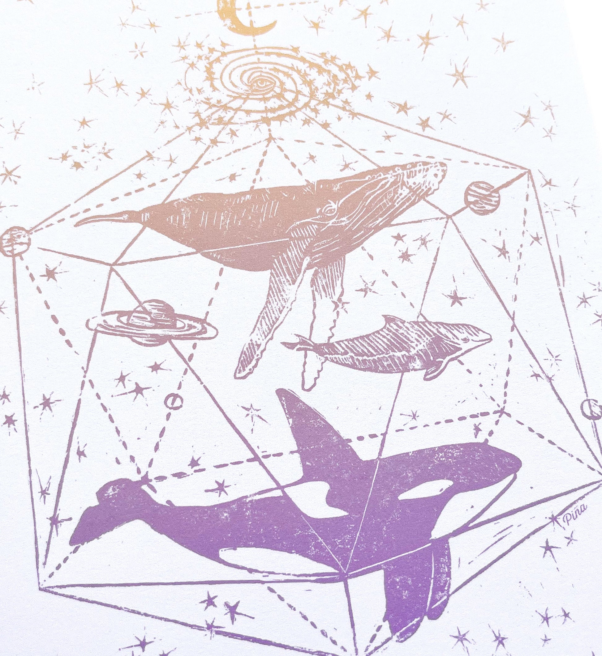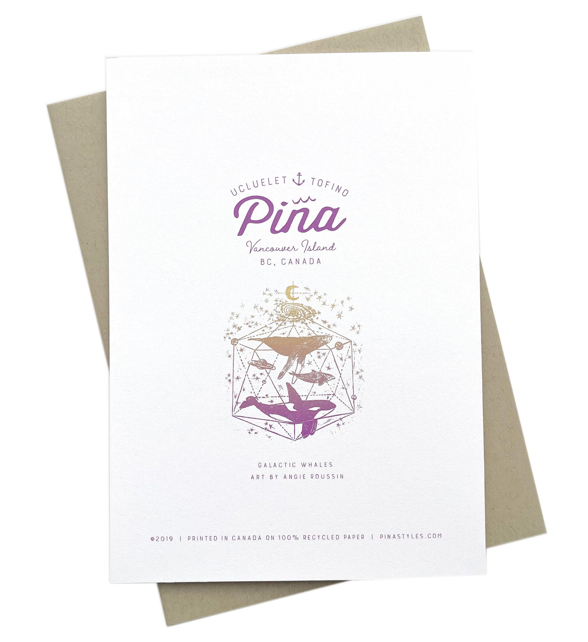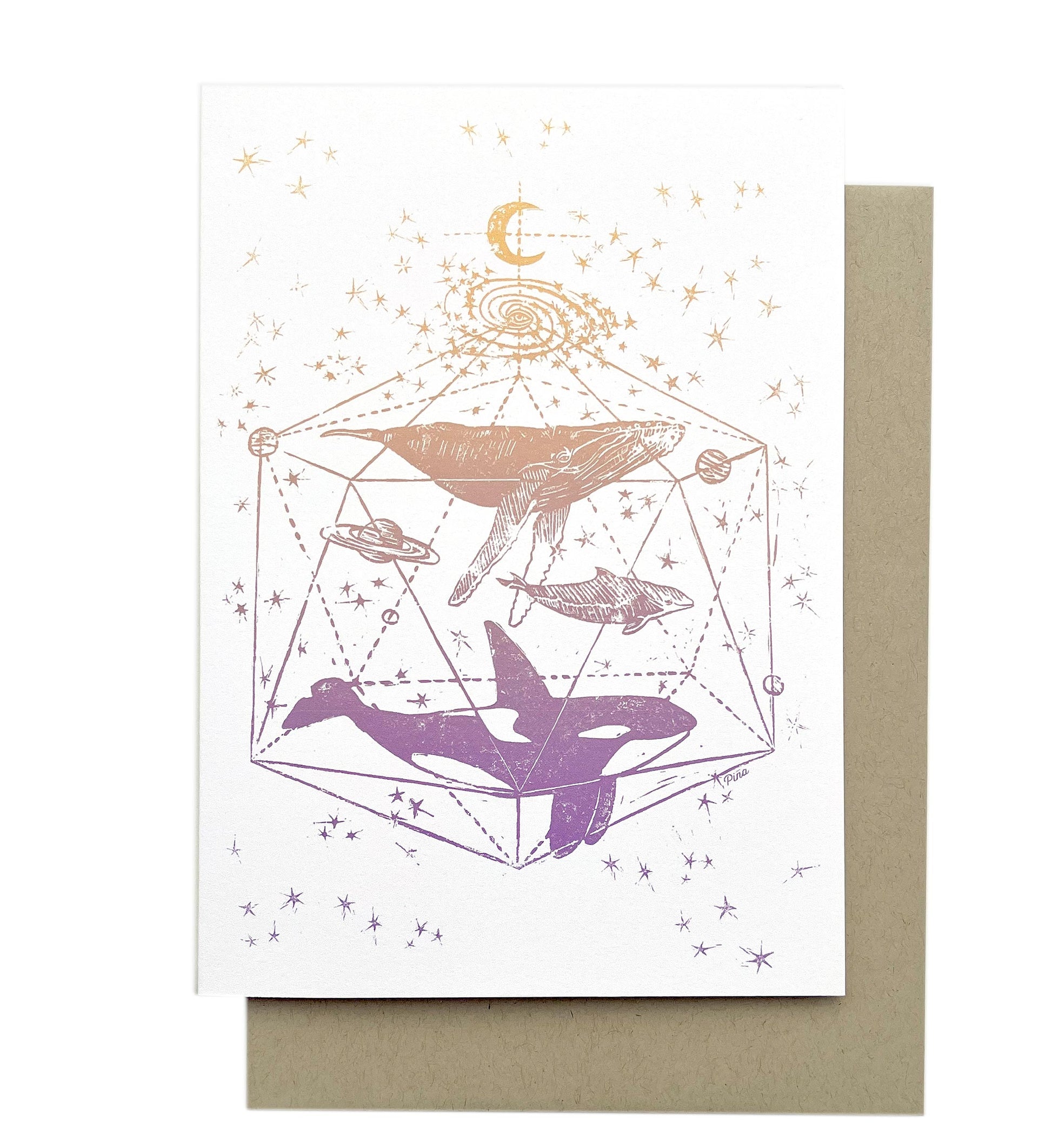 This greeting card features our Galactic Whales design in a beautiful gold to purple gradient on a natural background. Printed on a thick, recycled stock.