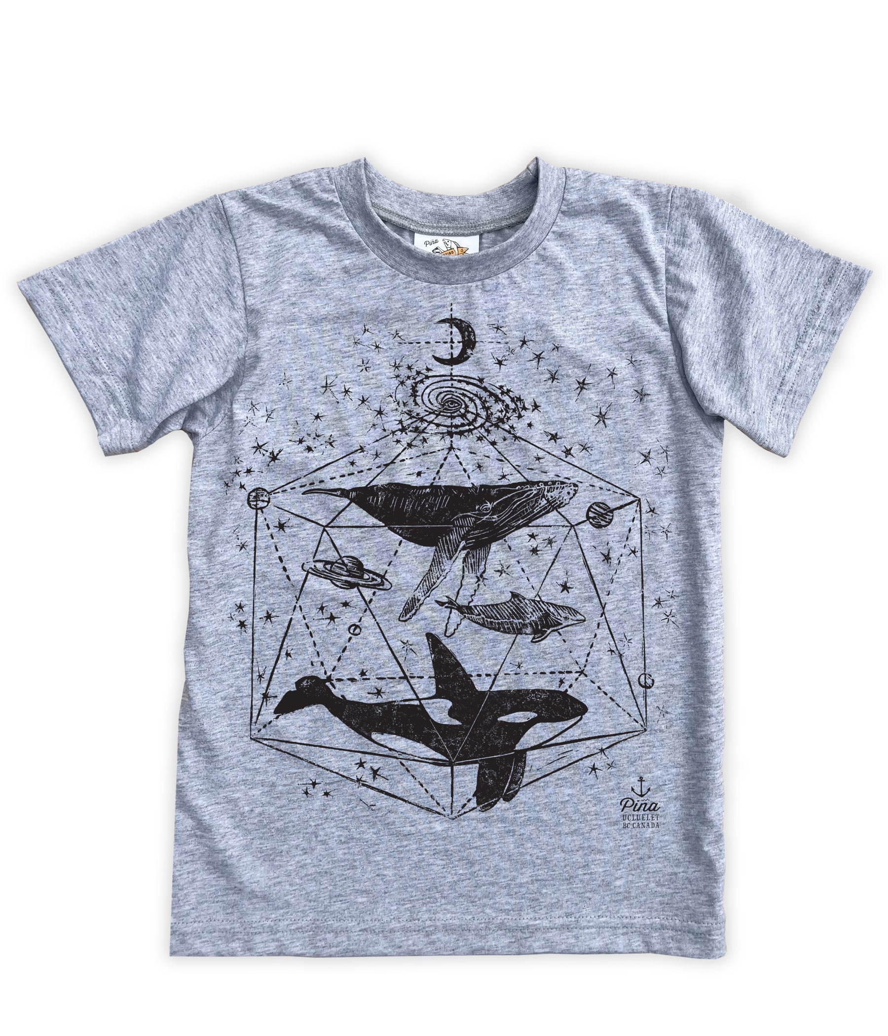 A soft and comfortable kids tee printed with our beautiful Galactic Whales design, featuring a humpback, orca and porpoise swimming through the infinite oneness. The centre of the universe spirals out from the eye of consciousness projecting the shape of a dodecahedron-the 5th element or aether. Created as a lino carving this print retains the texture of the carving and printmaking process. A true work of love.