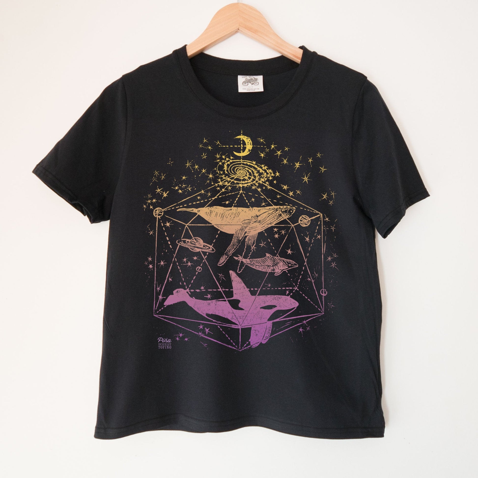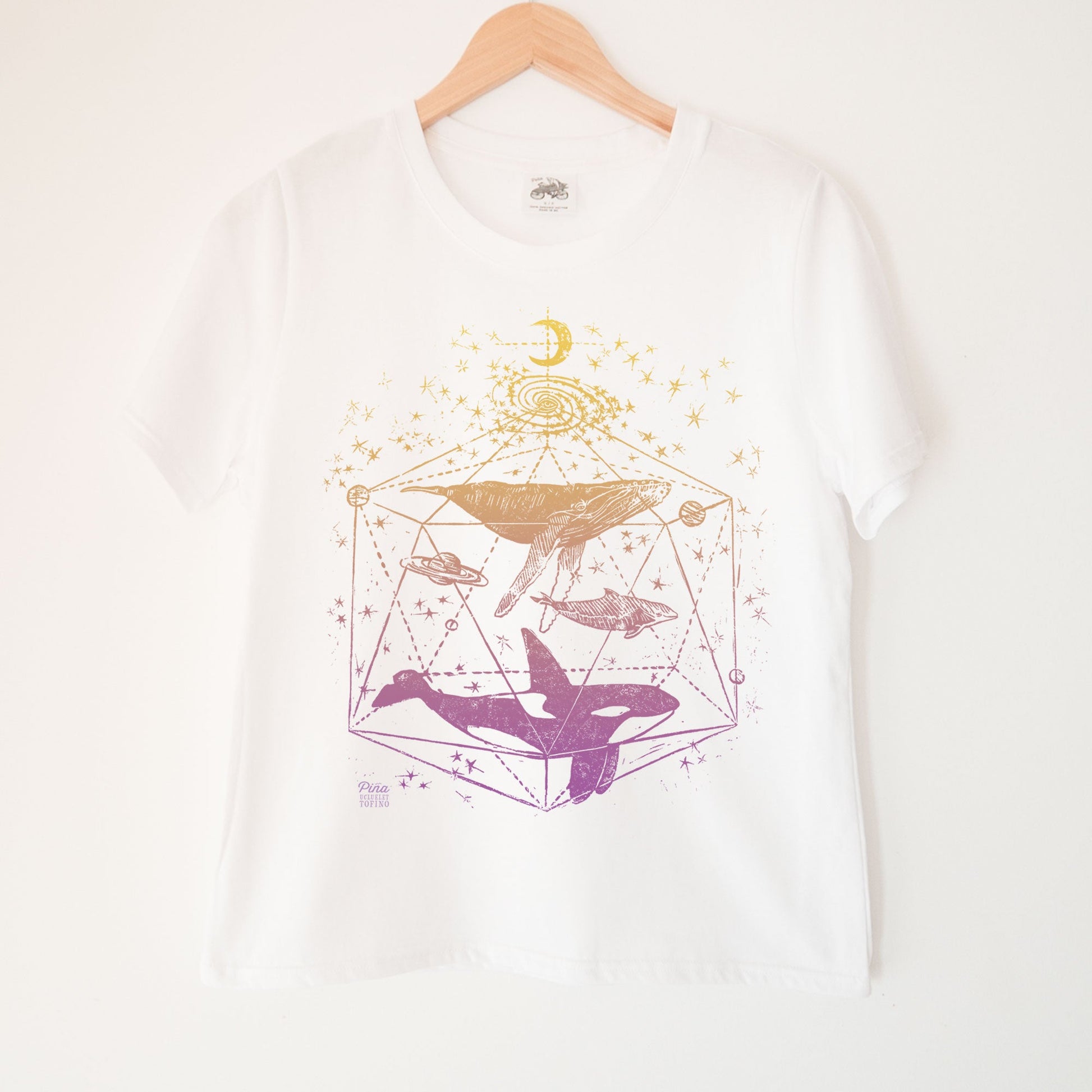 A soft and comfortable organic cotton ladies boxy tee printed with our beautiful Galactic Whales design, featuring a humpback, orca and porpoise swimming through the infinite oneness. The centre of the universe spirals out from the eye of consciousness projecting the shape of a dodecahedron–the 5th element or aether. Created as a lino carving this print retains the texture of the carving and printmaking process. A true work of love.