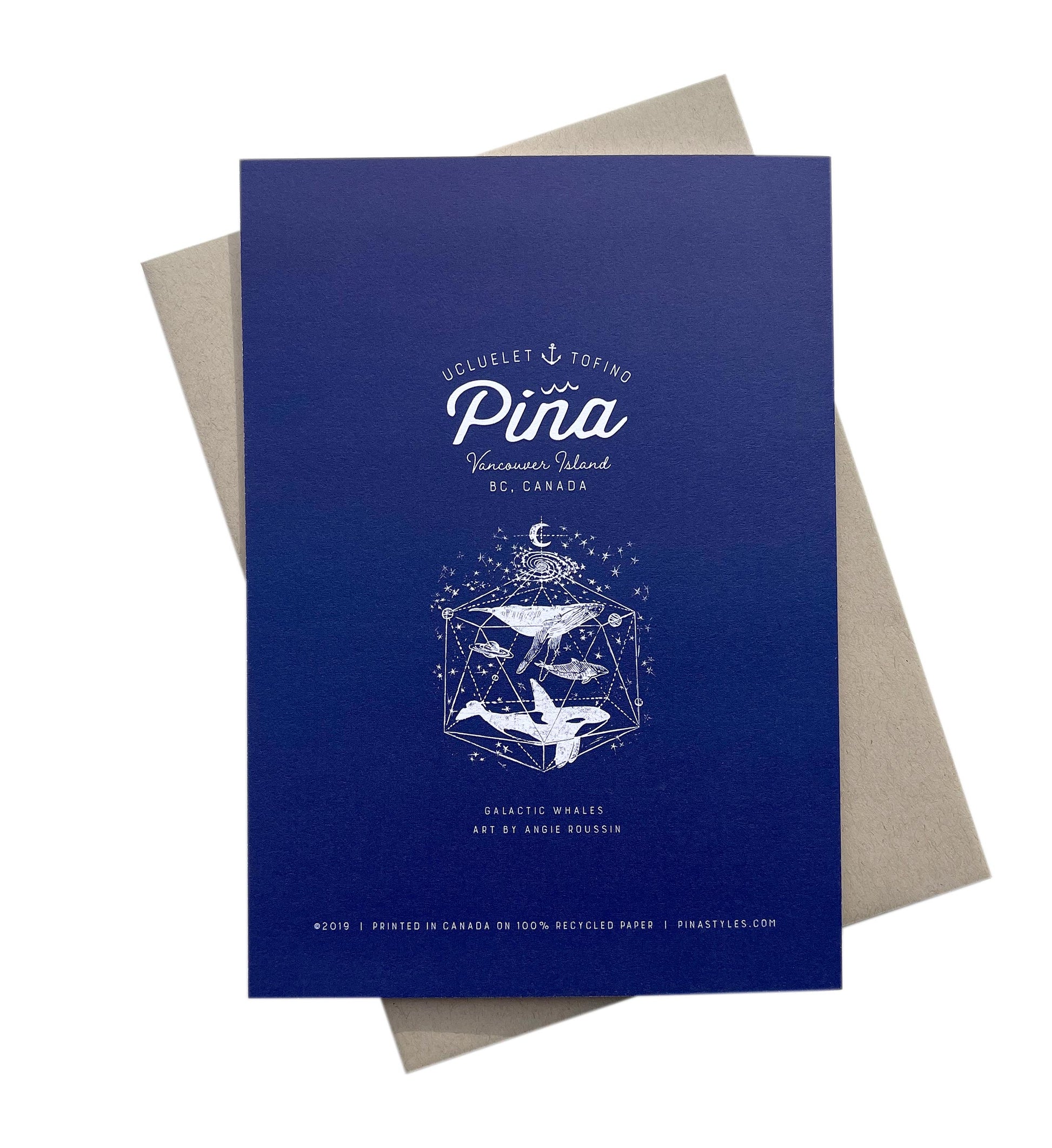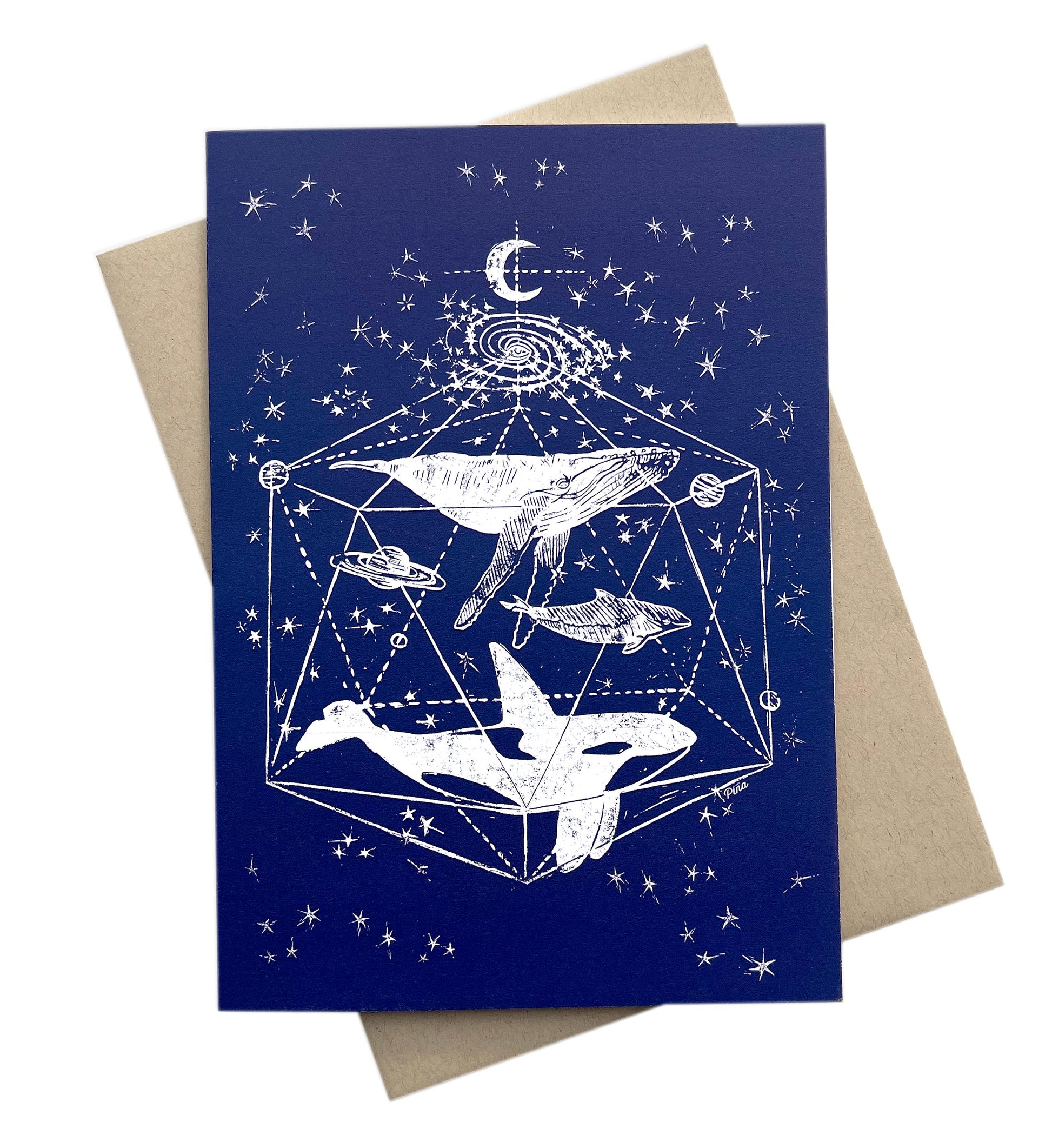 This greeting card features our Galactic Whales design beautifully printed in white and deep blue on a thick, soft recycled stock.