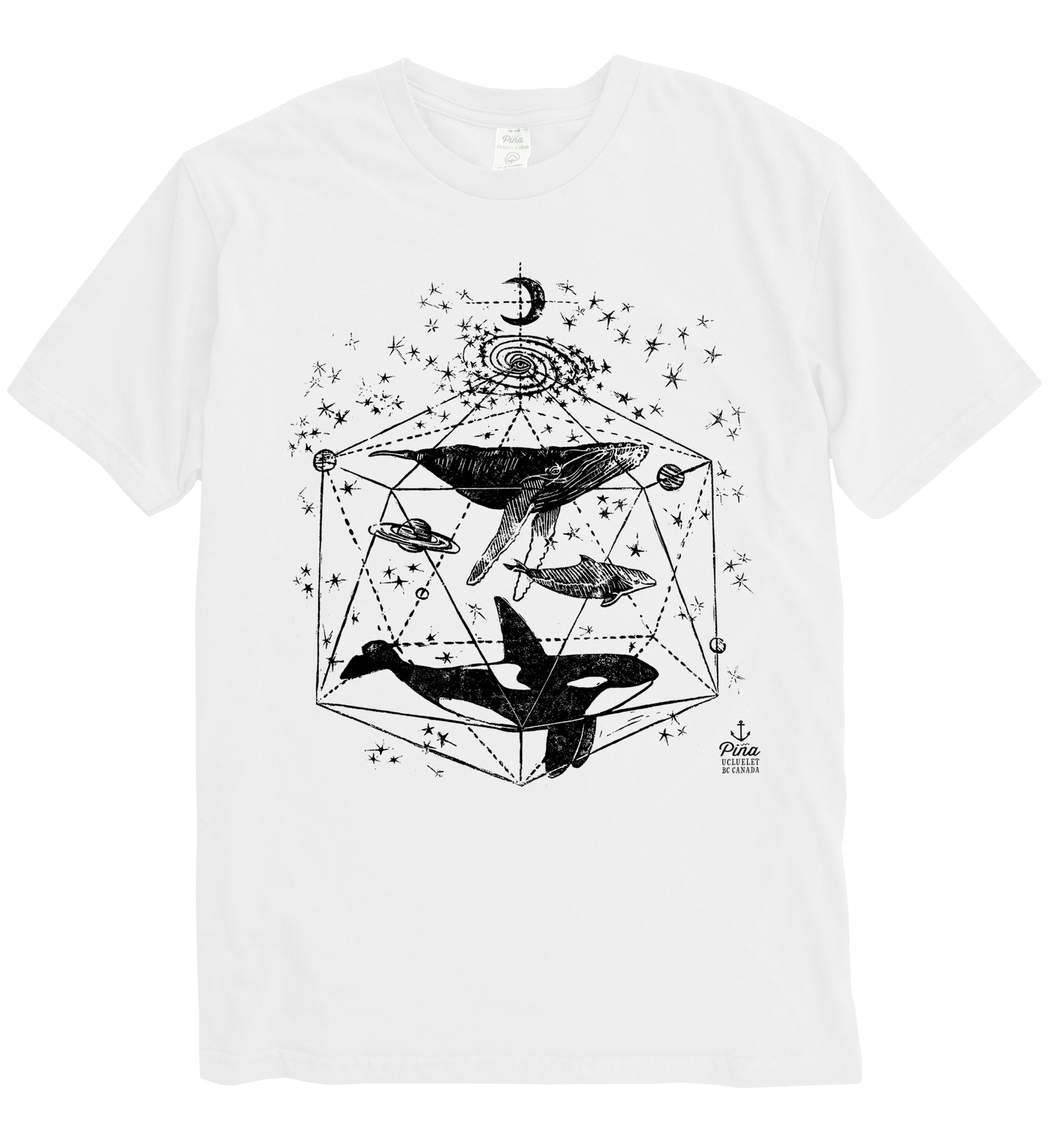 Our Galactic Whale design printed in black ink on the front of a 100% organic cotton unisex tee. This crewneck t-shirt is soft and comfortable with a flattering fit. Each shirt is made in Canada then custom printed by us in Ucluelet, just for you!
