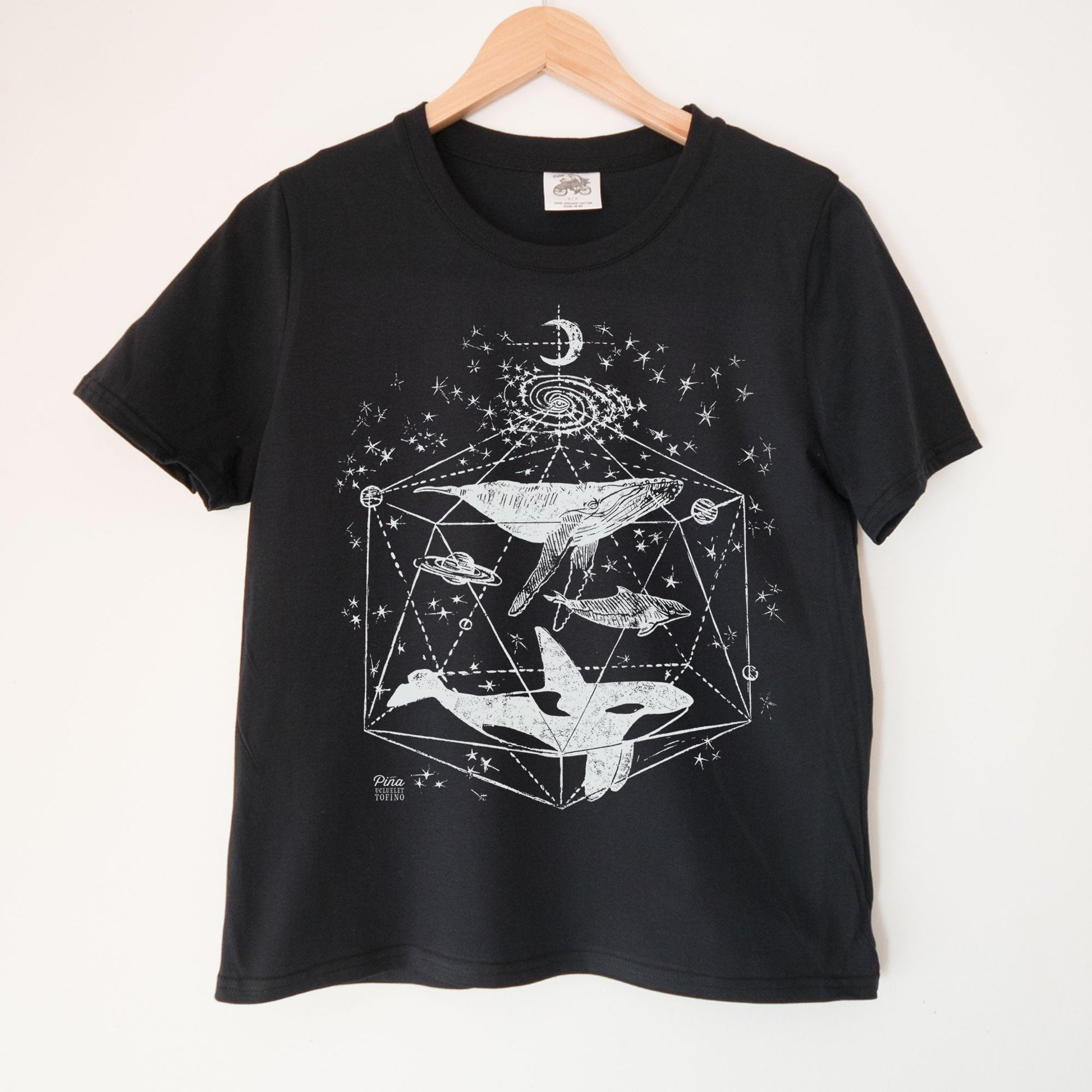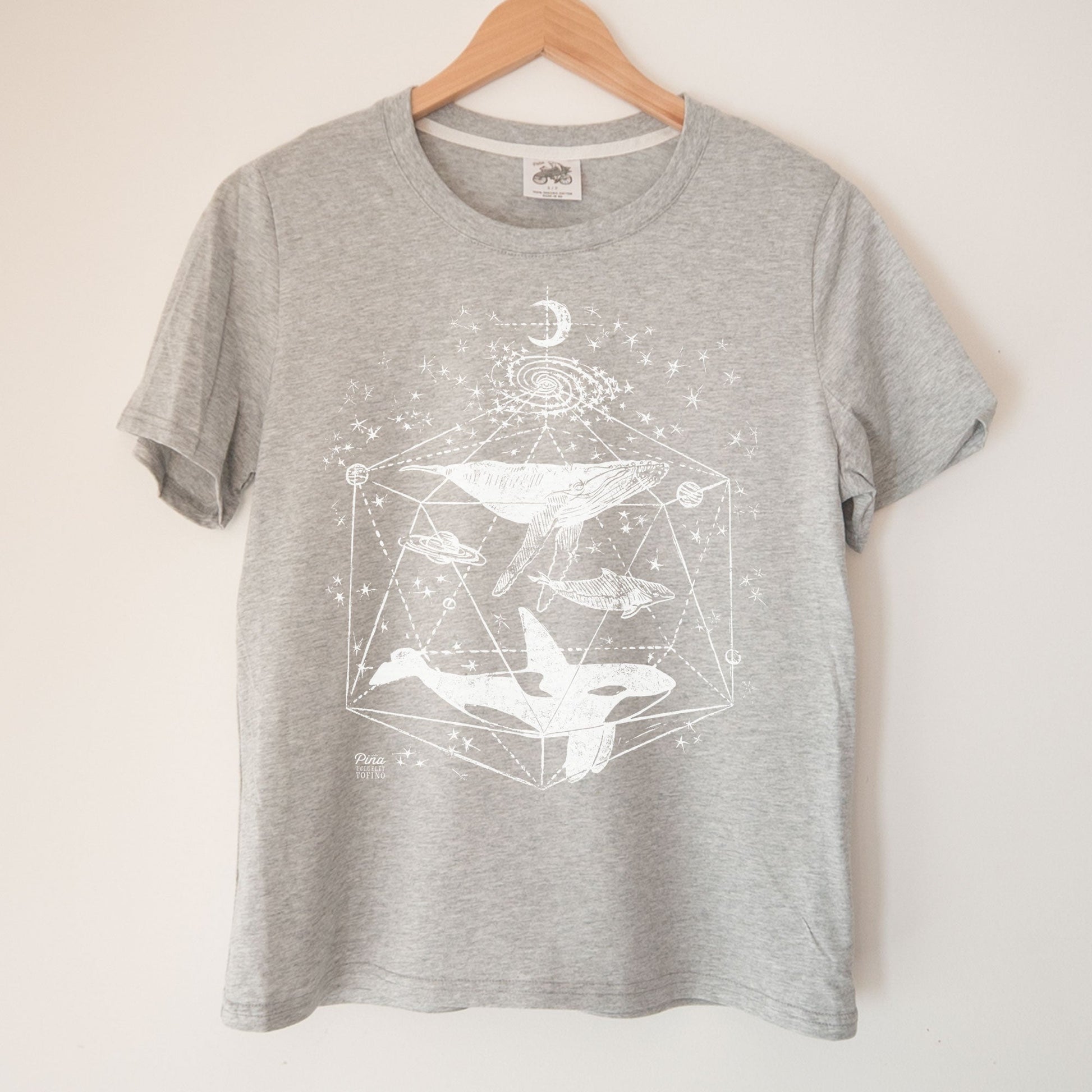 A soft and comfortable organic cotton ladies boxy tee printed with our beautiful Galactic Whales design, featuring a humpback, orca and porpoise swimming through the infinite oneness. The centre of the universe spirals out from the eye of consciousness projecting the shape of a dodecahedron–the 5th element or aether. Created as a lino carving this print retains the texture of the carving and printmaking process. A true work of love.
