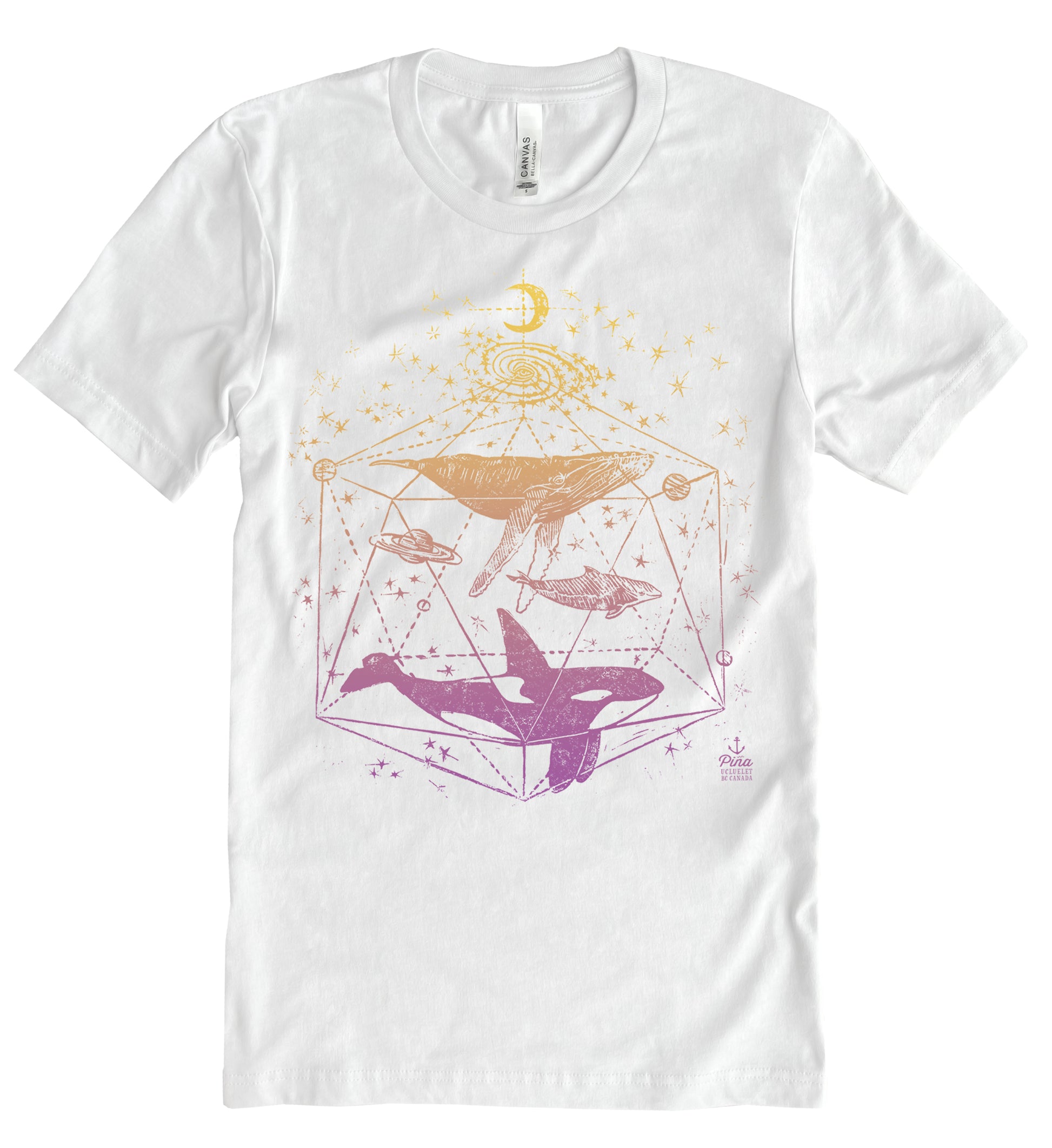 Our Galactic Whales printed in a beautiful purple and gold gradient on the front of a unisex, cotton jersey t-shirt. This crewneck t-shirt is soft and comfortable and made from 100% cotton. Each shirt is custom printed just for you!