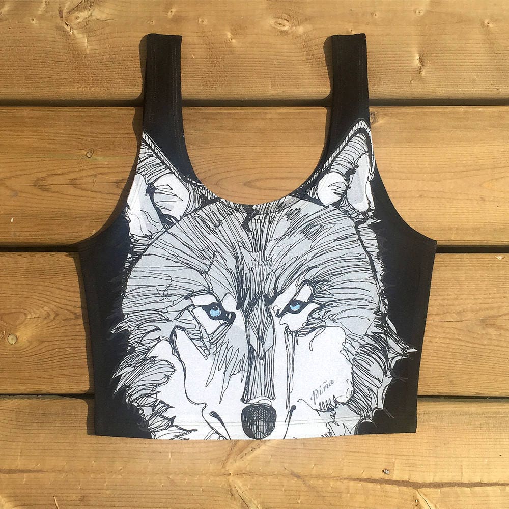 A cool grey wolf face with blue eyes printed on a long-line crop top! A summer wardrobe necessity!