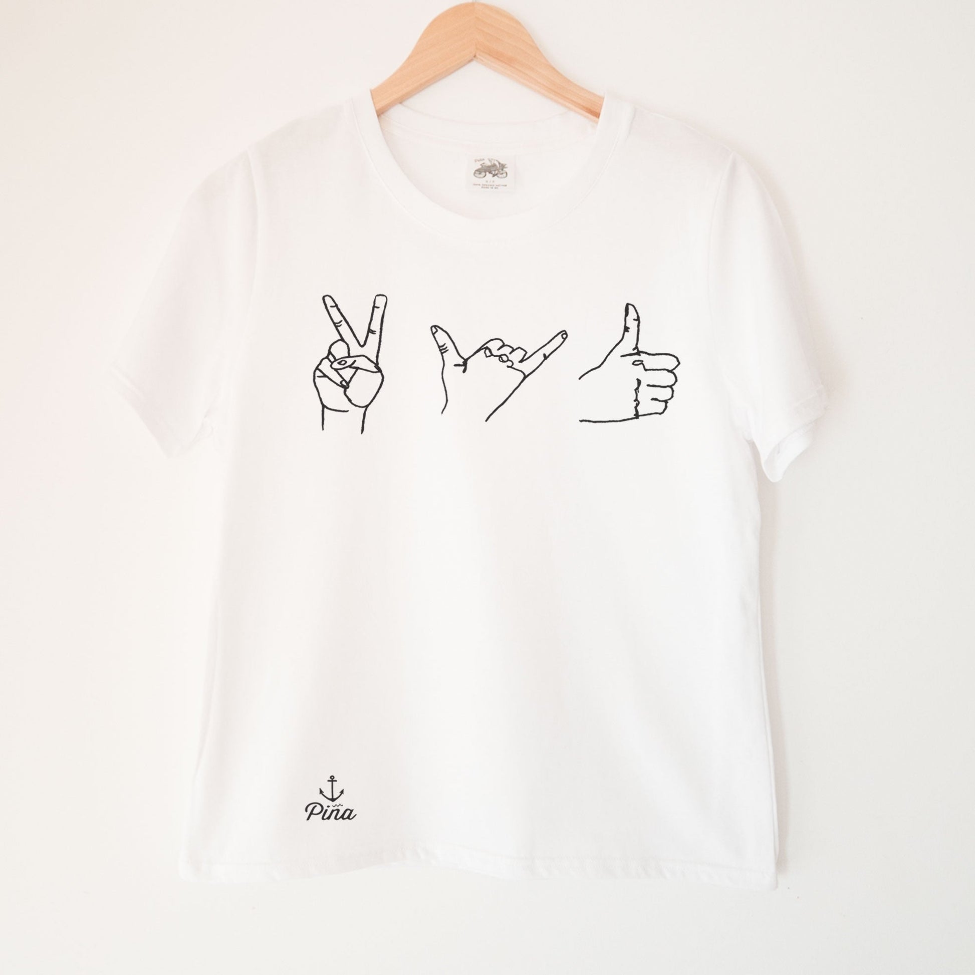 A soft and comfortable organic cotton ladies boxy tee printed with our Hand Signs design. Peace, hang loose, thumbs up, all good!