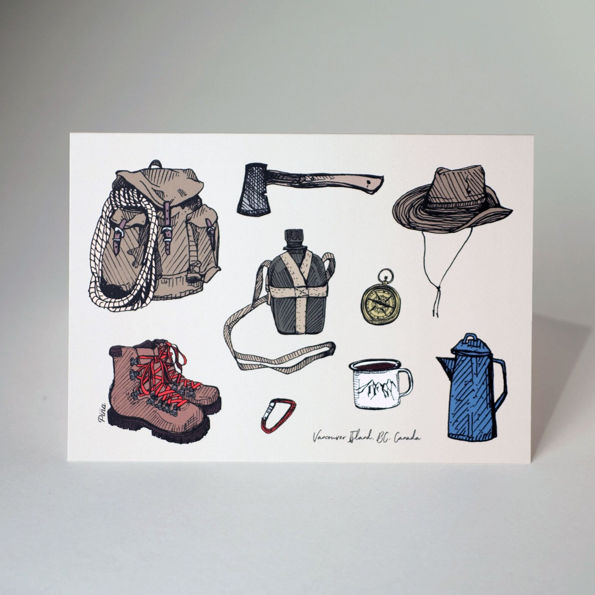 This greeting card features hiking gear of Vancouver Island on a beige background. If you’re leaving the sea and heading to the hills, be sure to bring these things! Mountain people stuff. Ink drawings.