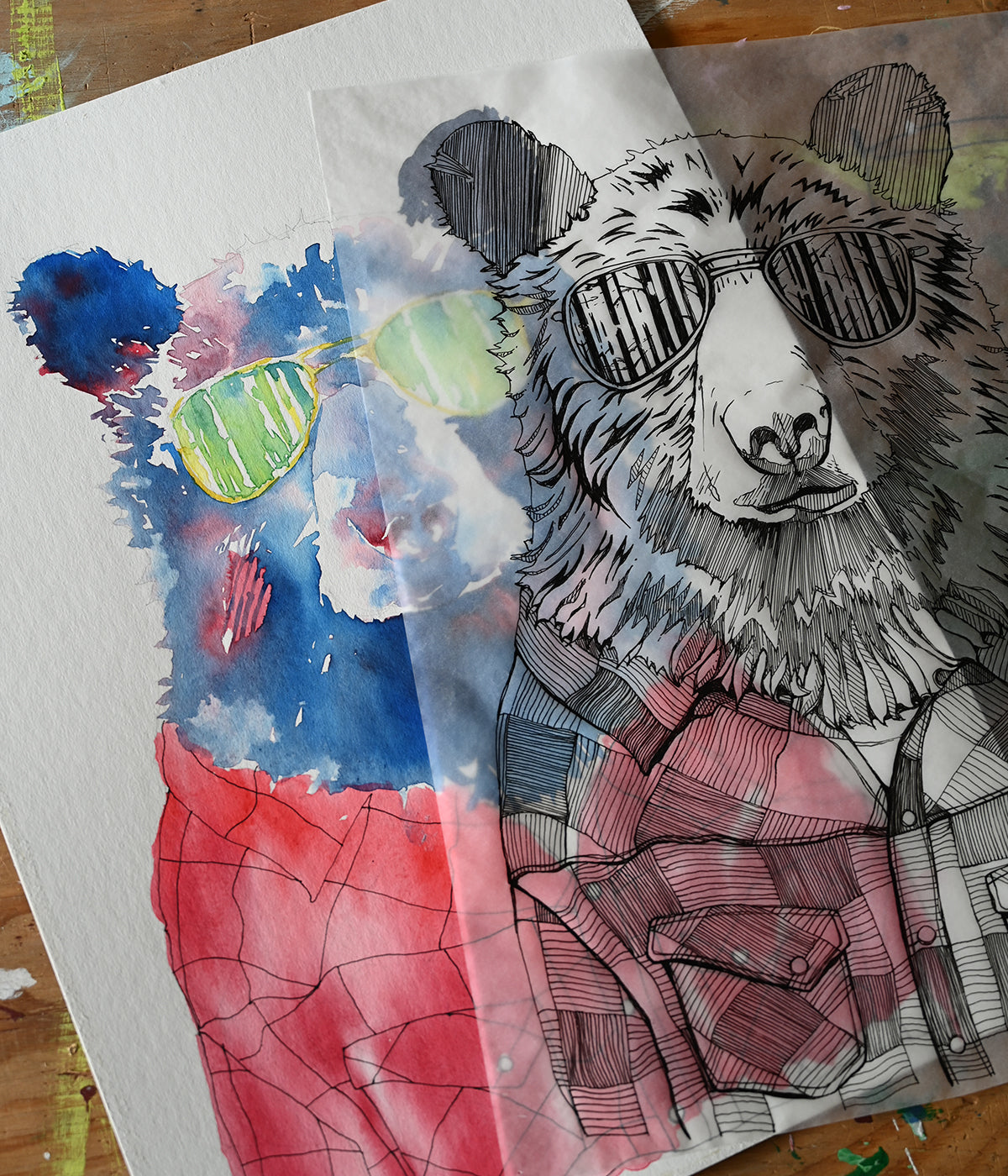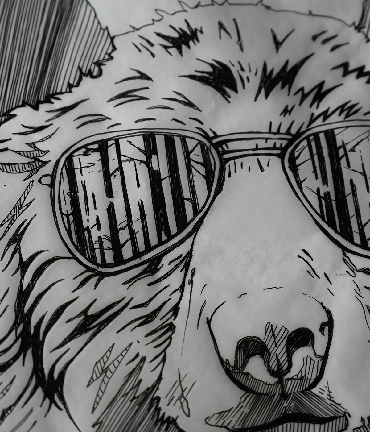 Enjoy our popular Hipster Bear design. A black bear sports a lumberjack flannel and some reflective shades showing us a glimpse of the dense forest around him. Created with watercolour and black ink pen this detailed design is bold and detailed yet gestural and relaxed–a PNW classic.