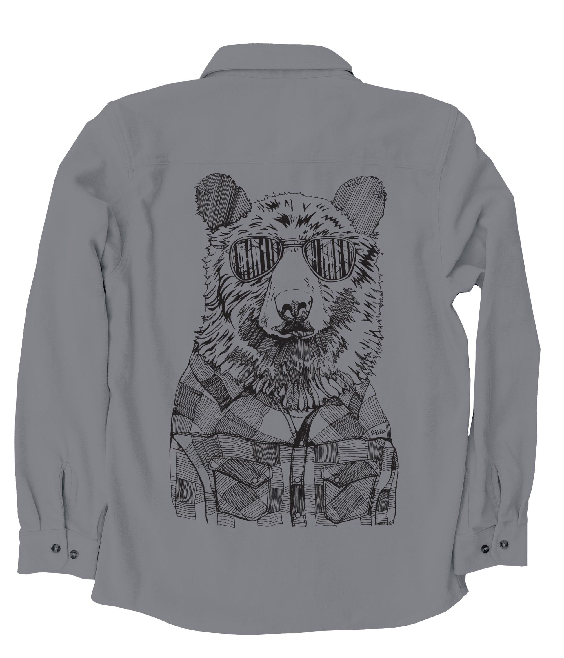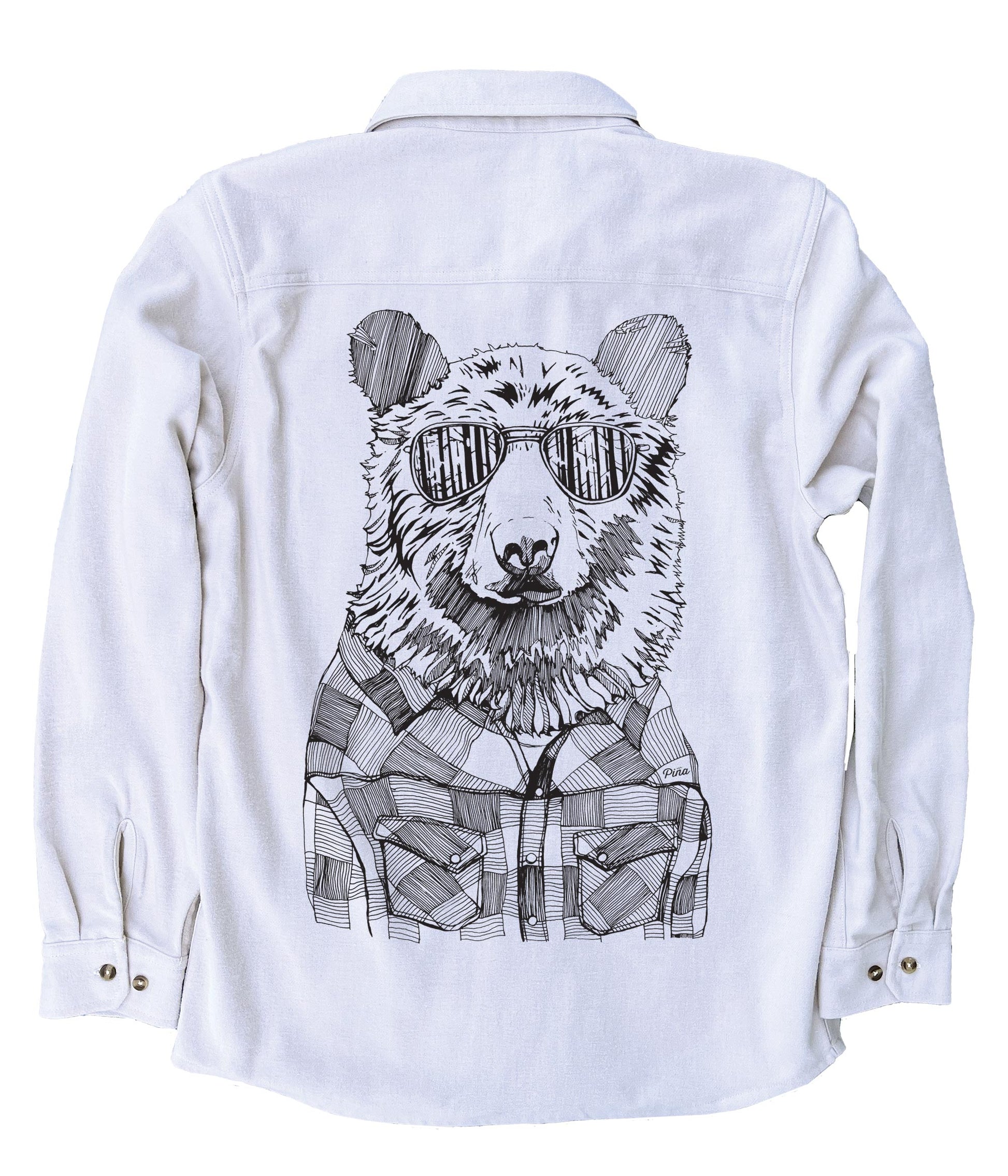 This soft and comfortable unisex flannel is printed with our Hipster Bear design in black line on the back and a hemlock tree on the front pocket. Our 100% organic cotton flannels are high quality–designed by us and manufactured in small runs in Vancouver.• 100% organic cotton