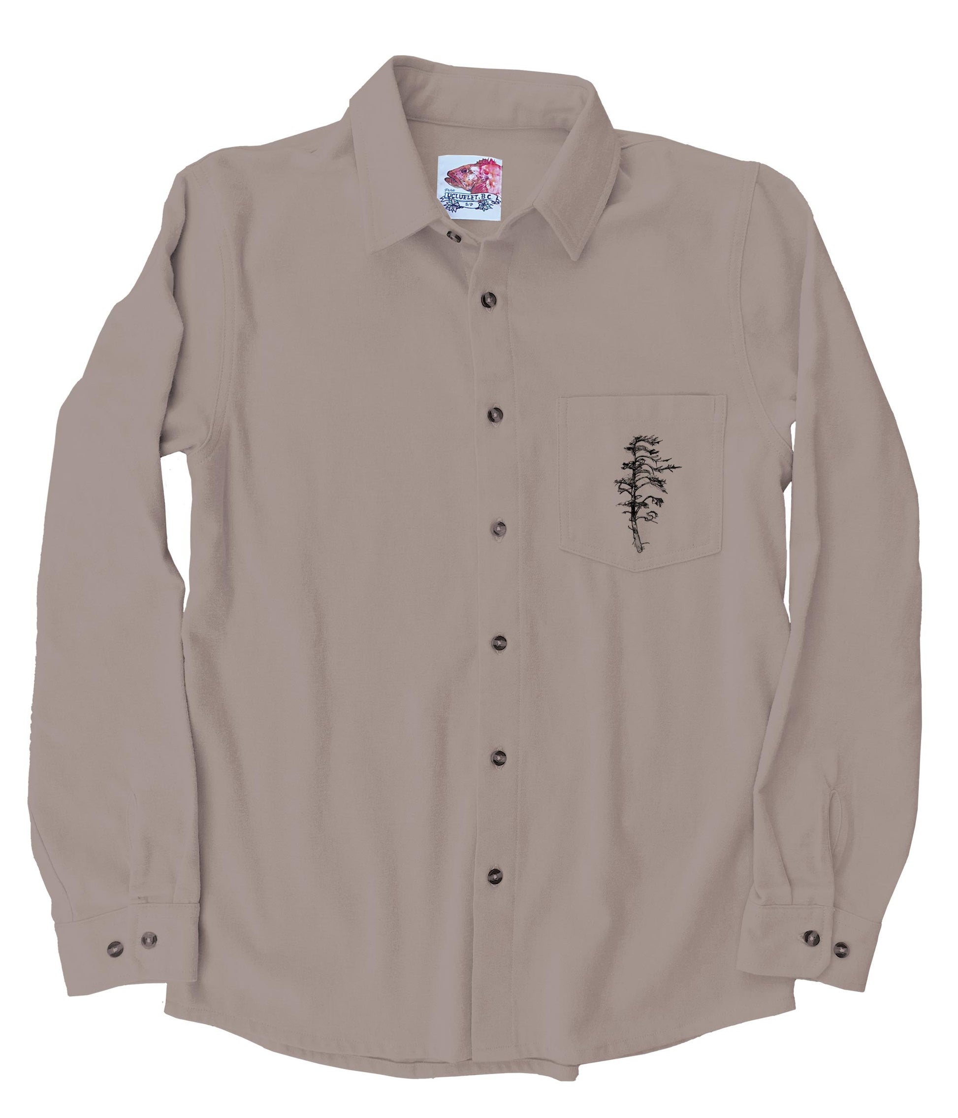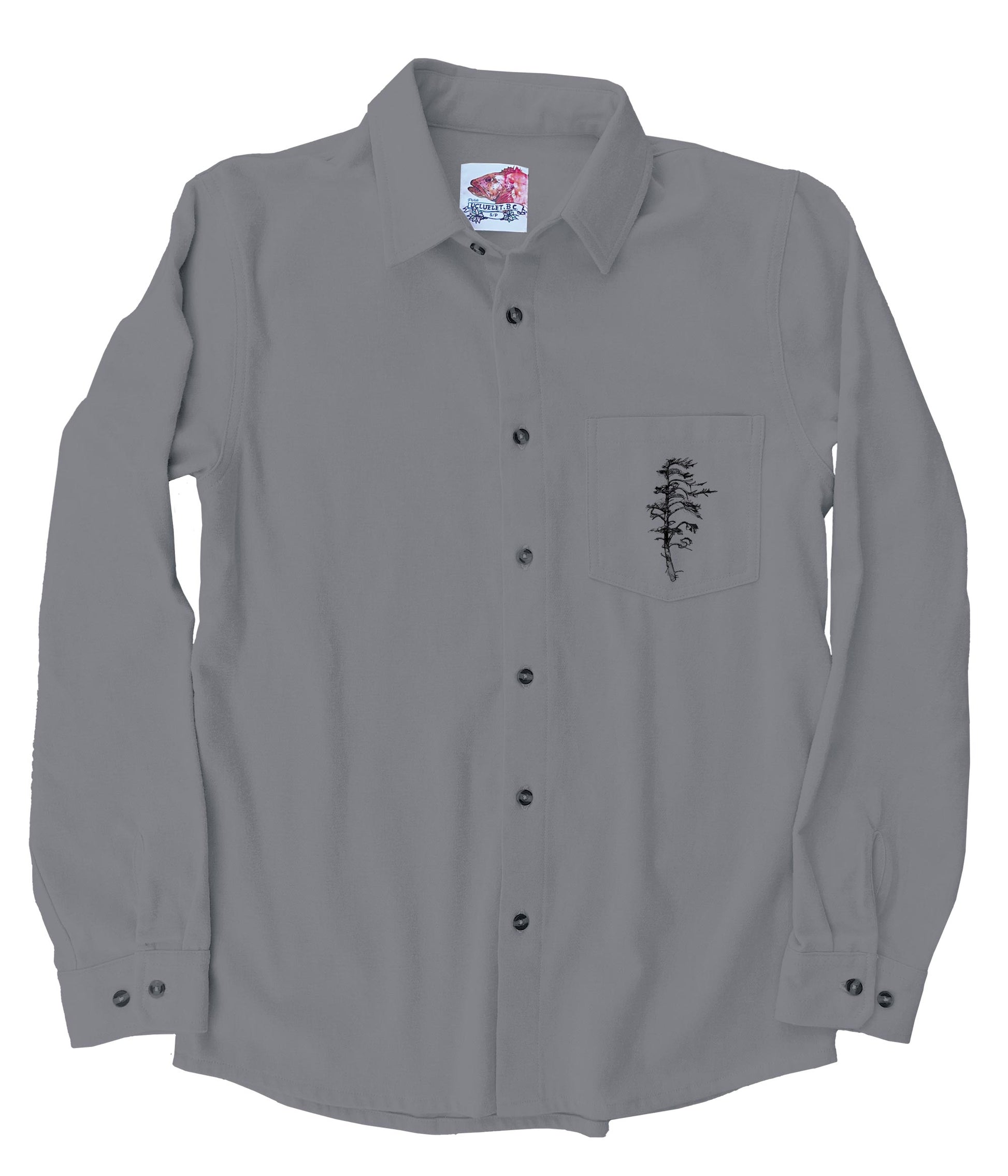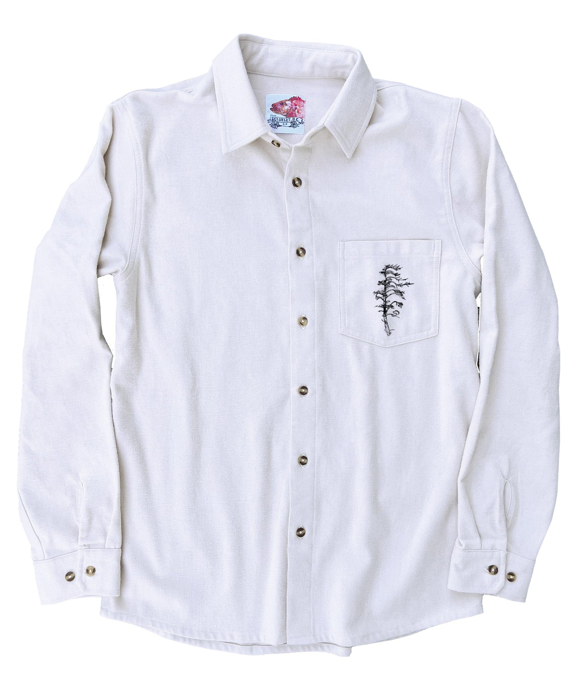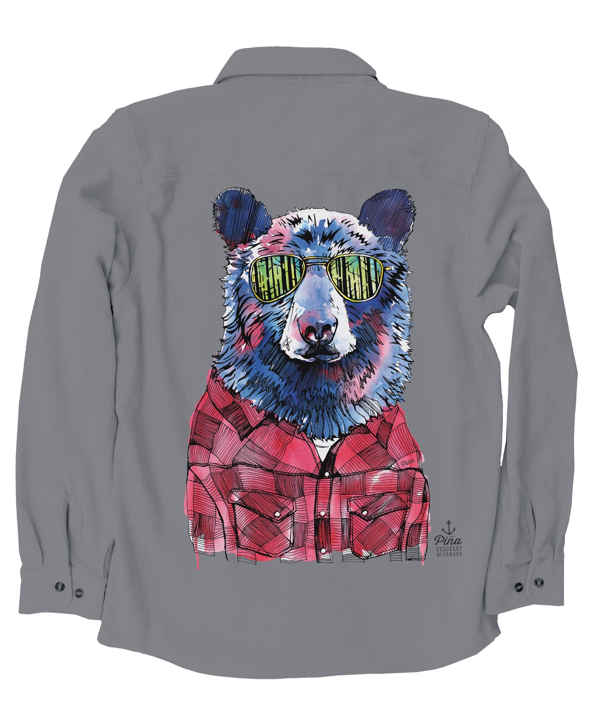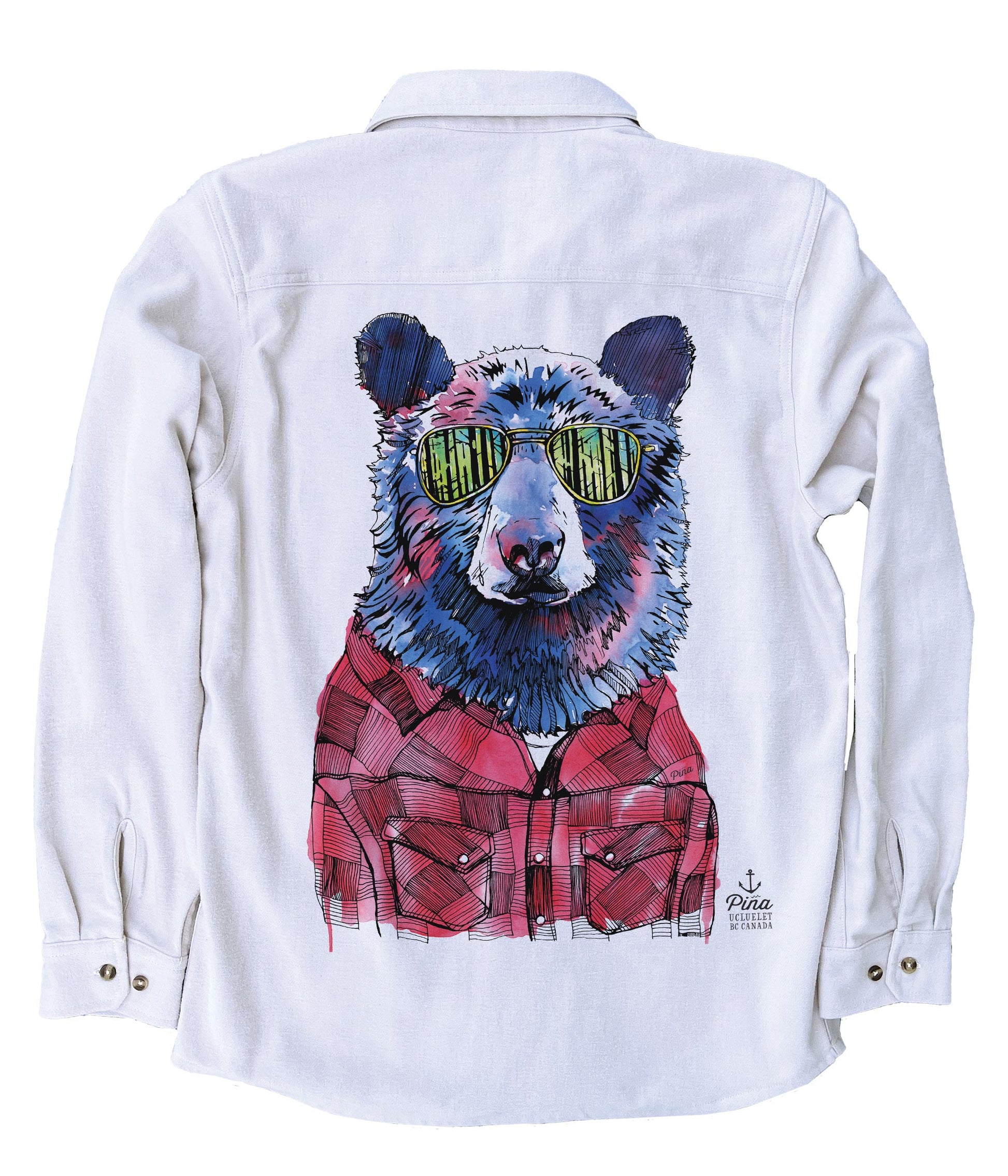 This soft and comfortable unisex flannel is printed with our Hipster Bear design in full colour on the back and a black hemlock tree on the front. Our 100% organic cotton flannels are high quality–designed by us and manufactured in small runs in Vancouver.