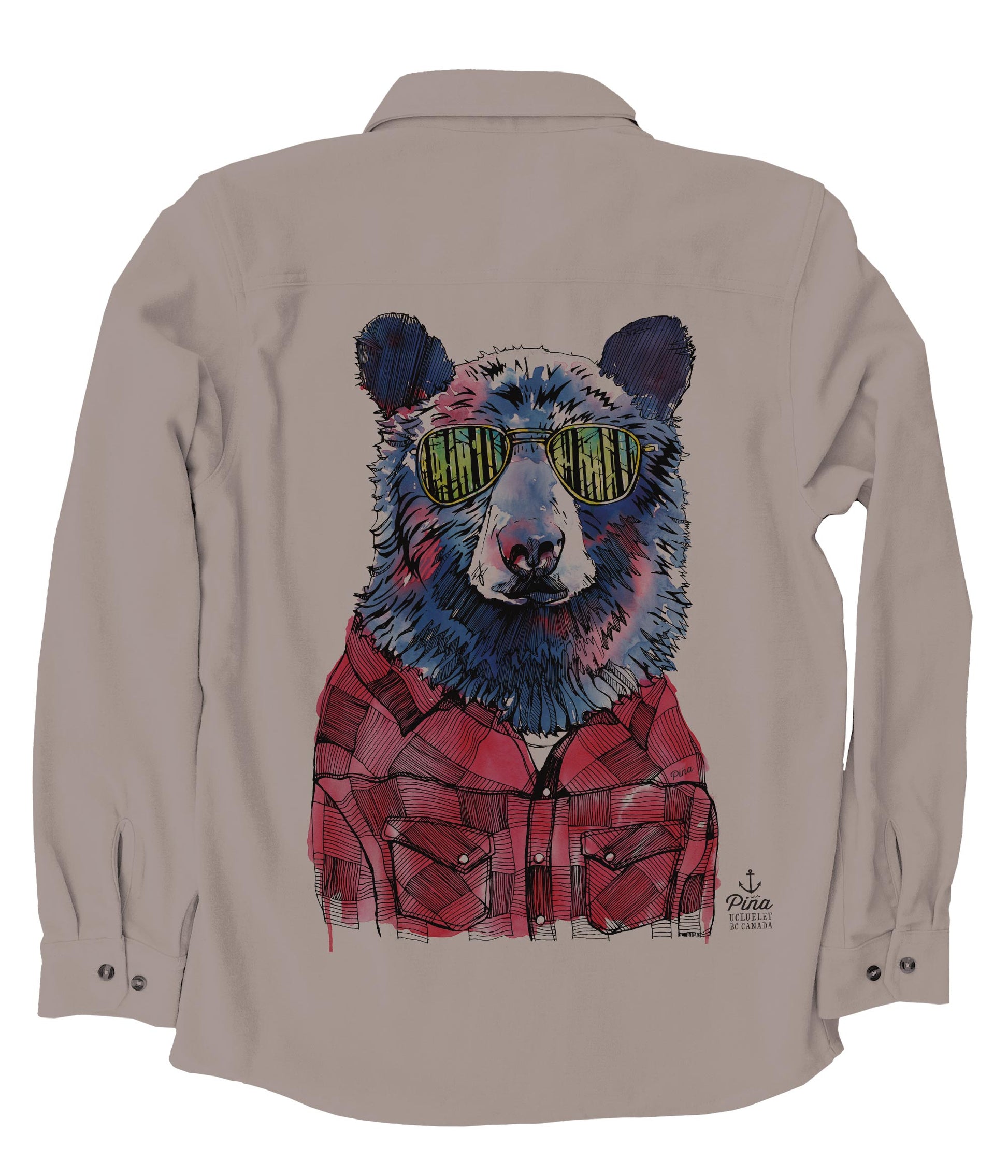 A black bear sports a lumberjack flannel and some reflective shades showing us a glimpse of the dense forest surrounding him-a Pacific Northwest classic.