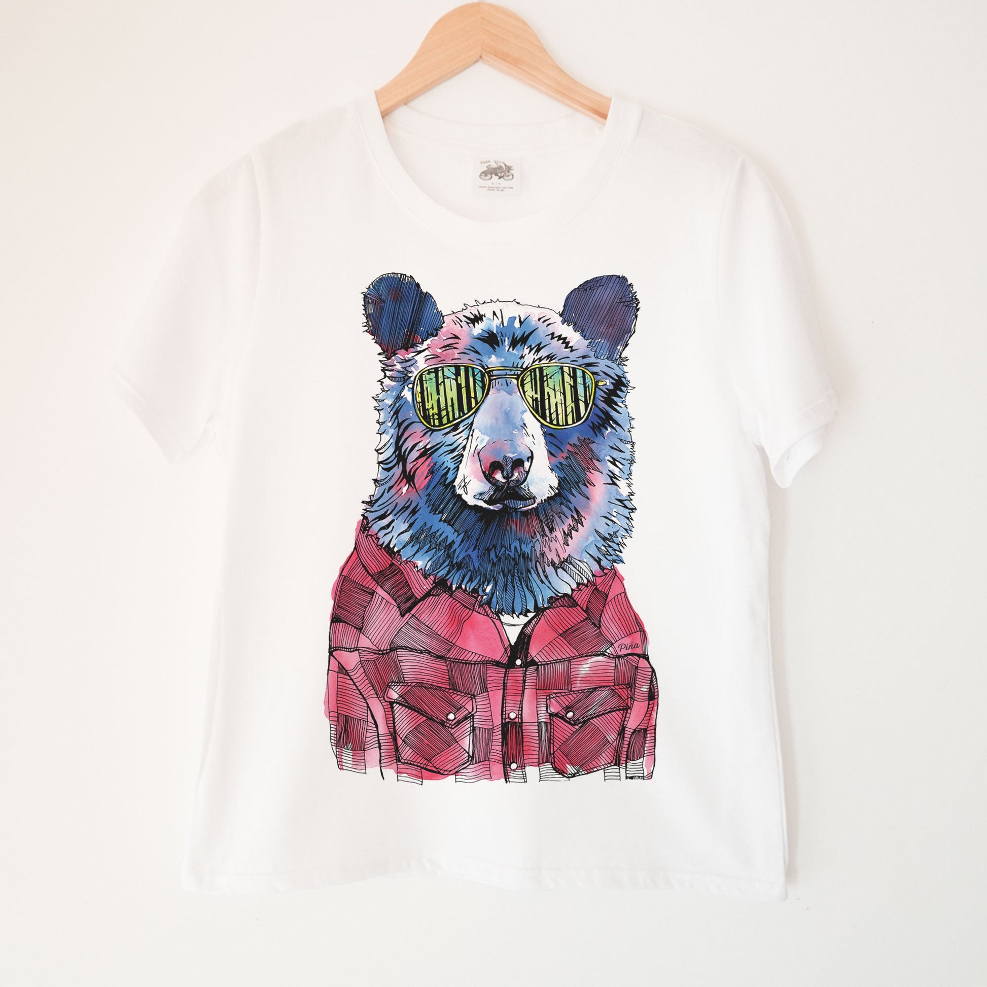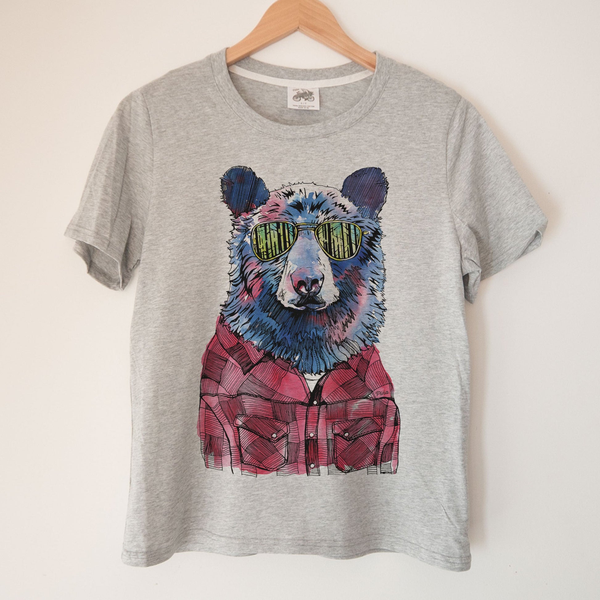 A soft and comfortable organic cotton ladies boxy tee printed with our popular Hipster Bear design. A black bear sports a lumberjack flannel and some reflective shades showing us a glimpse of the dense forest–a pnw classic.
