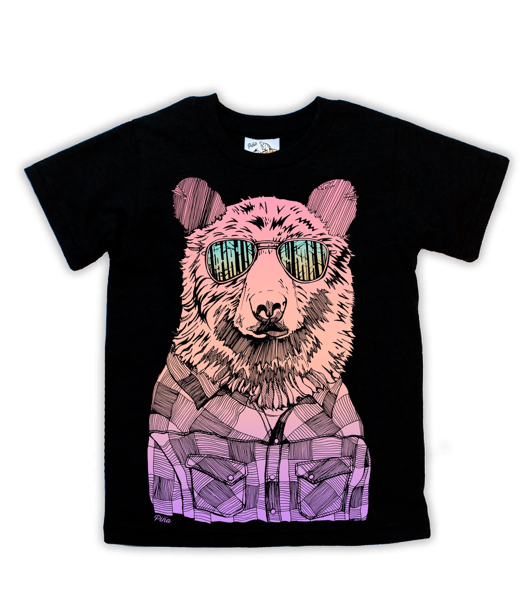 A soft and comfortable kids tee printed with our popular Hipster Bear design. A black bear sports a lumberjack flannel and some reflective shades showing us a glimpse of the dense forest-a pnw classic.