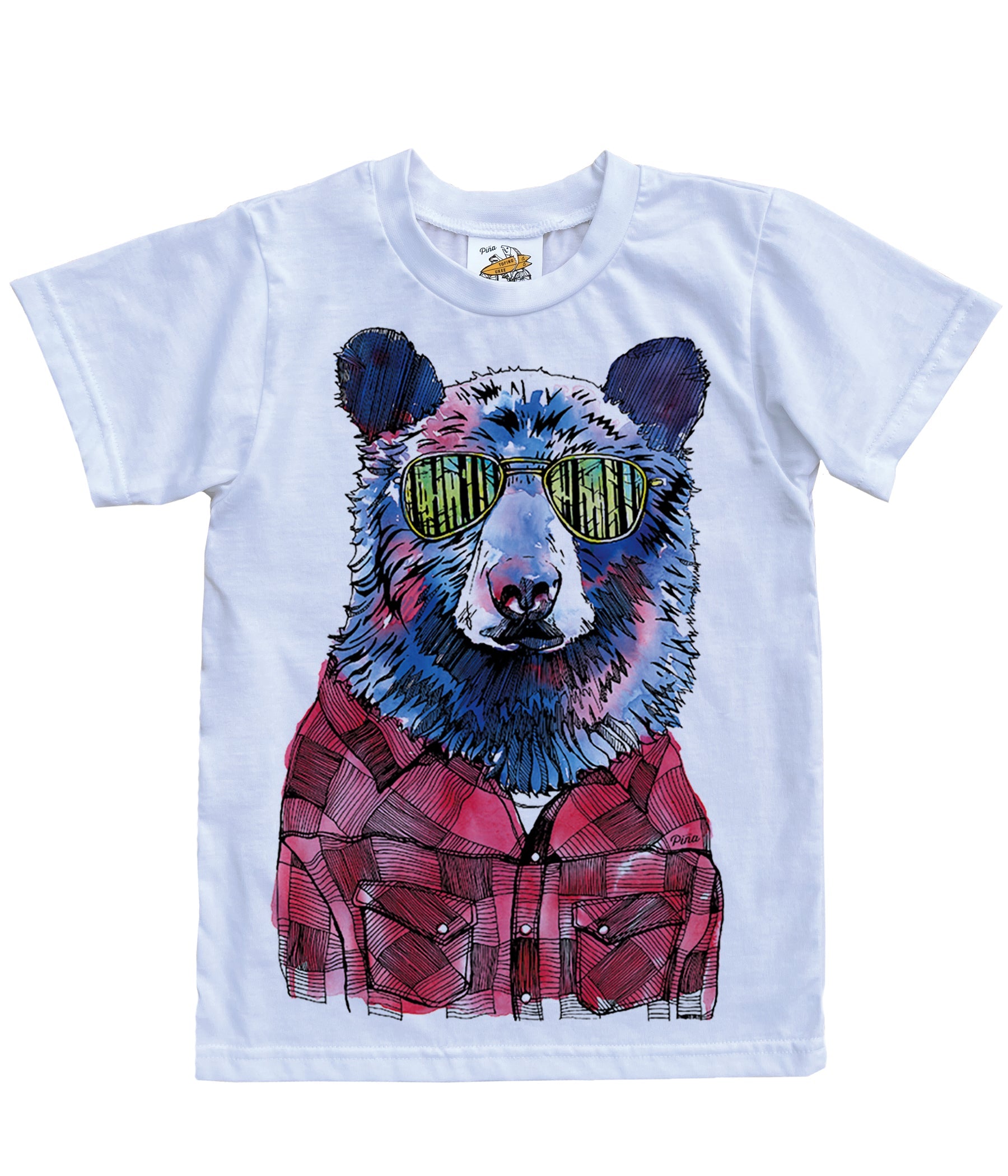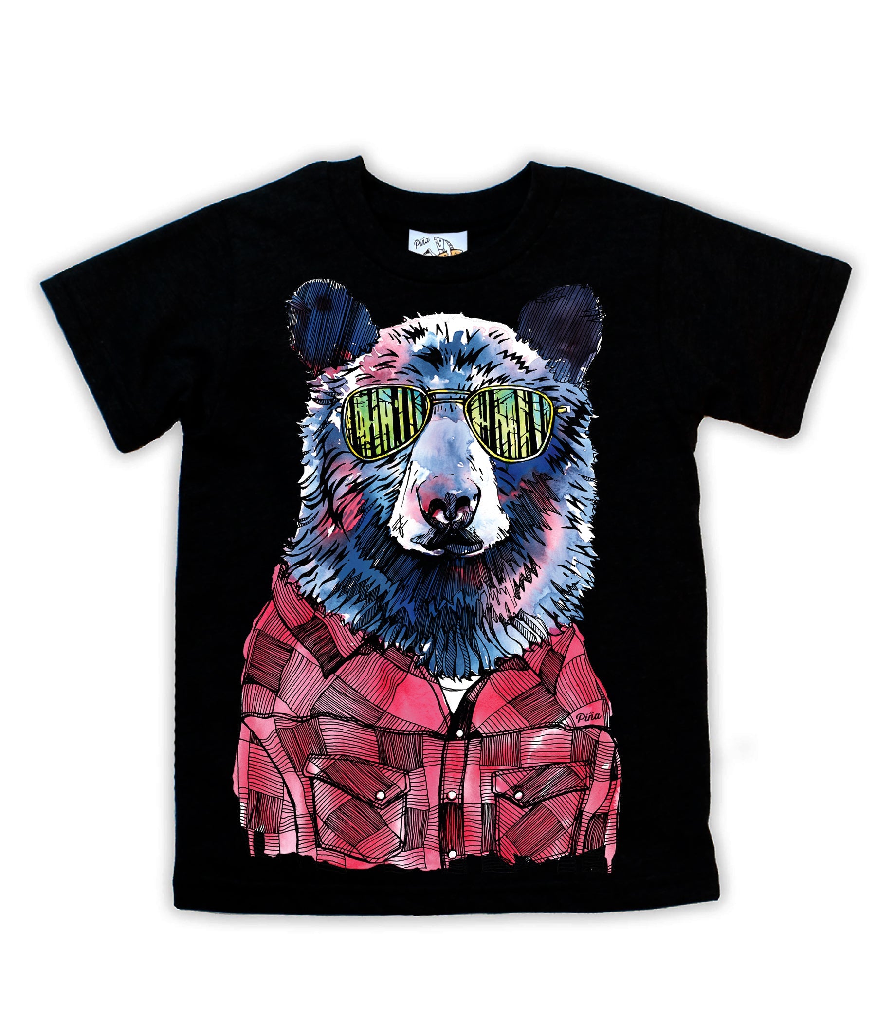 Our popular Hipster Bear design printed on a organic cotton kids tee. A black bear sports a lumberjack flannel and some reflective shades showing us a glimpse of the dense forest. A Pacific Northwest classic.