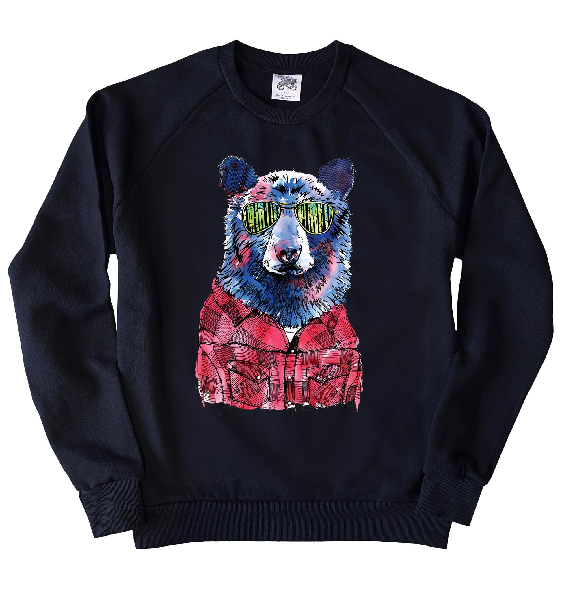 Our Hipster Bear design printed in full colour on the front of a unisex crewneck sweatshirt.