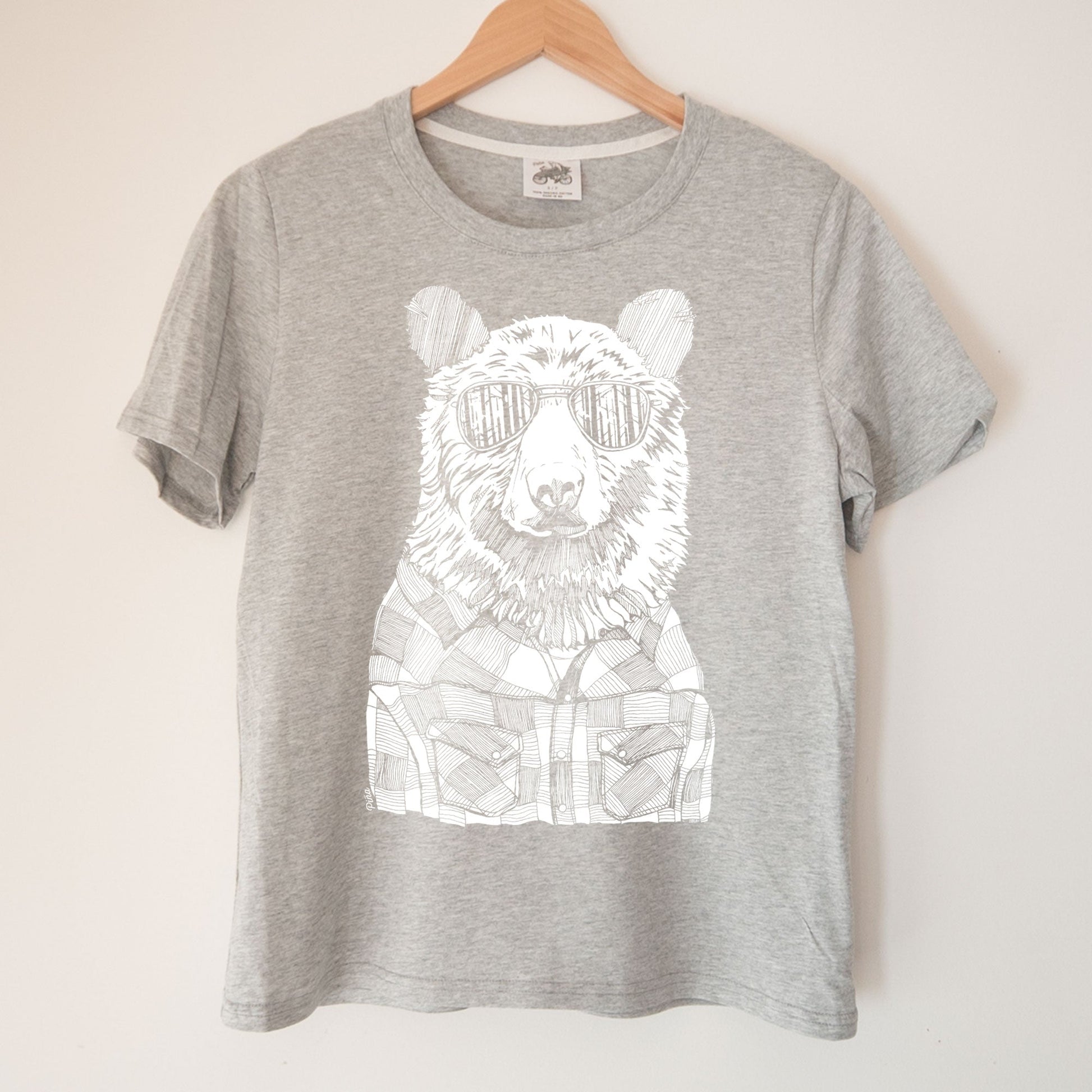 A soft and comfortable organic cotton ladies boxy tee printed with our popular Hipster Bear design. A black bear sports a lumberjack flannel and some reflective shades showing us a glimpse of the dense forest–a pnw classic.