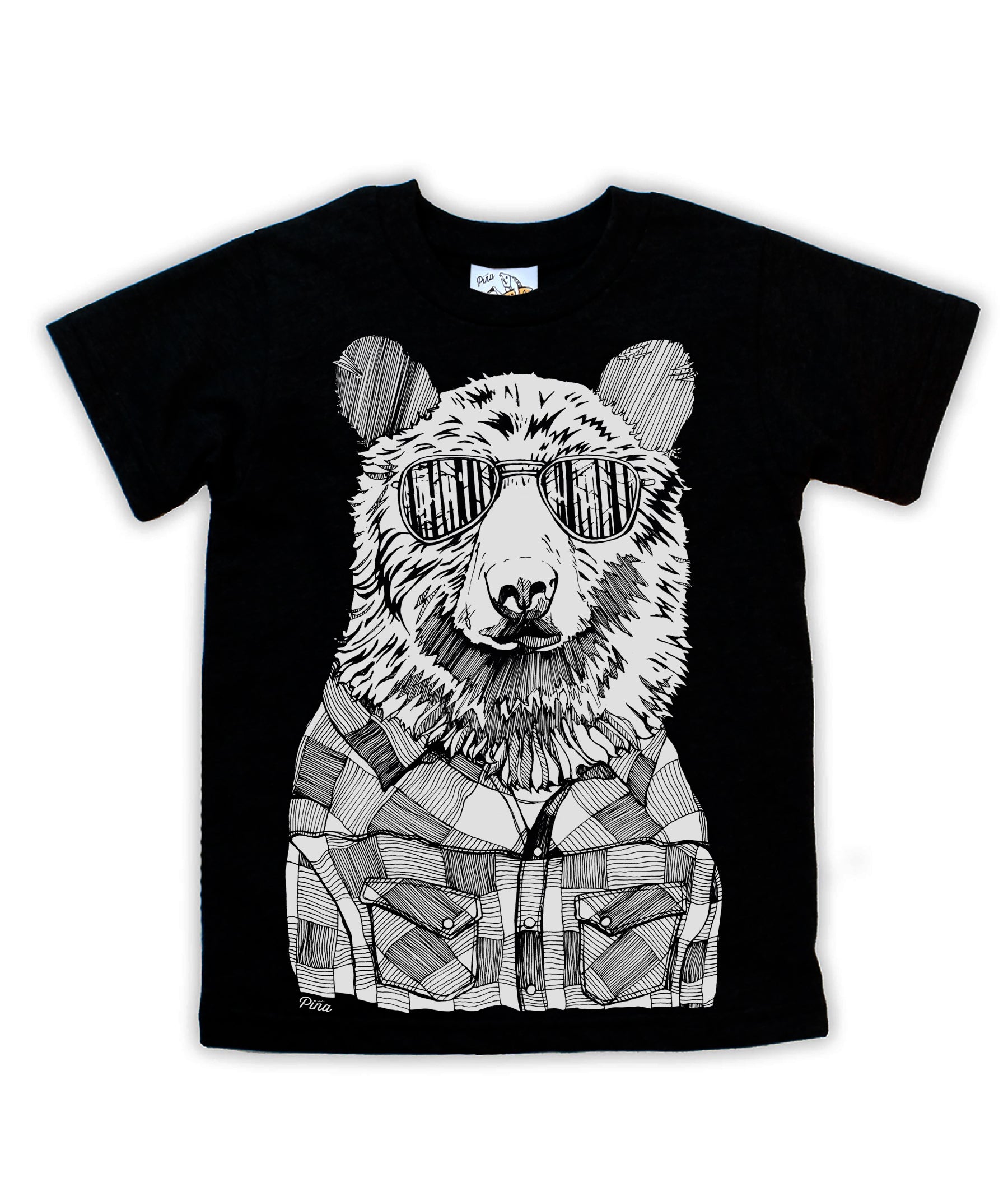 A soft and comfortable kids tee printed with our popular Hipster Bear design. A black bear sports a lumberjack flannel and some reflective shades showing us a glimpse of the dense forest-a pnw classic.