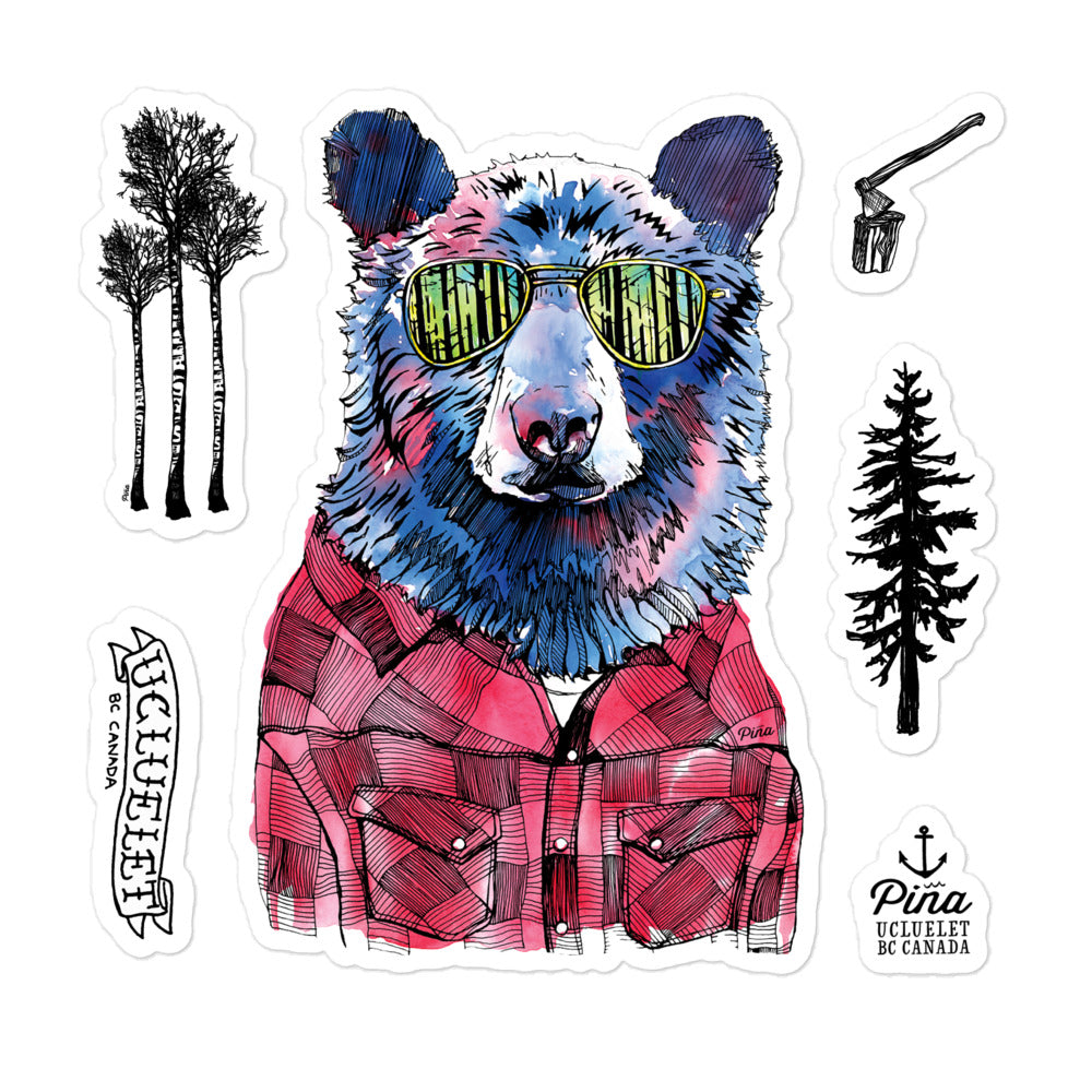 A durable, high opacity adhesive vinyl sticker featuring our popular Hipster Bear design. A black bear sports a lumberjack flannel and some reflective shades showing us a glimpse of the dense forest. Created with watercolour and black ink pen this detailed design is bold and detailed yet gestural and relaxed–a pnw classic.