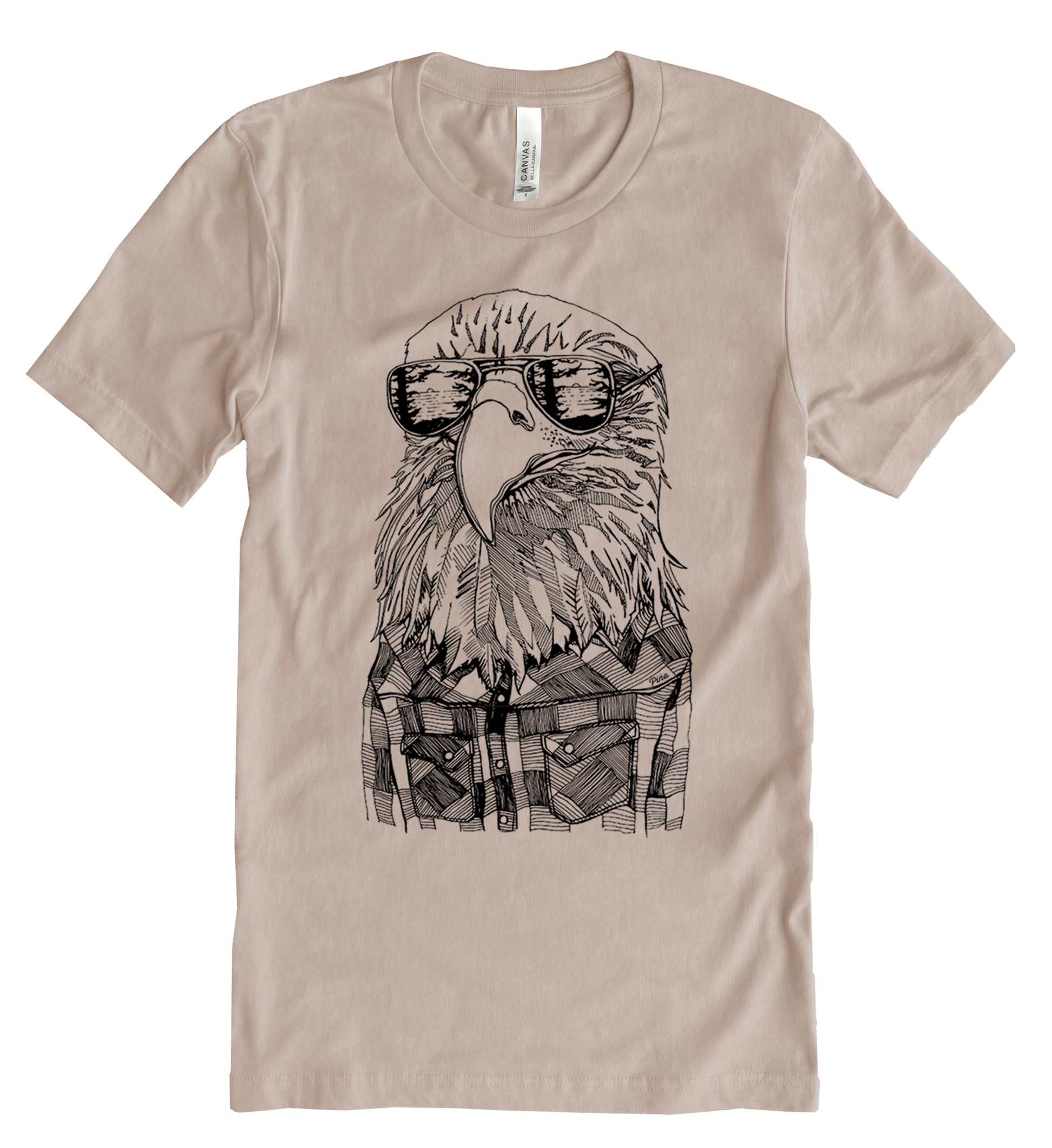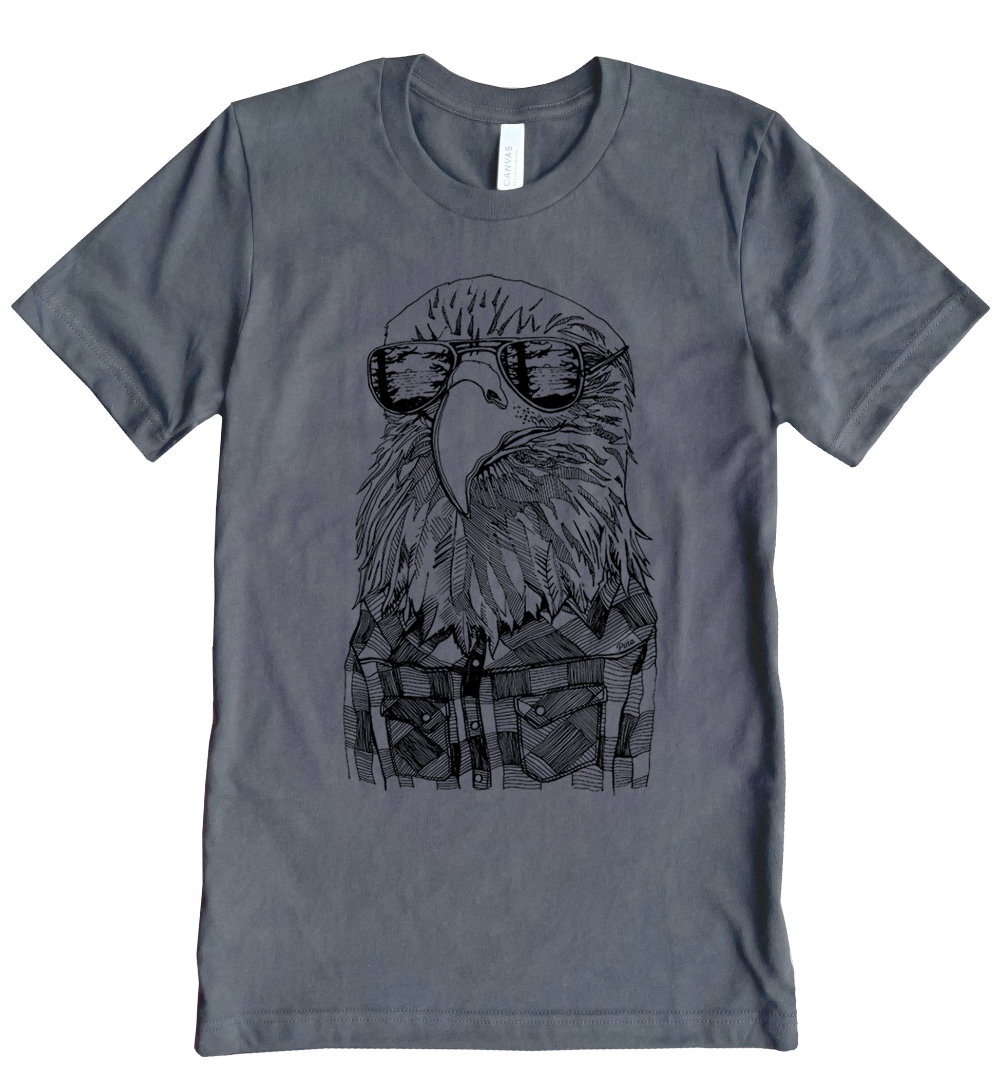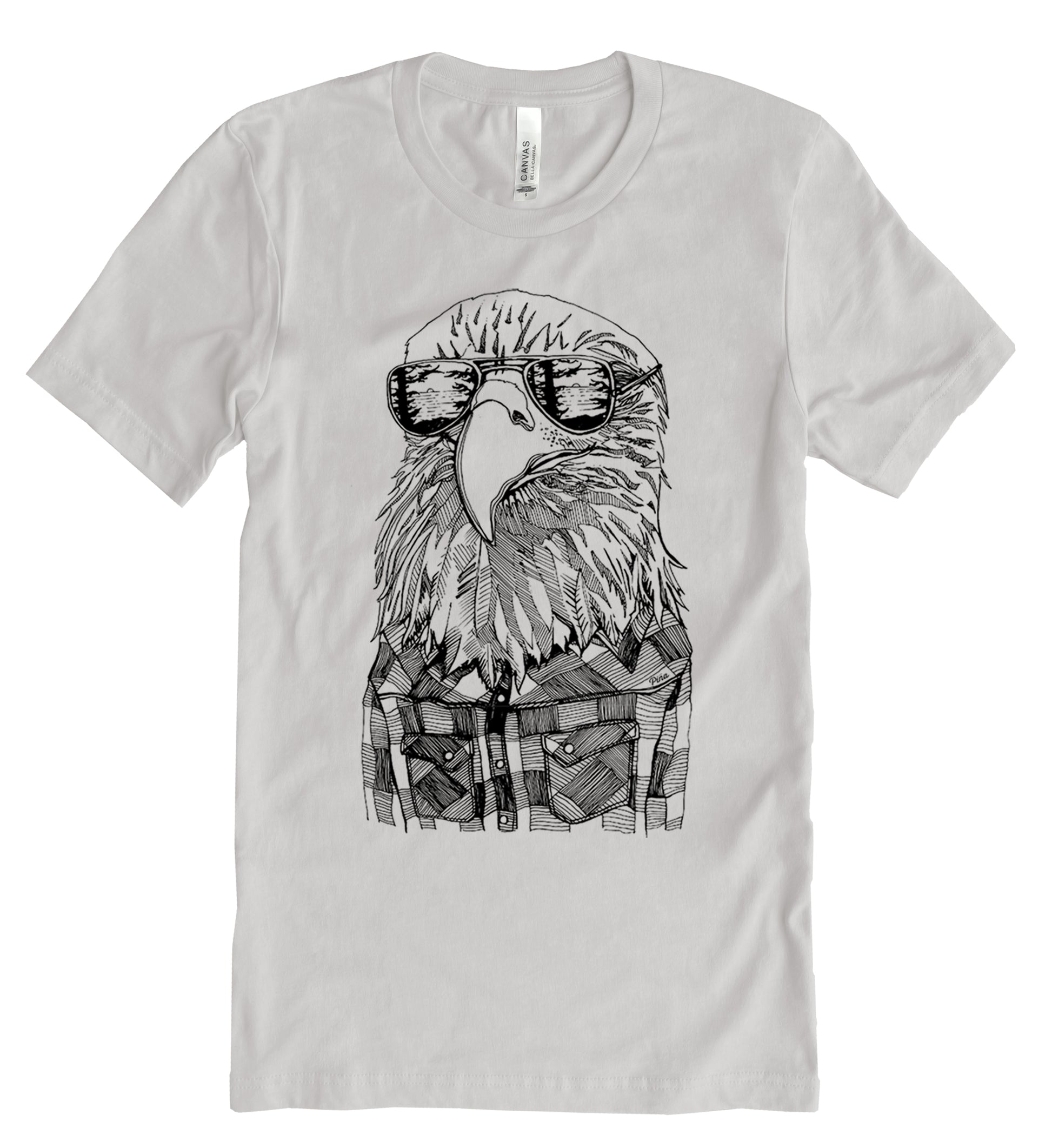 Our classic Hipster Eagle design printed in black ink on the front of a unisex, cotton jersey t-shirt. This king predator wears reflective shades and a classic flannel to stay warm yet cool in the Pacific North West.
