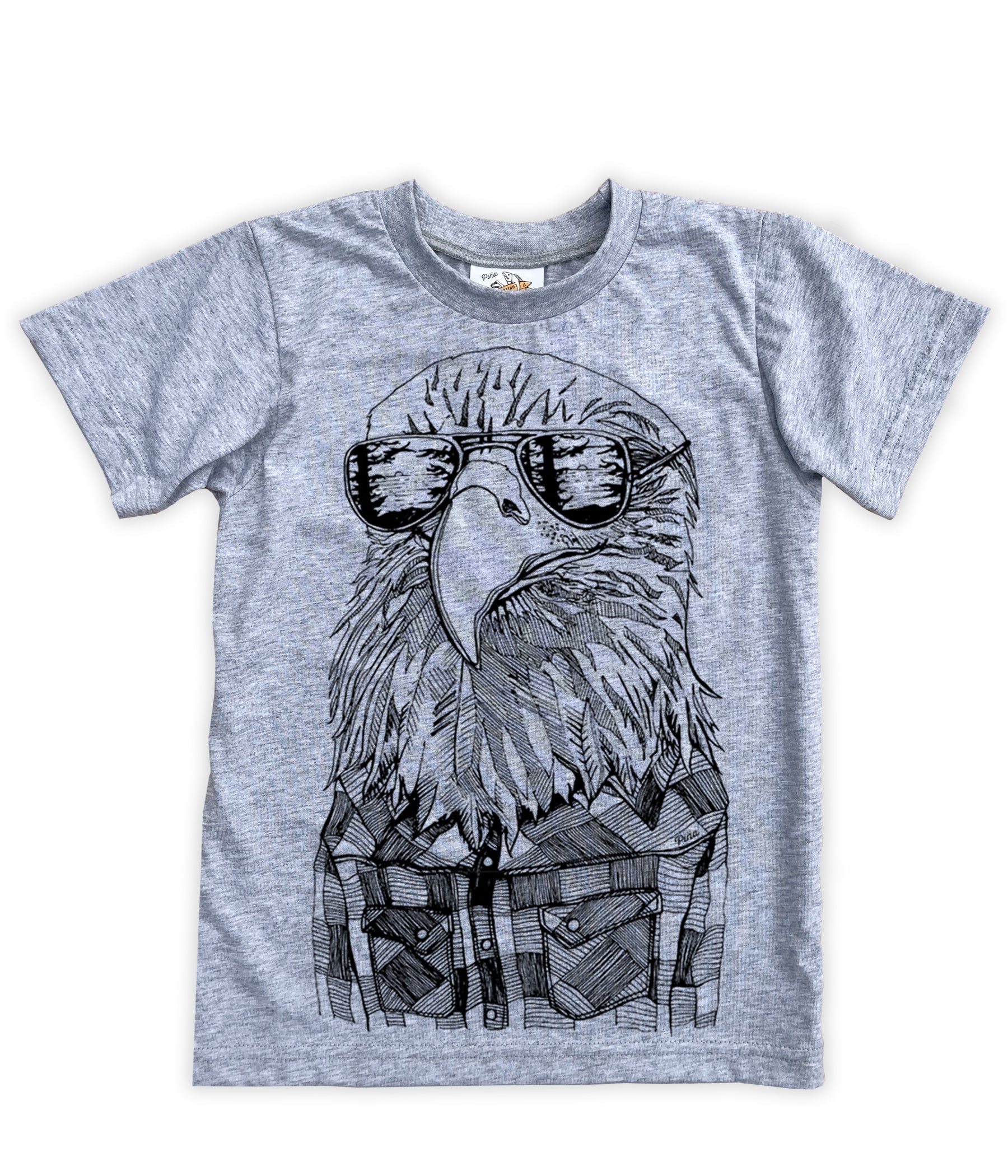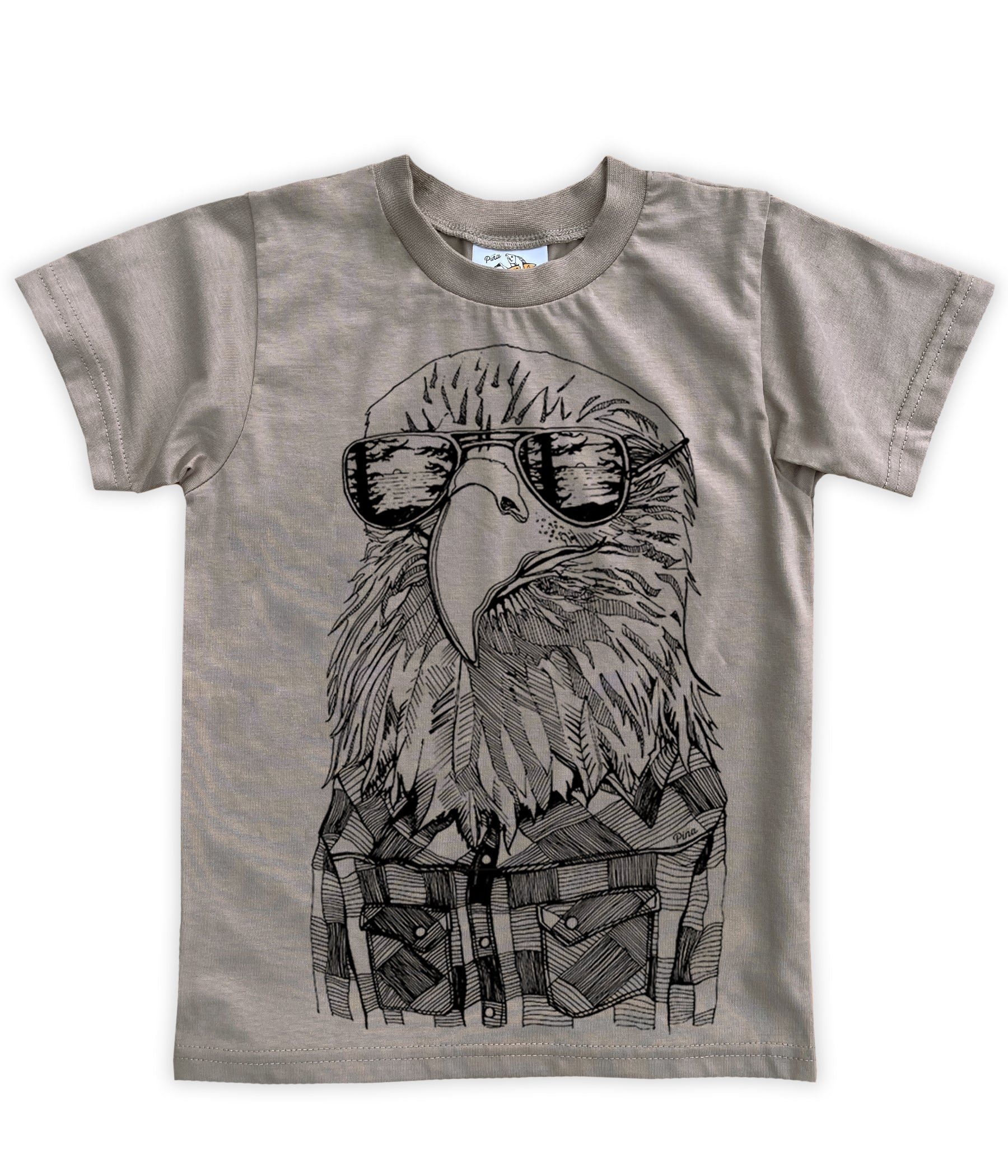 A soft and comfortable kids tee printed with our good times Hipster Eagle design. This king predator takes a moment to chill out and take in the view as the sun sets over the great Pacific. The tree silhouettes reflected in his shades give us a glimpse of the rugged coast where he resides. He wears a classic flannel to stay warm yet cool in the Pacific North West.