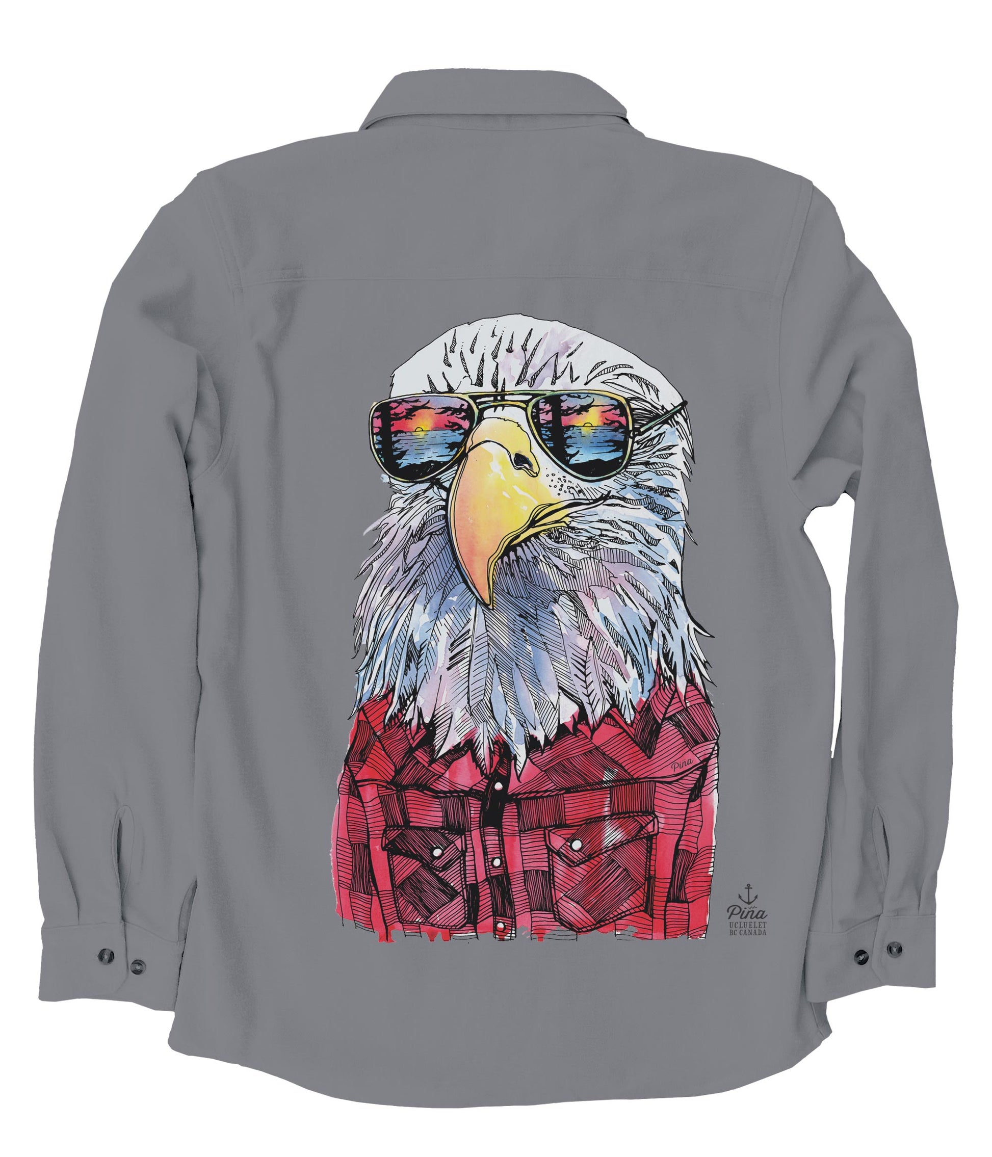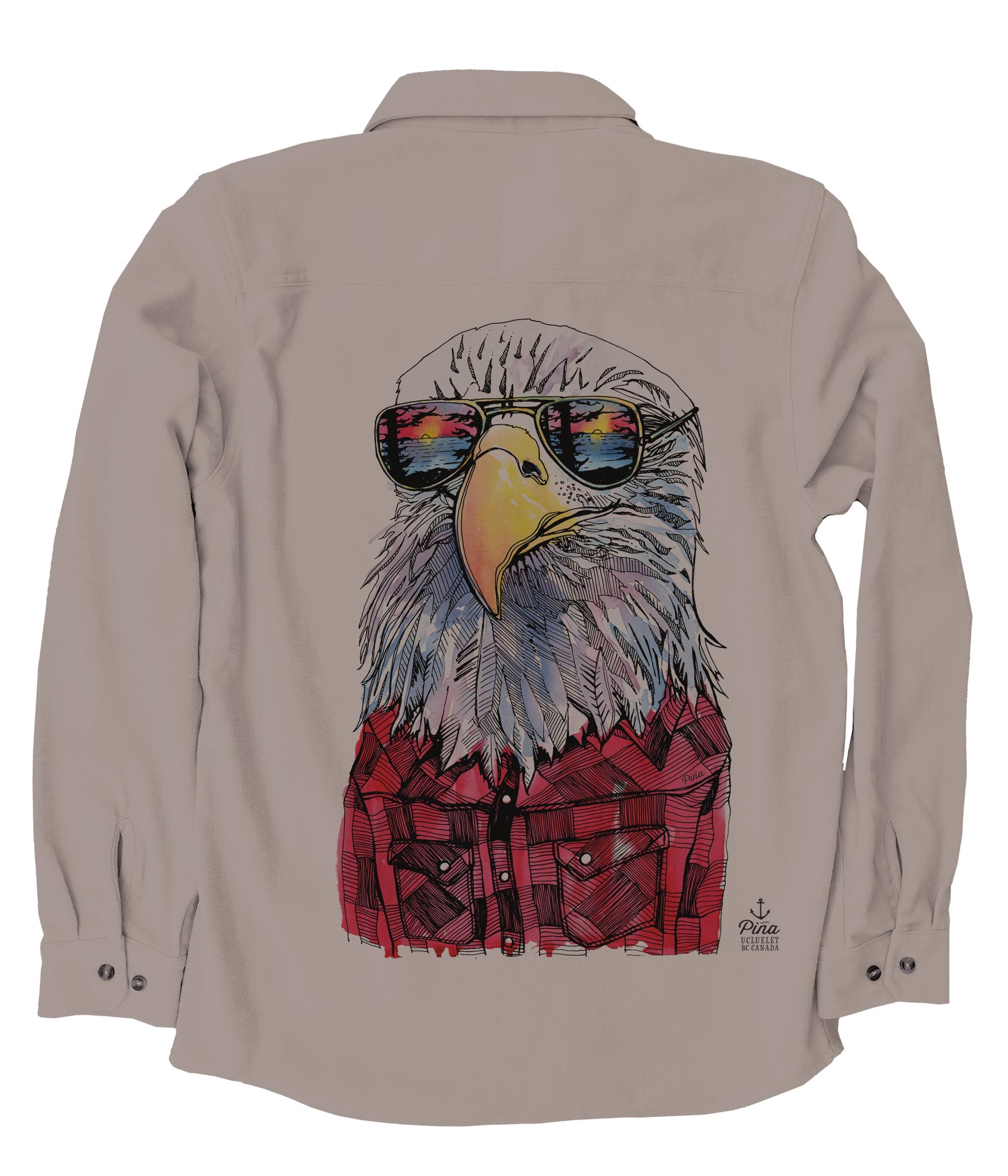 A soft and comfortable unisex flannel printed with our Hipster Eagle design in full colour on the back and a black spruce tree on the front. Our 100% organic cotton flannels are high quality–designed by us and manufactured in small runs in Vancouver.